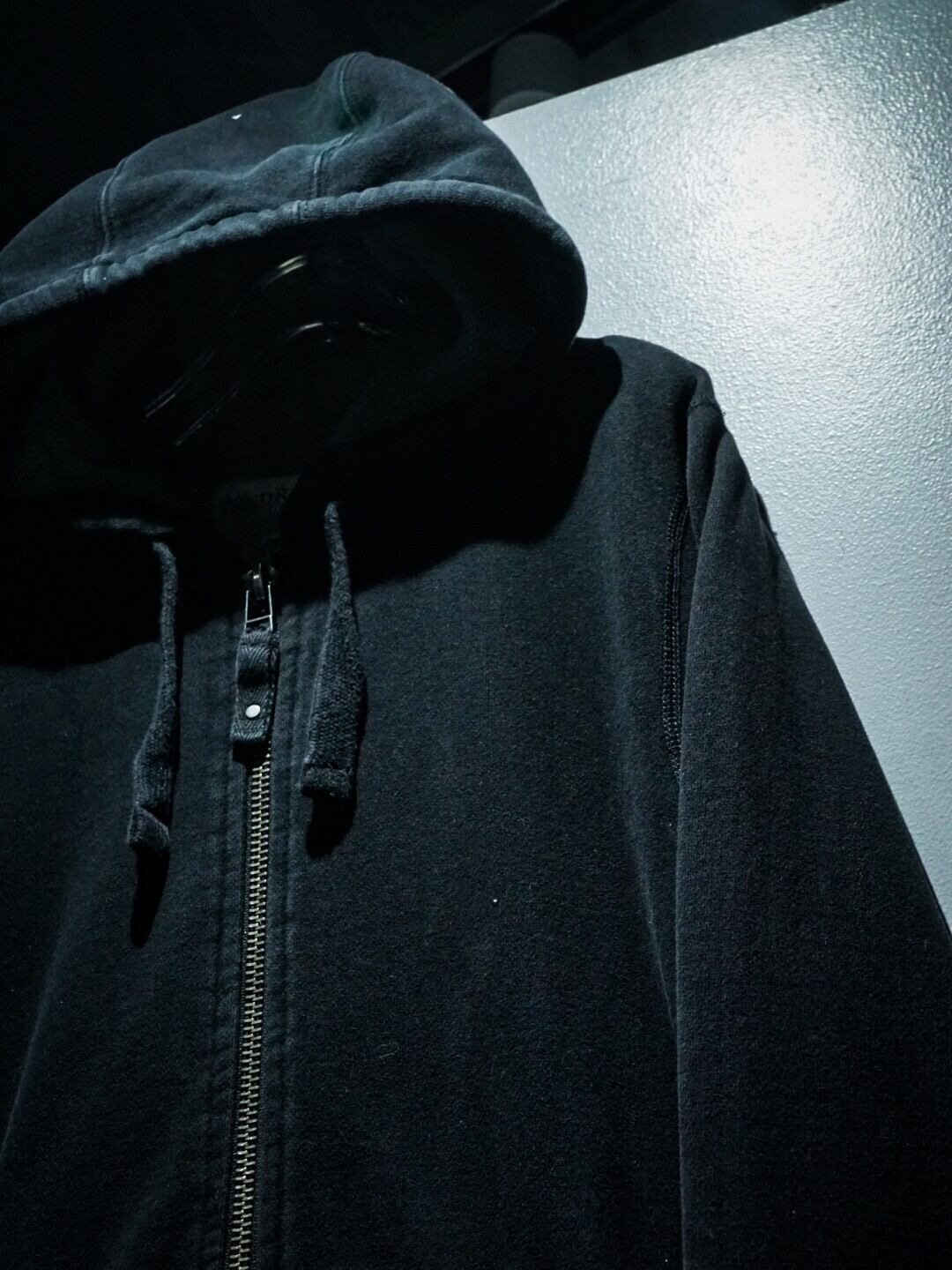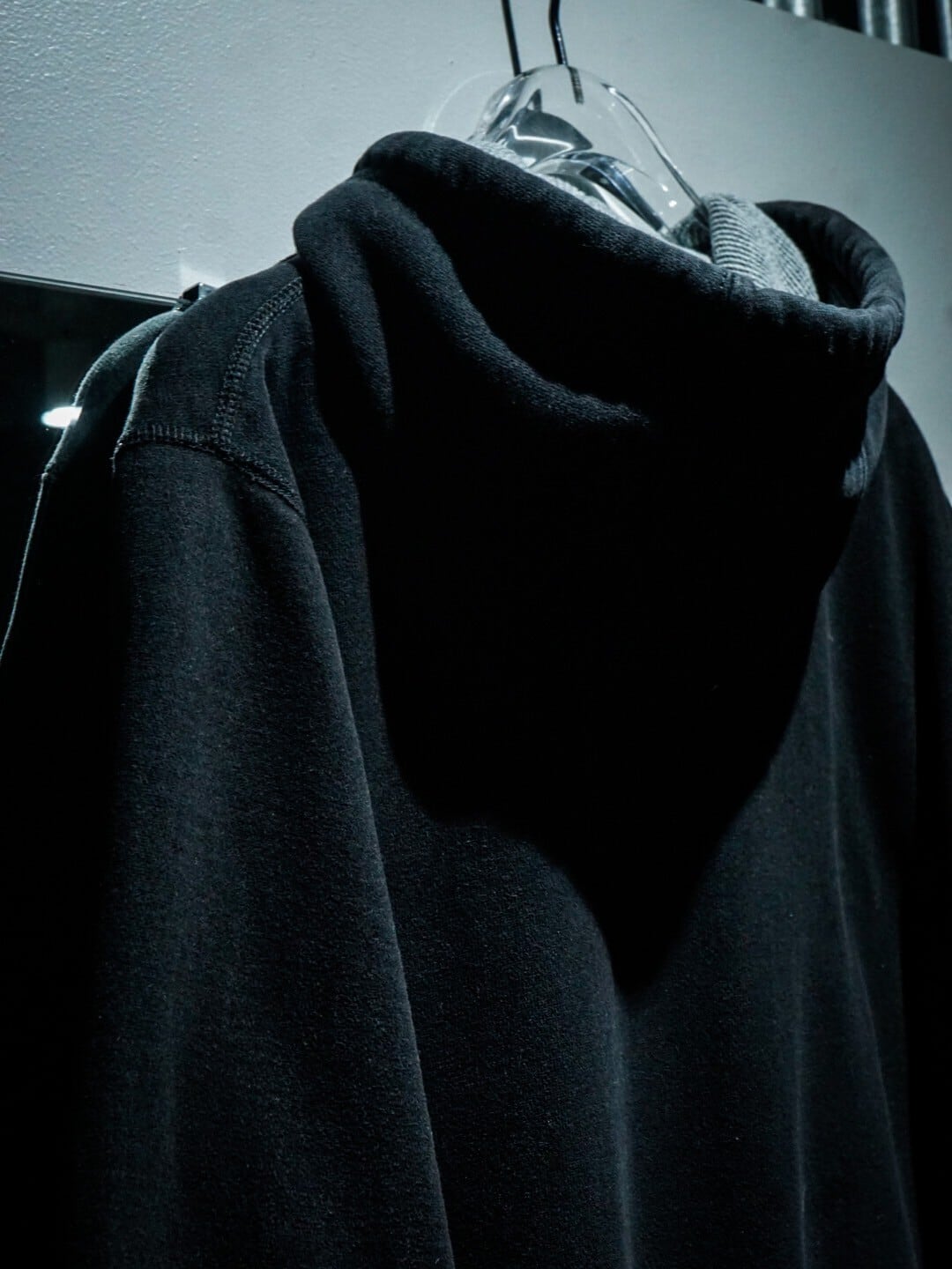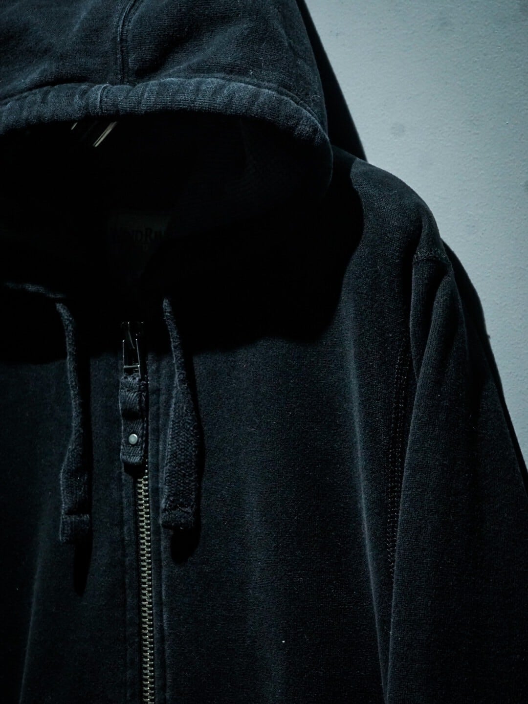 若干のフェードが効いたブラックボディをベースに、ボディサイドにはリブの切り替えを施した短丈ジップアップフーディ。