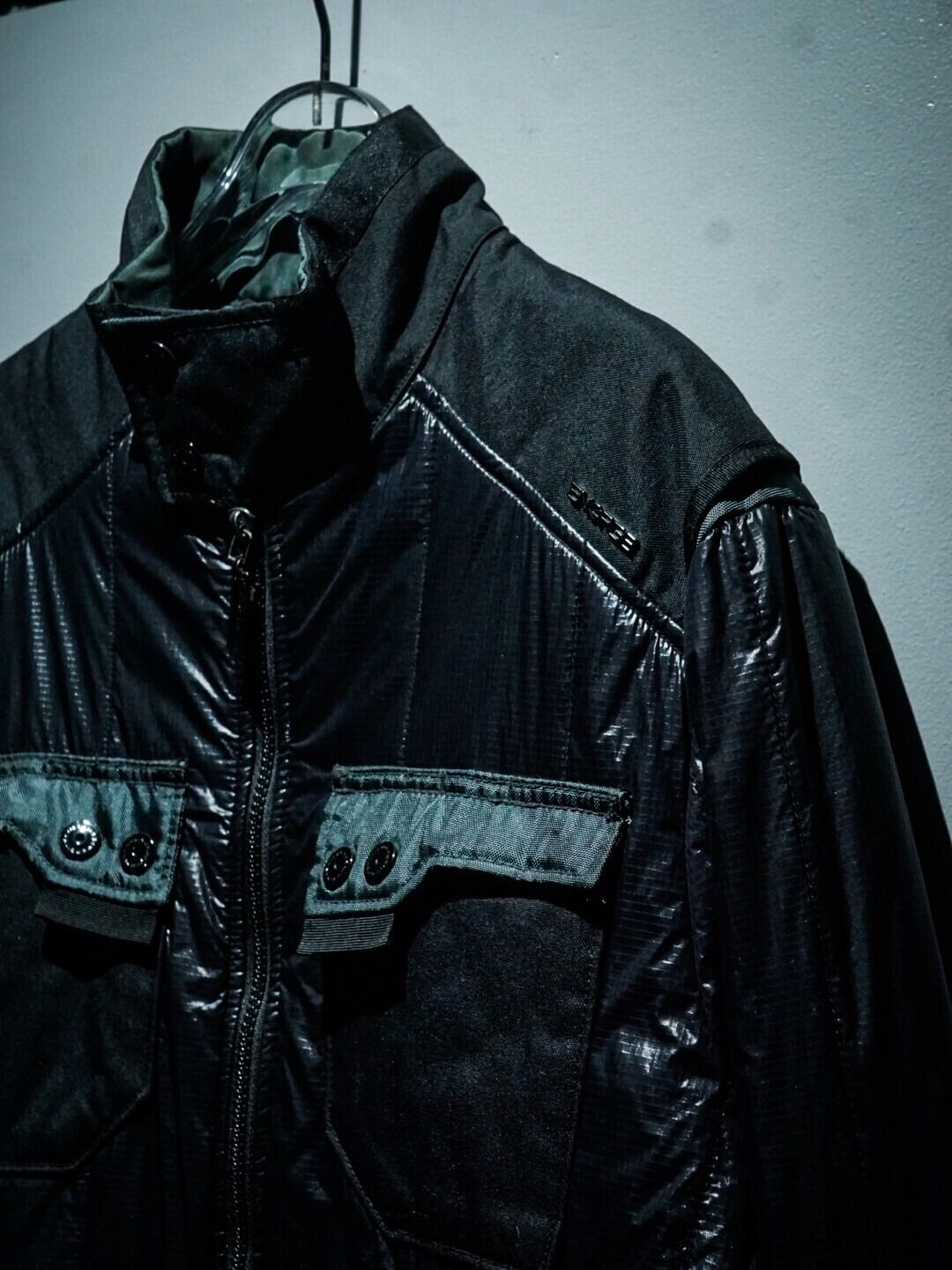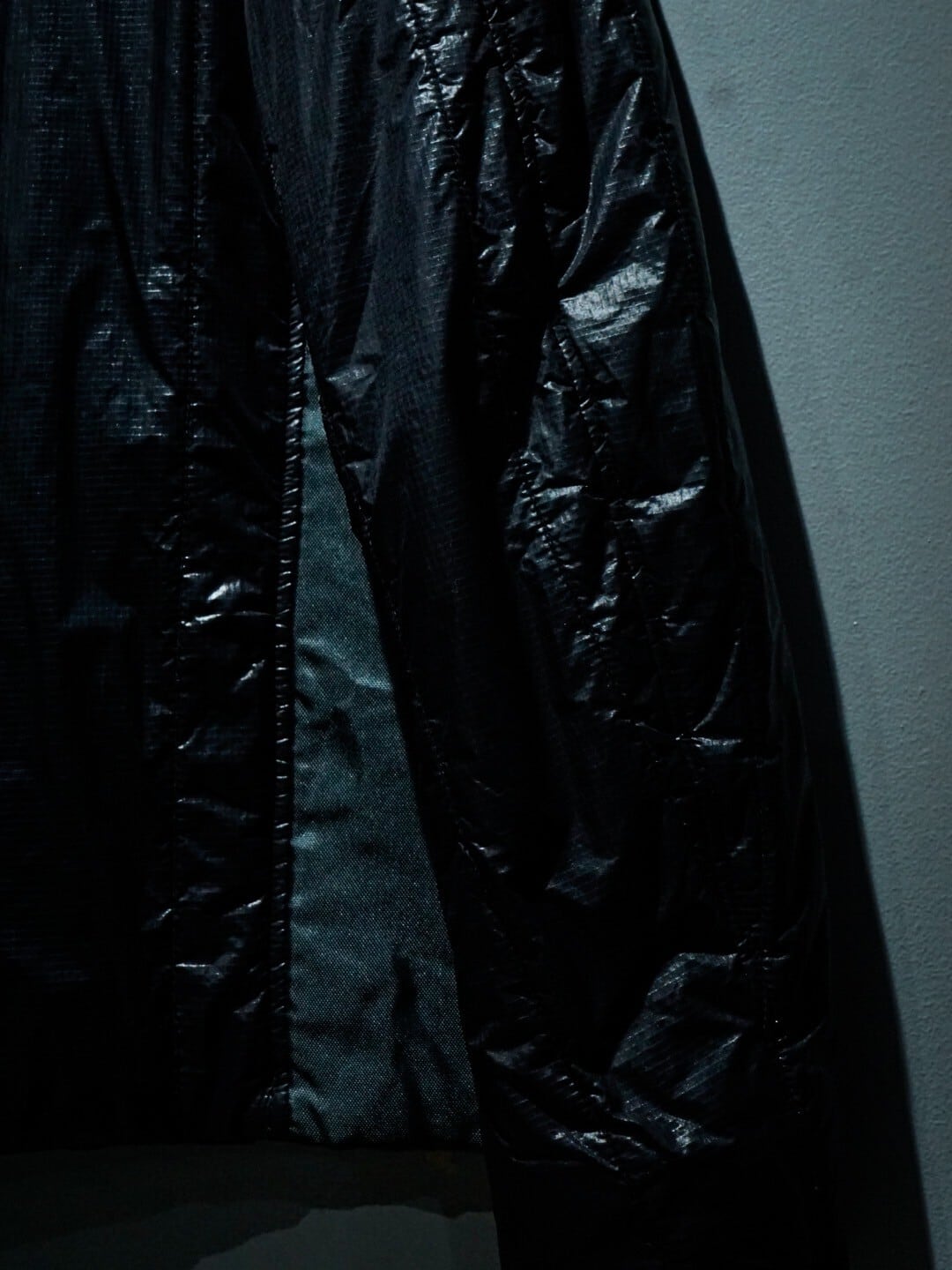 若干のフェードが効いたブラックボディをベースに、ボディサイドにはリブの切り替えを施した短丈ジップアップフーディ。
