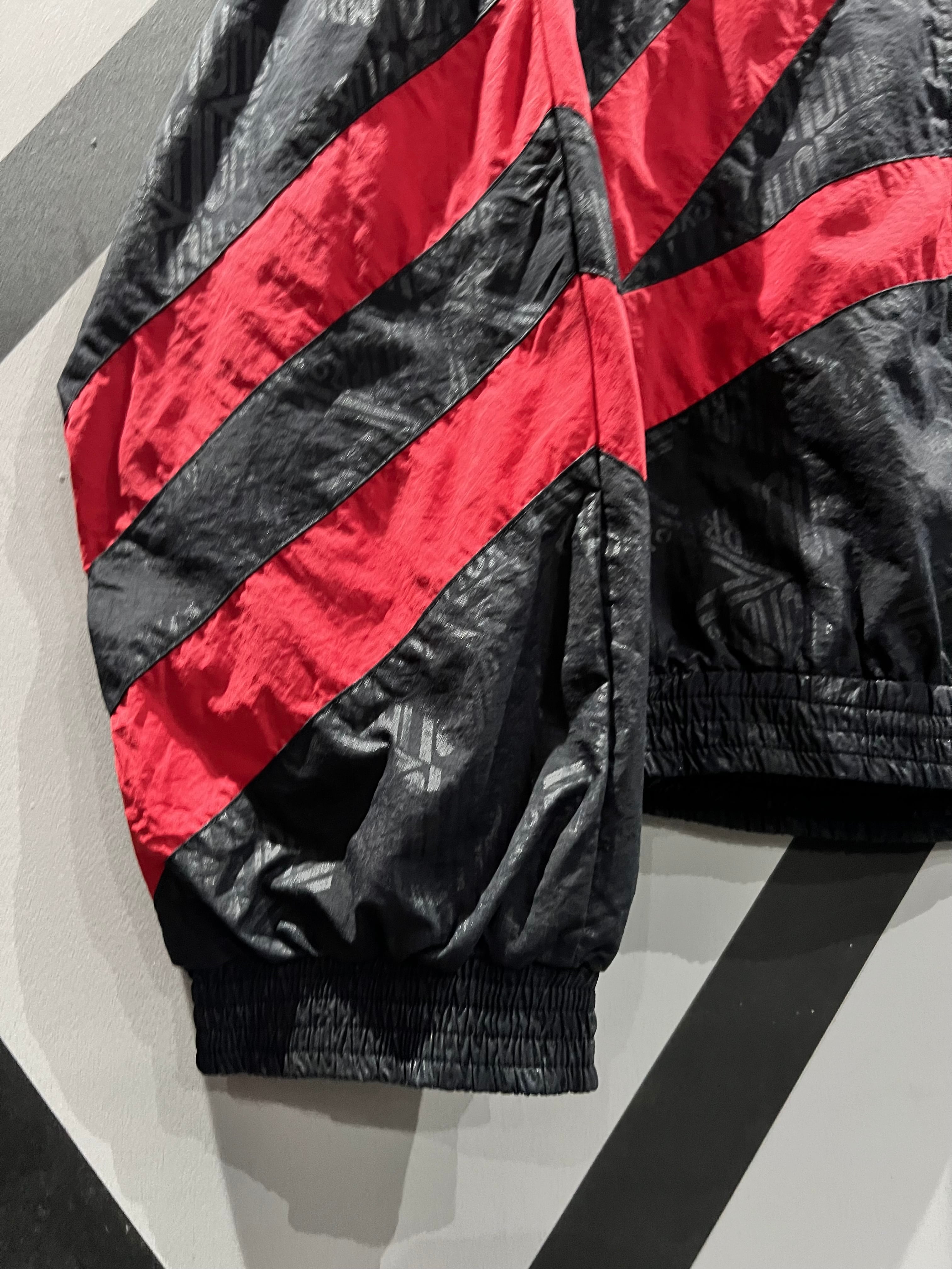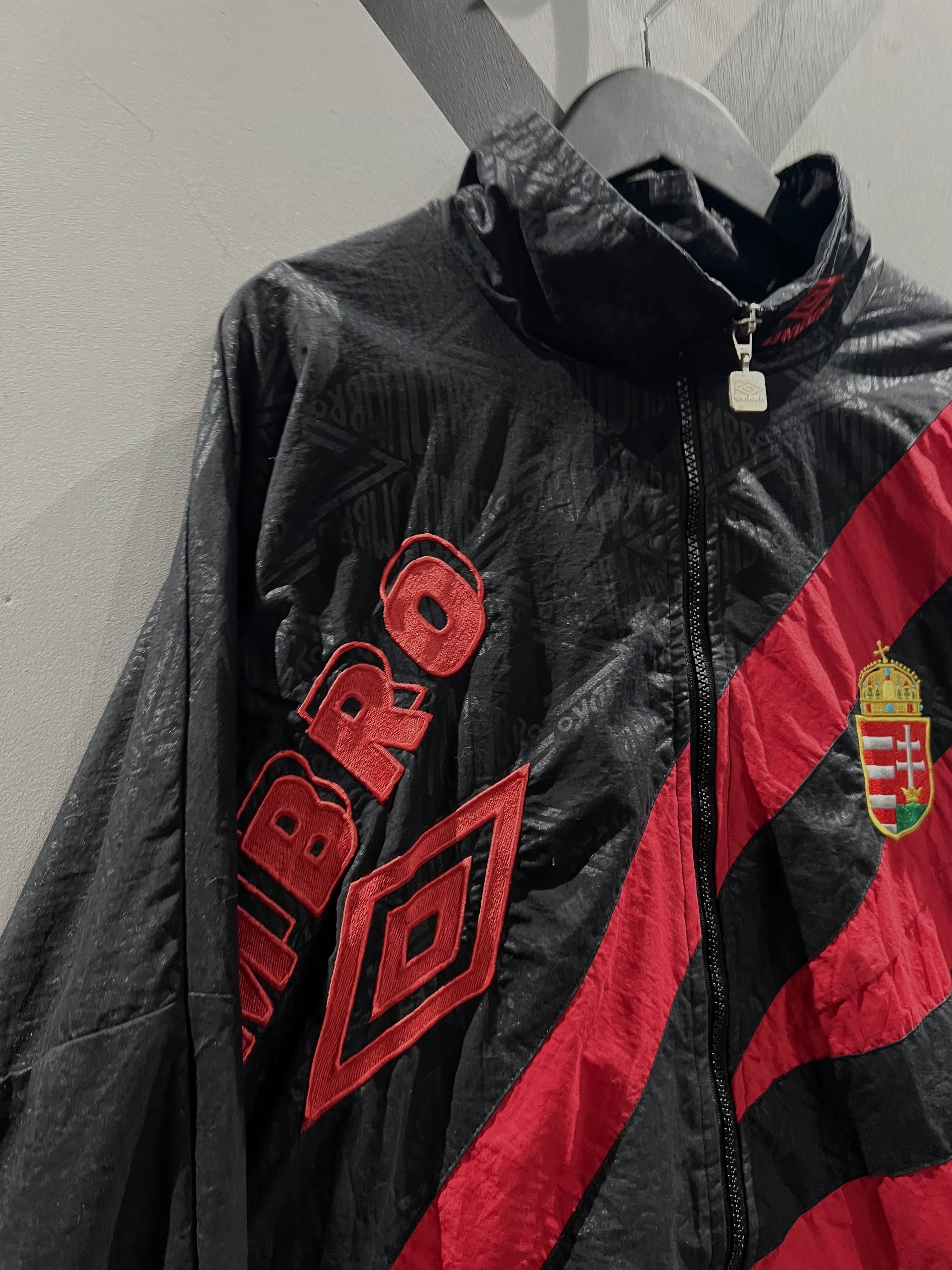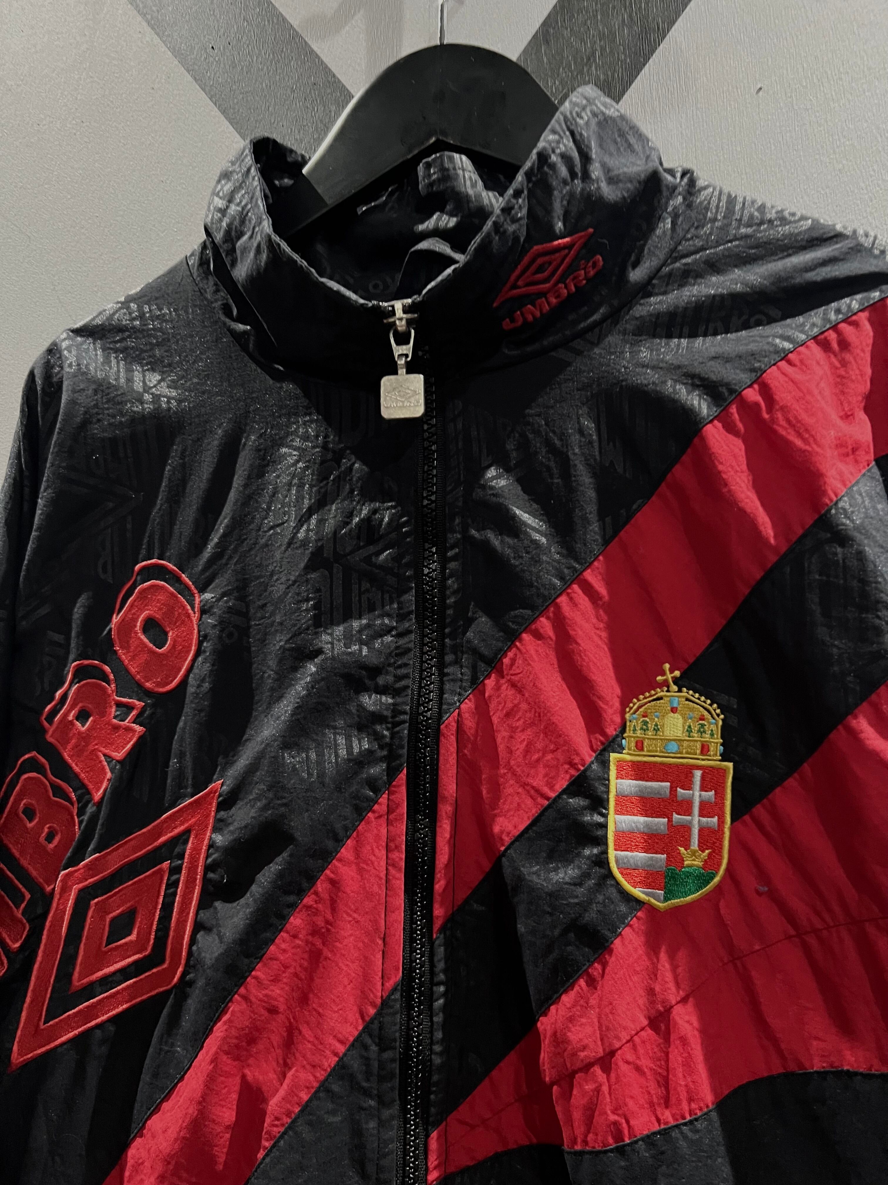 赤×黒のカラーリングをベースとしたナイロン素材のボディに、ハンガリー代表のワッペンを施したトラックジャケット。
