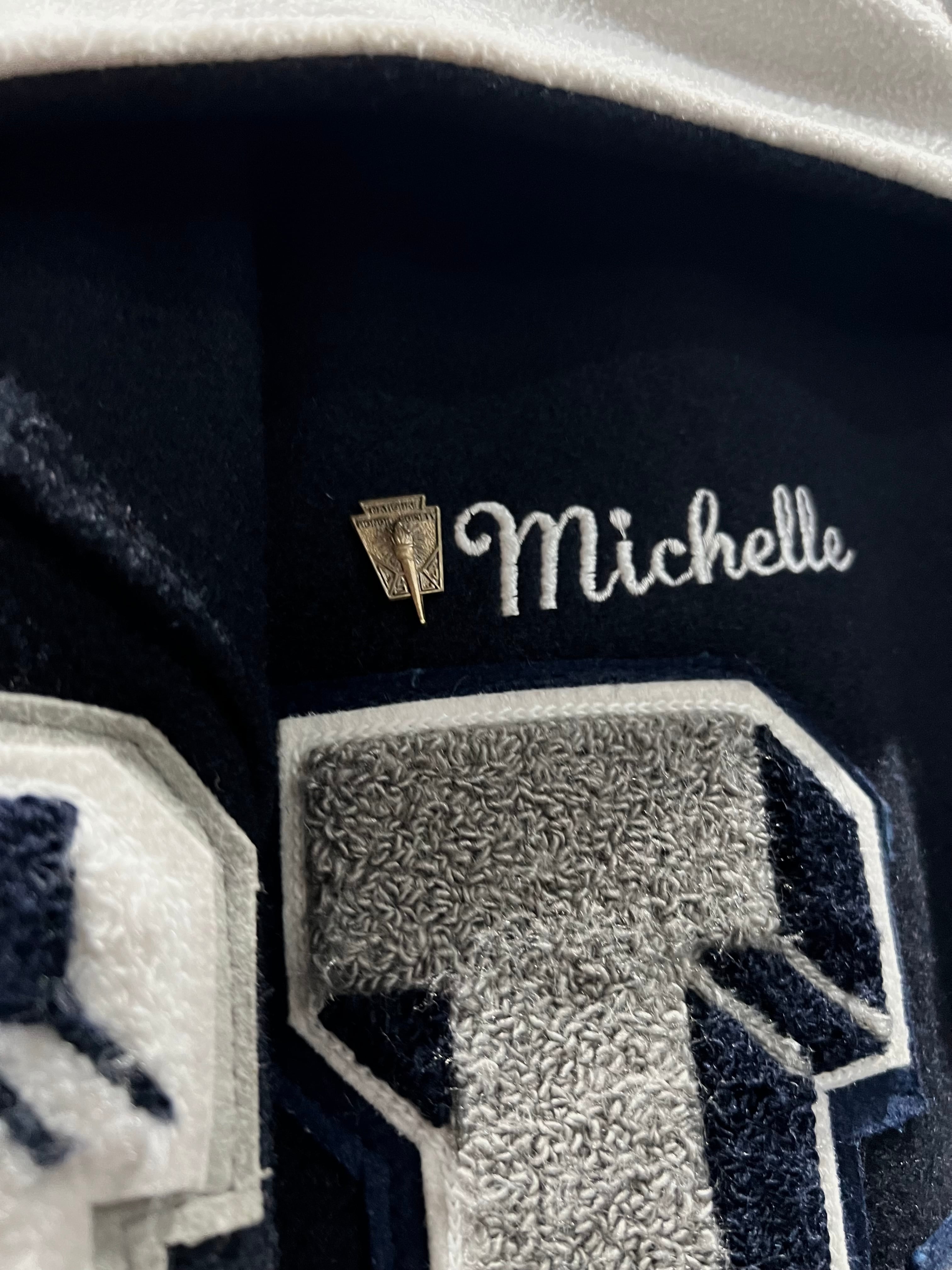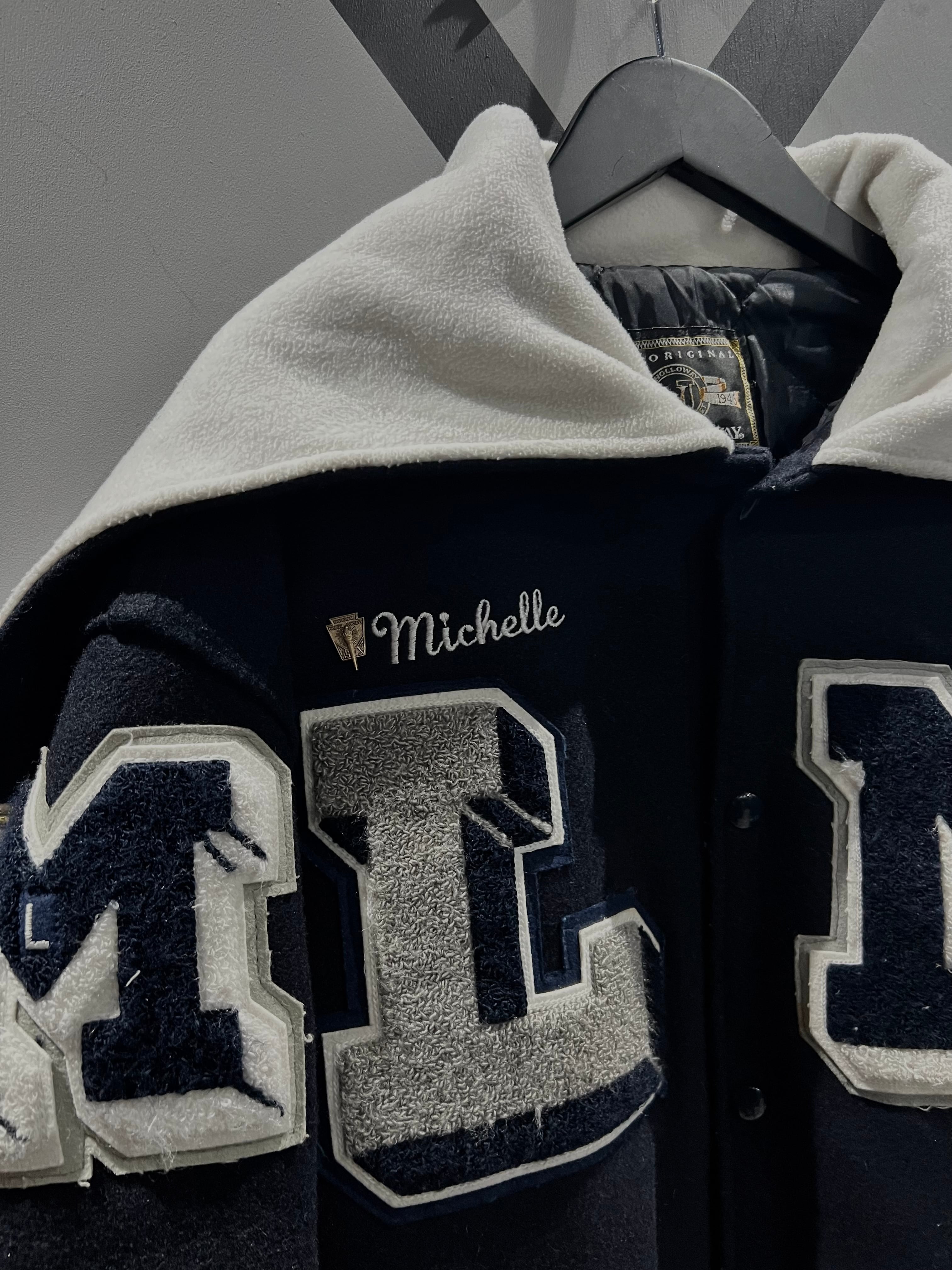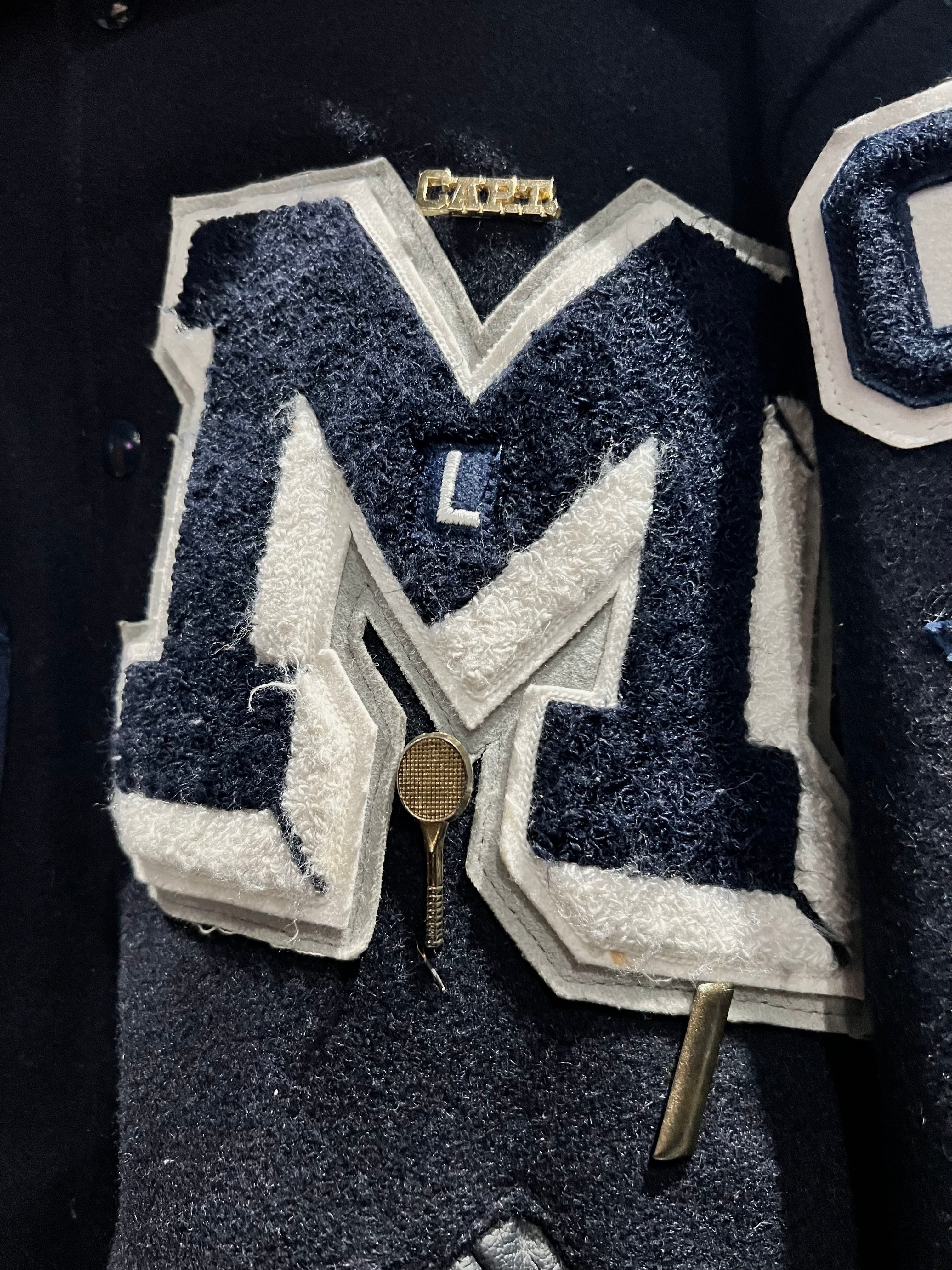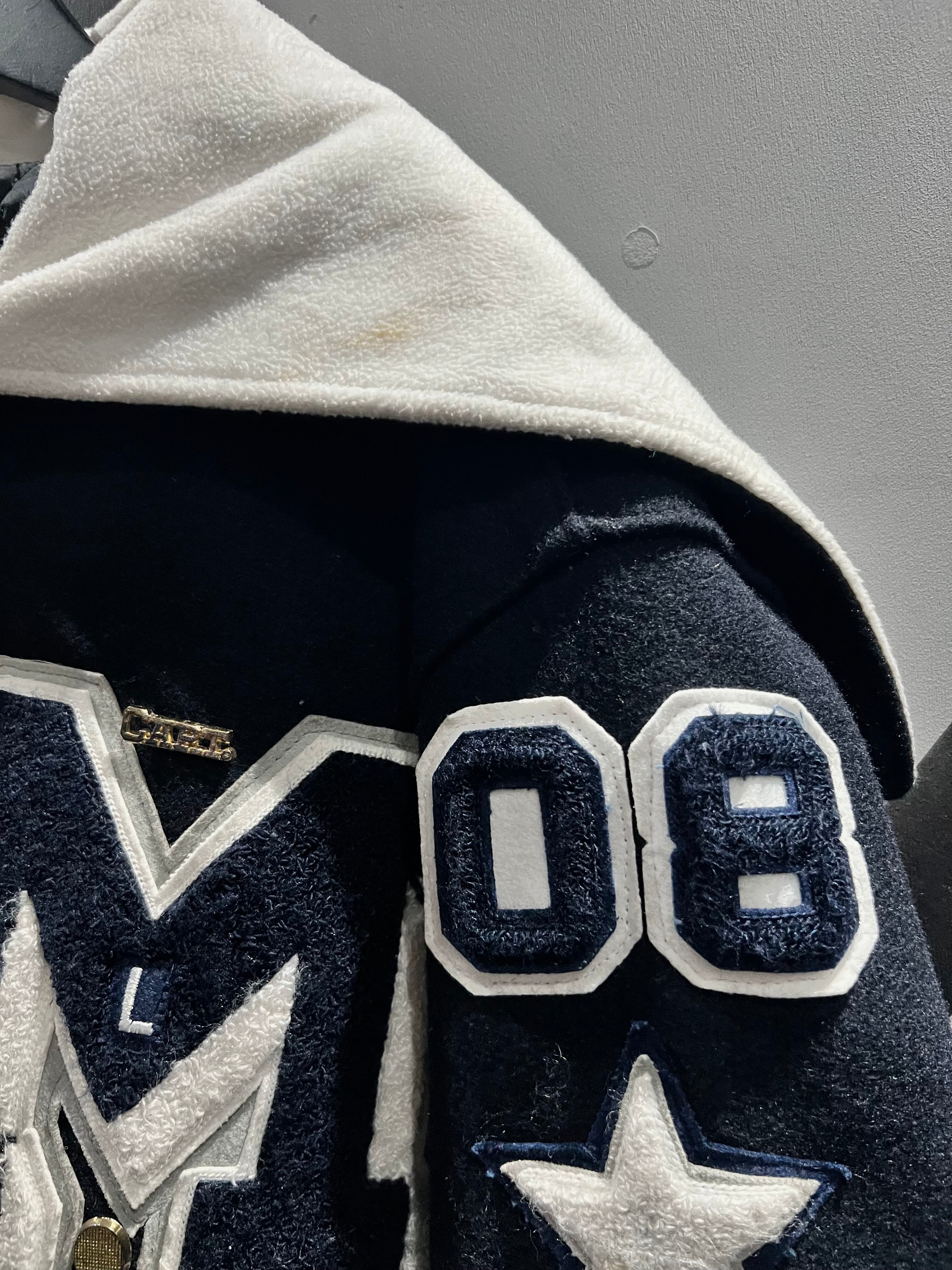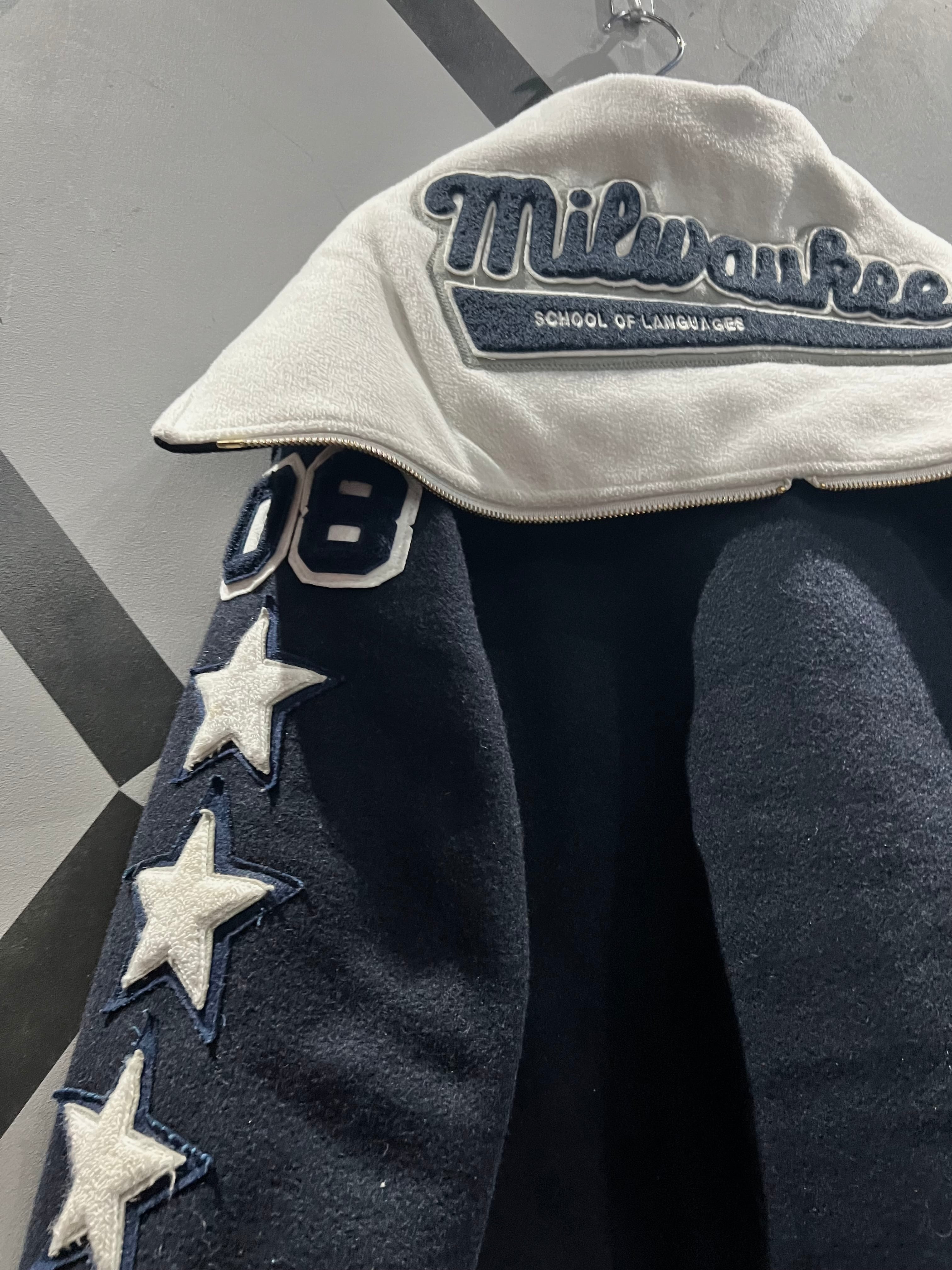 上質なメルトン素材を用いた、程良い霞みの効いたネイビーのボディに、レタードワッペンや星のワッペンを施したスタジャン。
