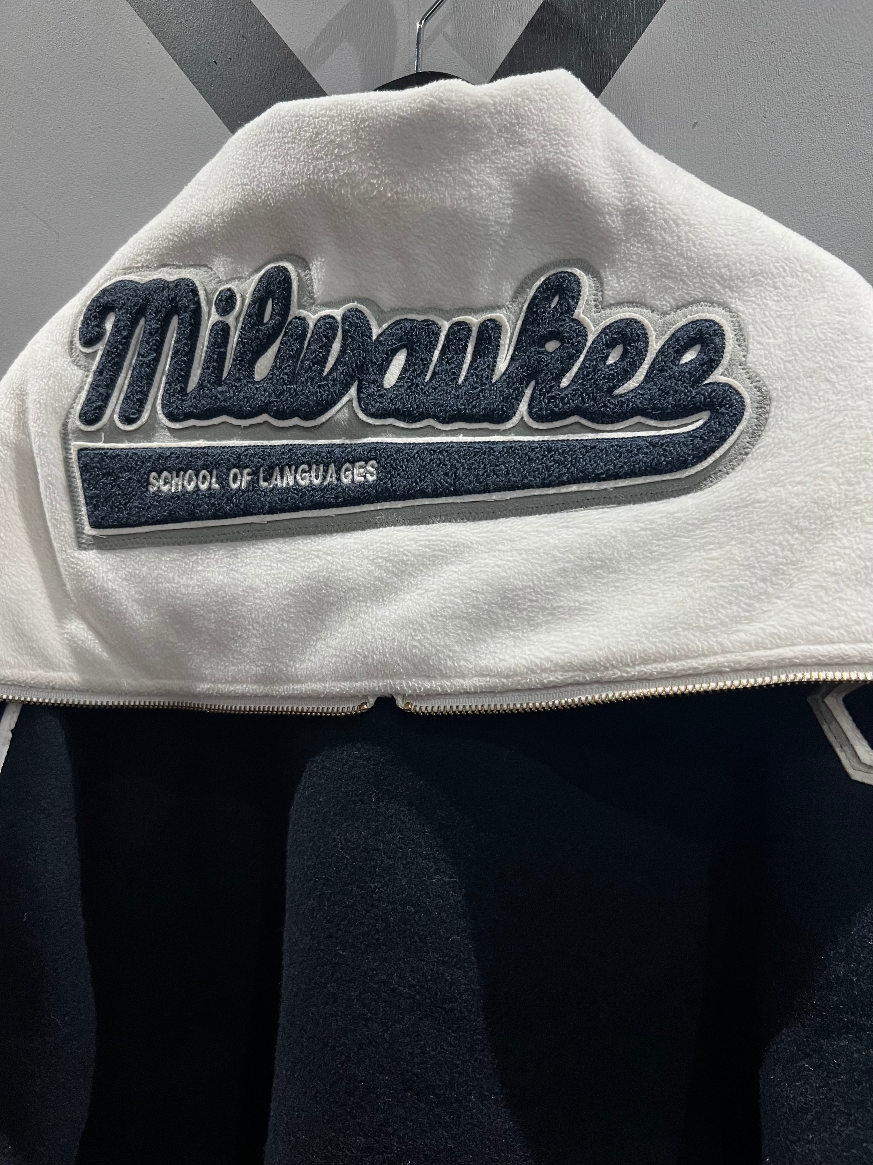 前述の通りフードのセンタージップを開くことでセーラーカラーになるギミック付き。他スタジャンとは一線を画すデザイン性の高い1着になっています。