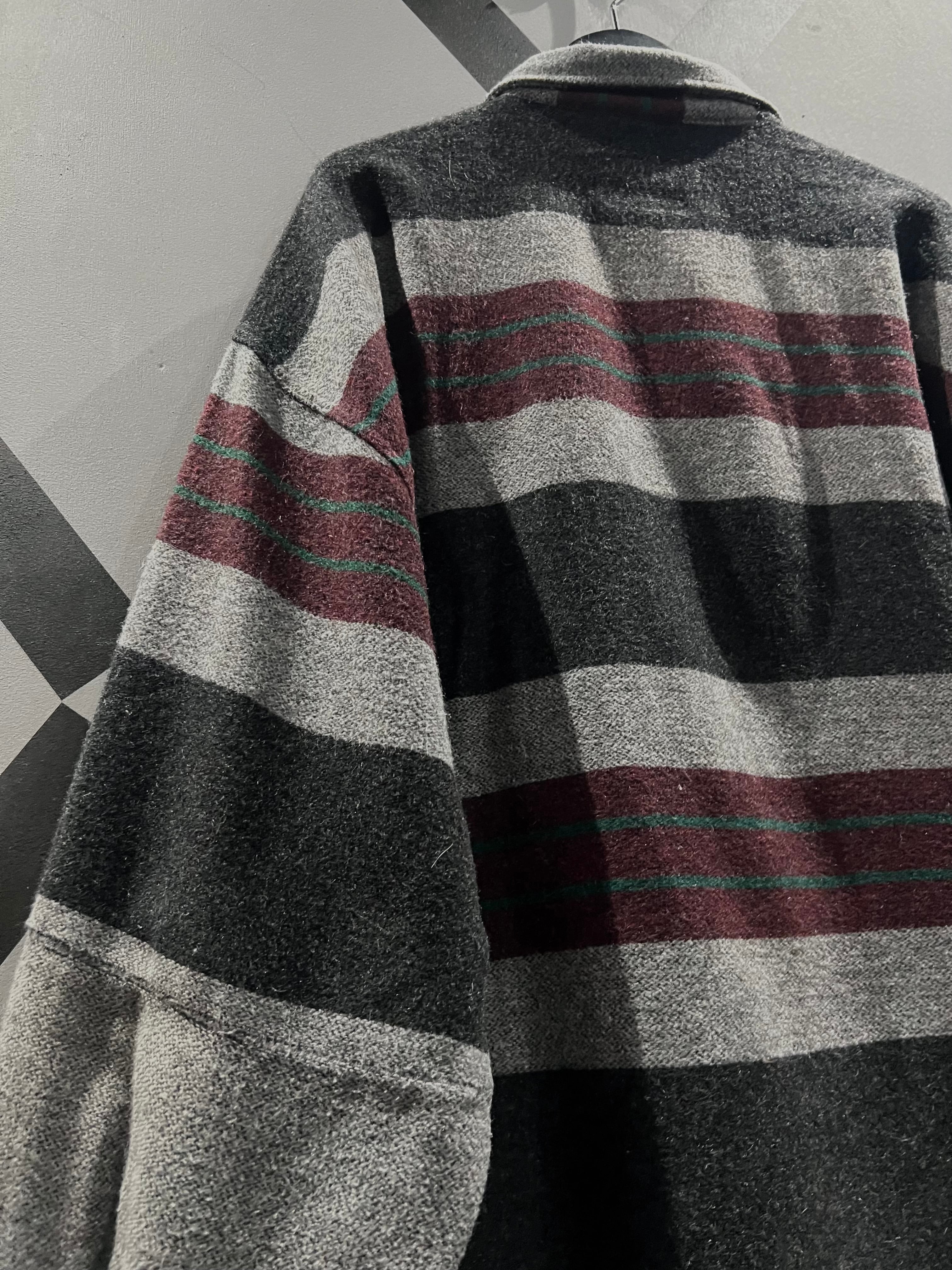 ウール素材を用いて、グレーをベースに黒、赤と緑のストライプの切り替えを施したウールジャケット。