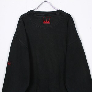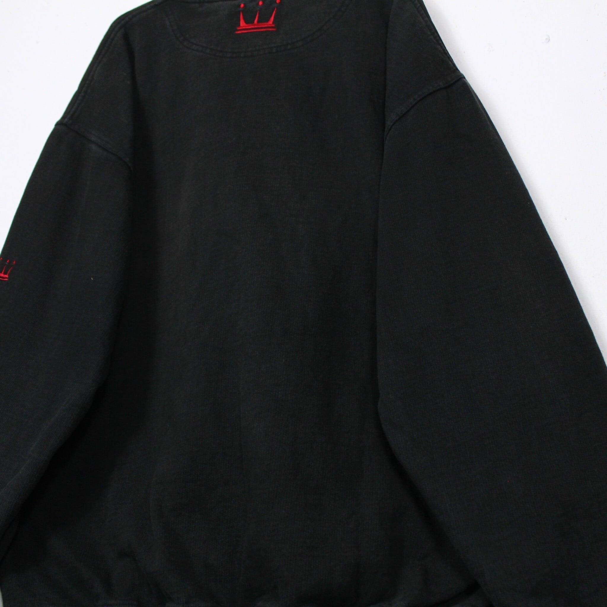 ガシッとハリのある、若干のフェード感のあるブラックのボディをベースに、フロントにブランドロゴパッチ、クラウンの刺繍を刻んだスウェット。