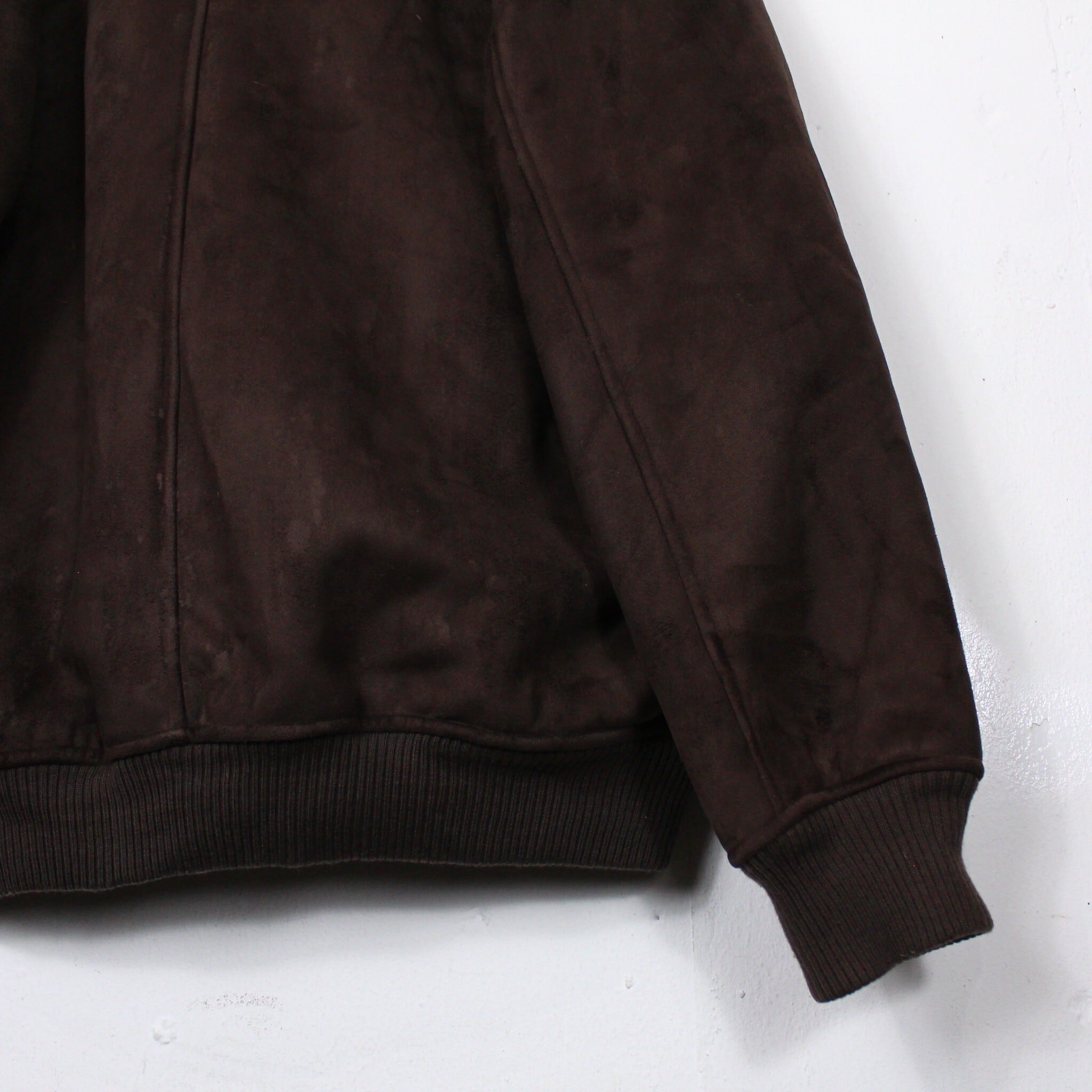 しっとりとした肌触りのフェイクのブラウンムートンレザーに包まれたジップアップジャケット。