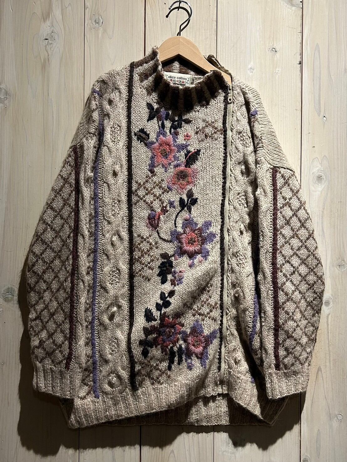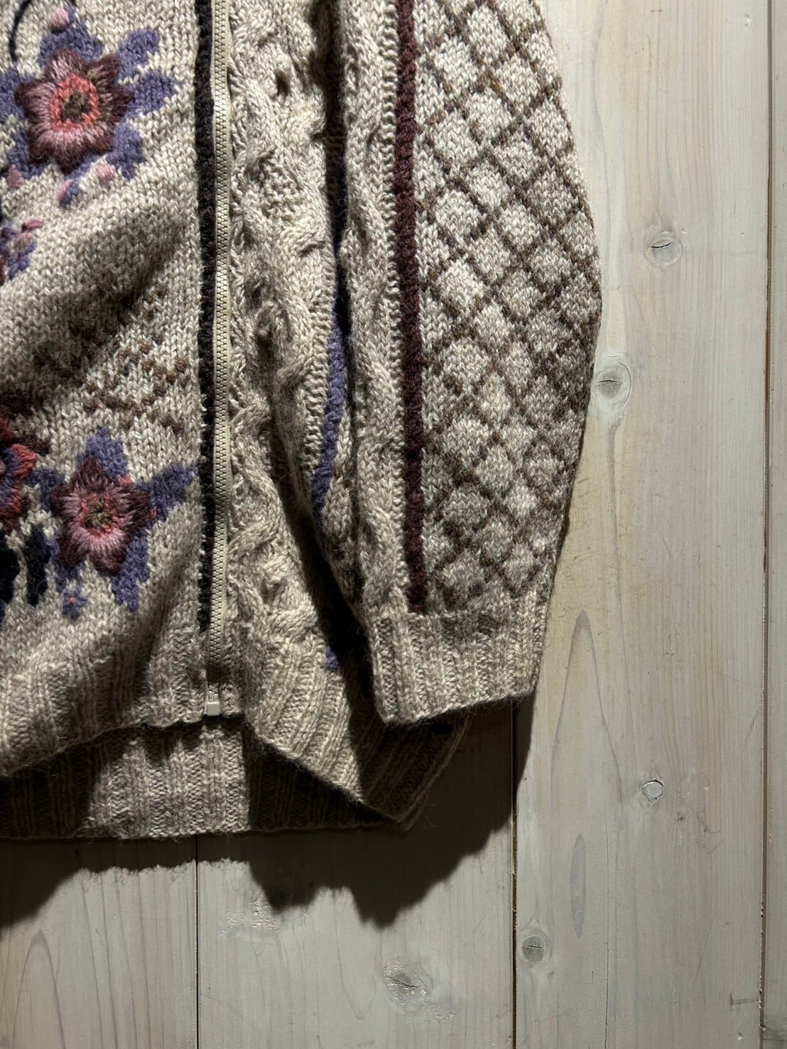 アイボリーのボディをベースに、上質なニッティングでケーブルニット、レトロな花を表現した稀有なニットジャケット。