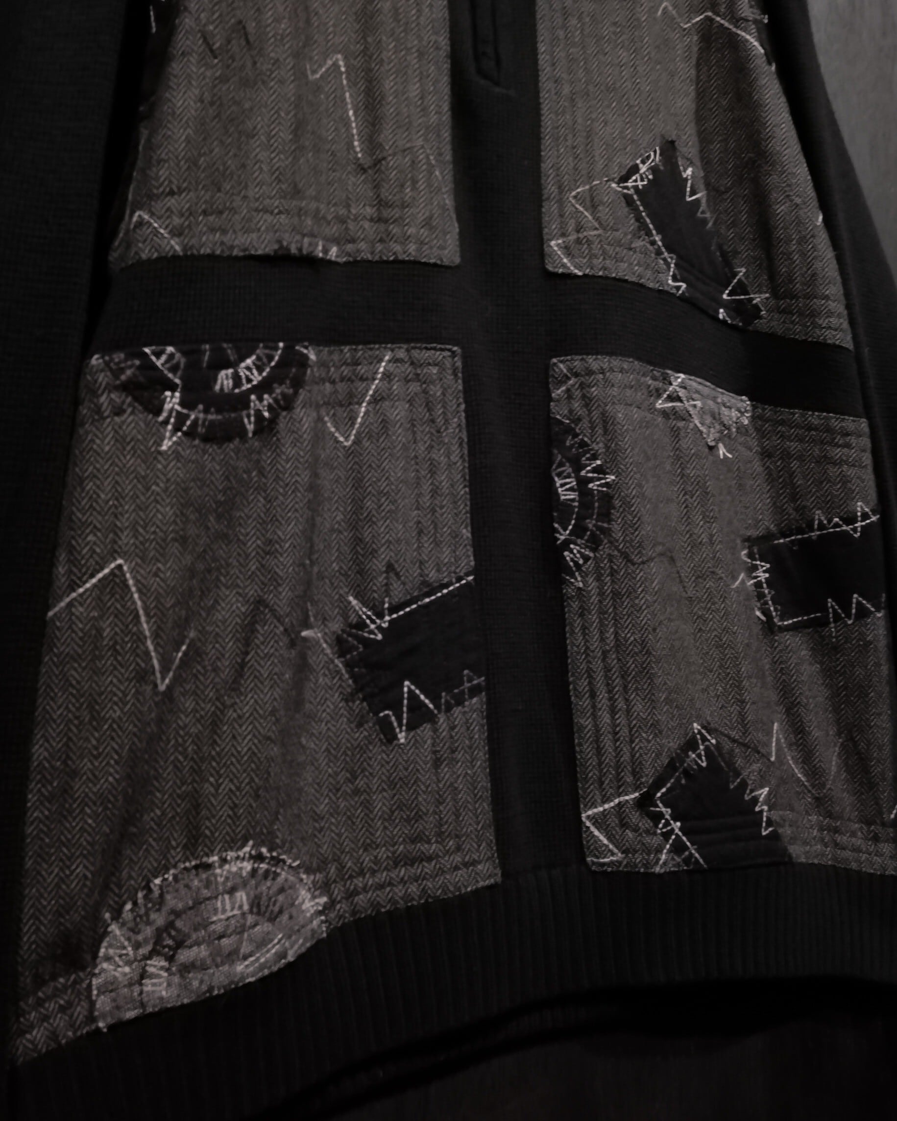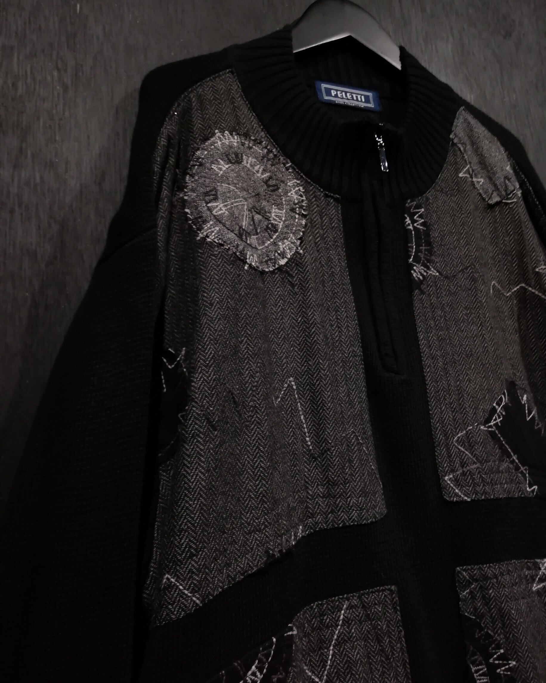 柔らかなブラックのニット素材をベースに、前身頃にヘリンボーンの生地を切り替え、パッチやステッチでデザインを施したドライバーズニット。