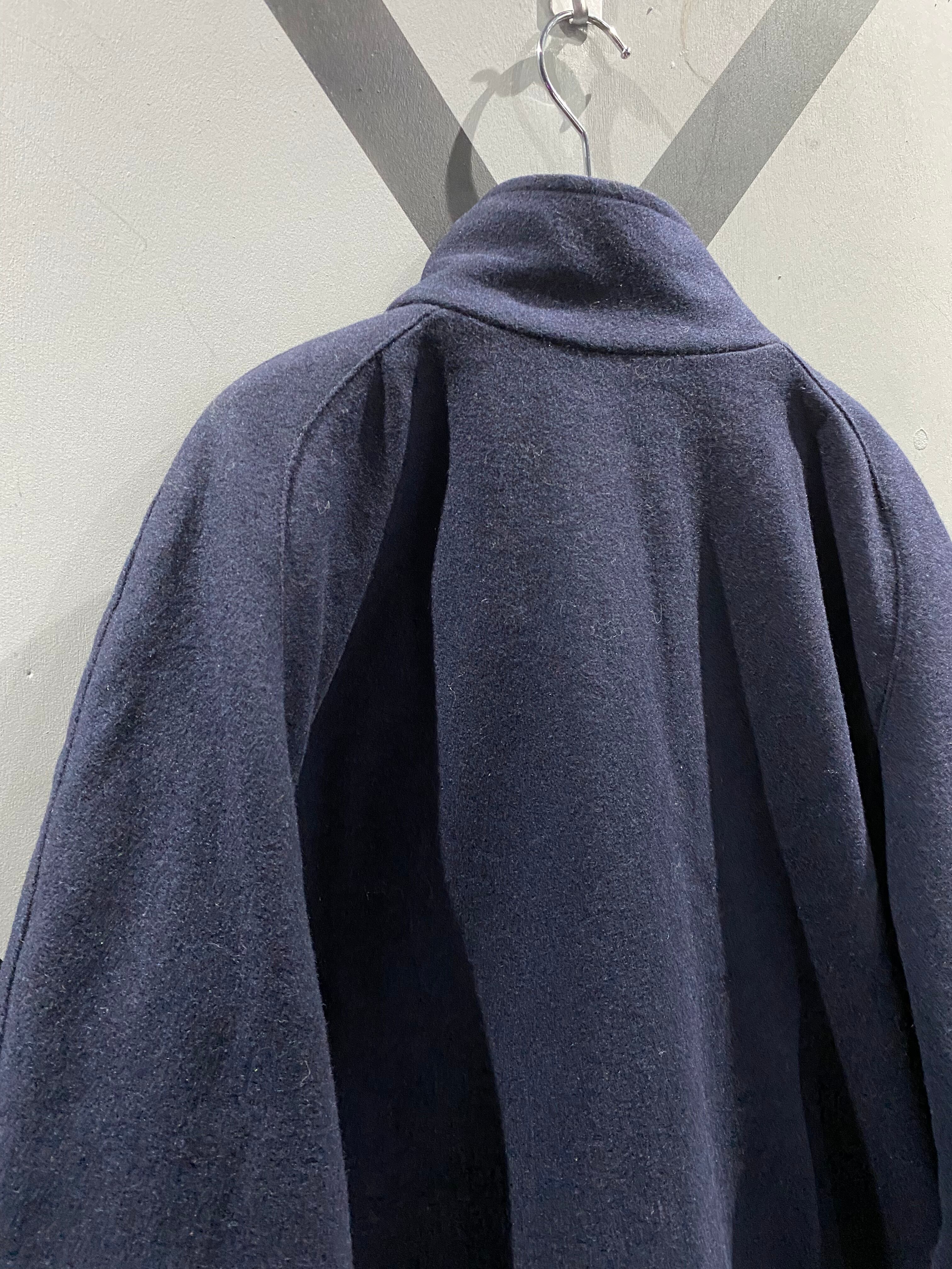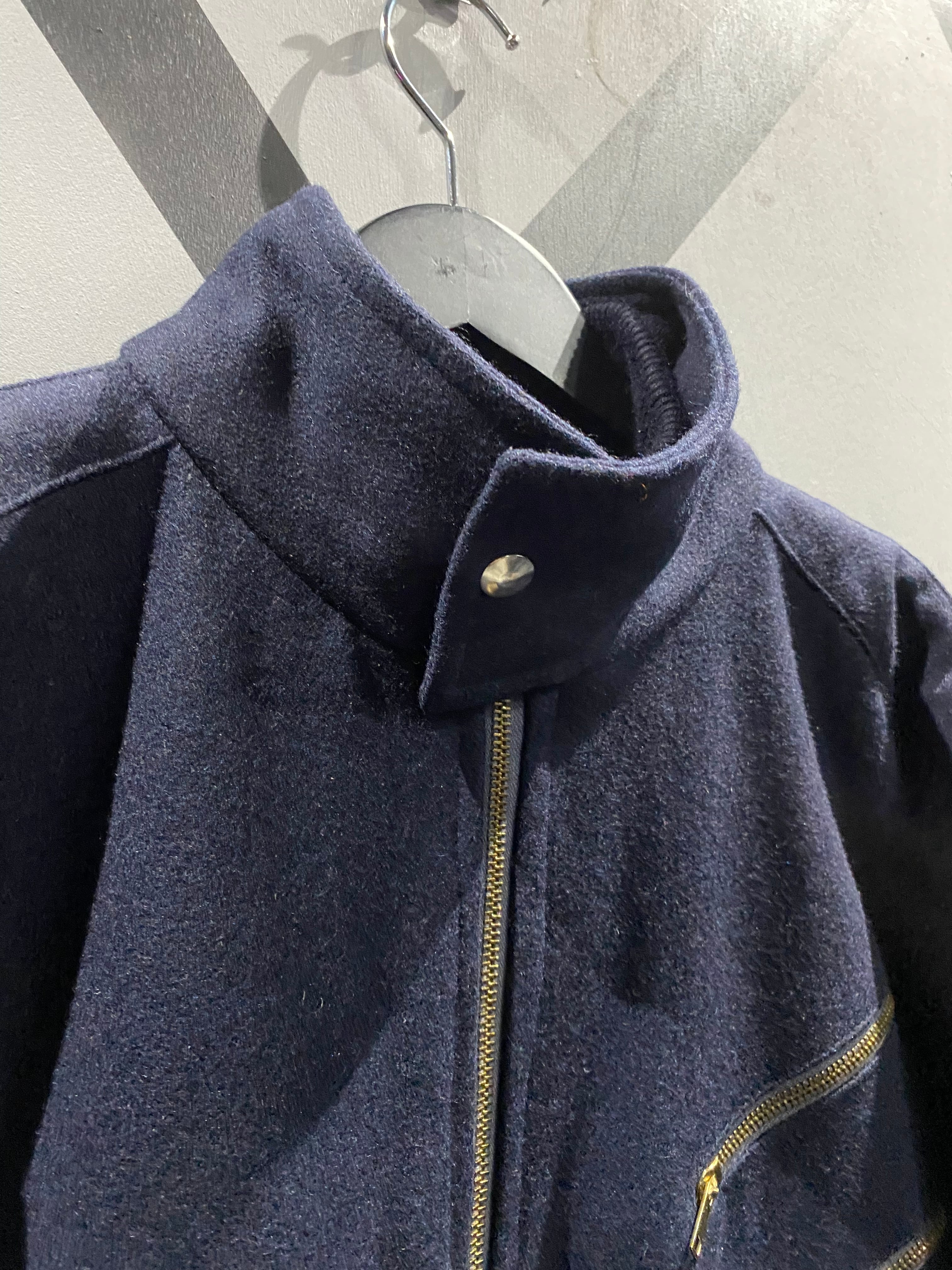 肌触りの柔らかなネイビーのウールのボディをベースに、左胸には斜めにジップポケットを施したブルゾンジャケット。