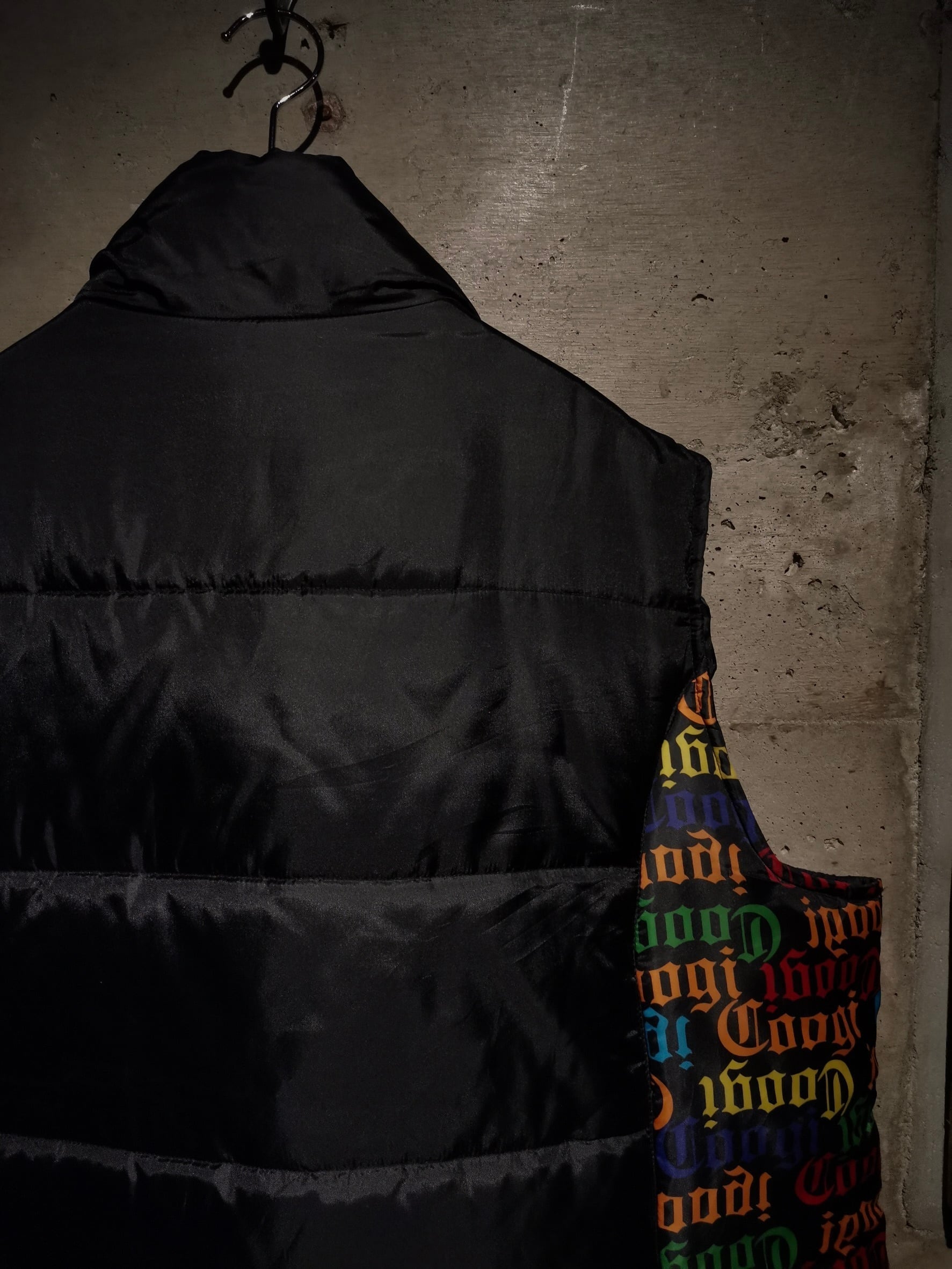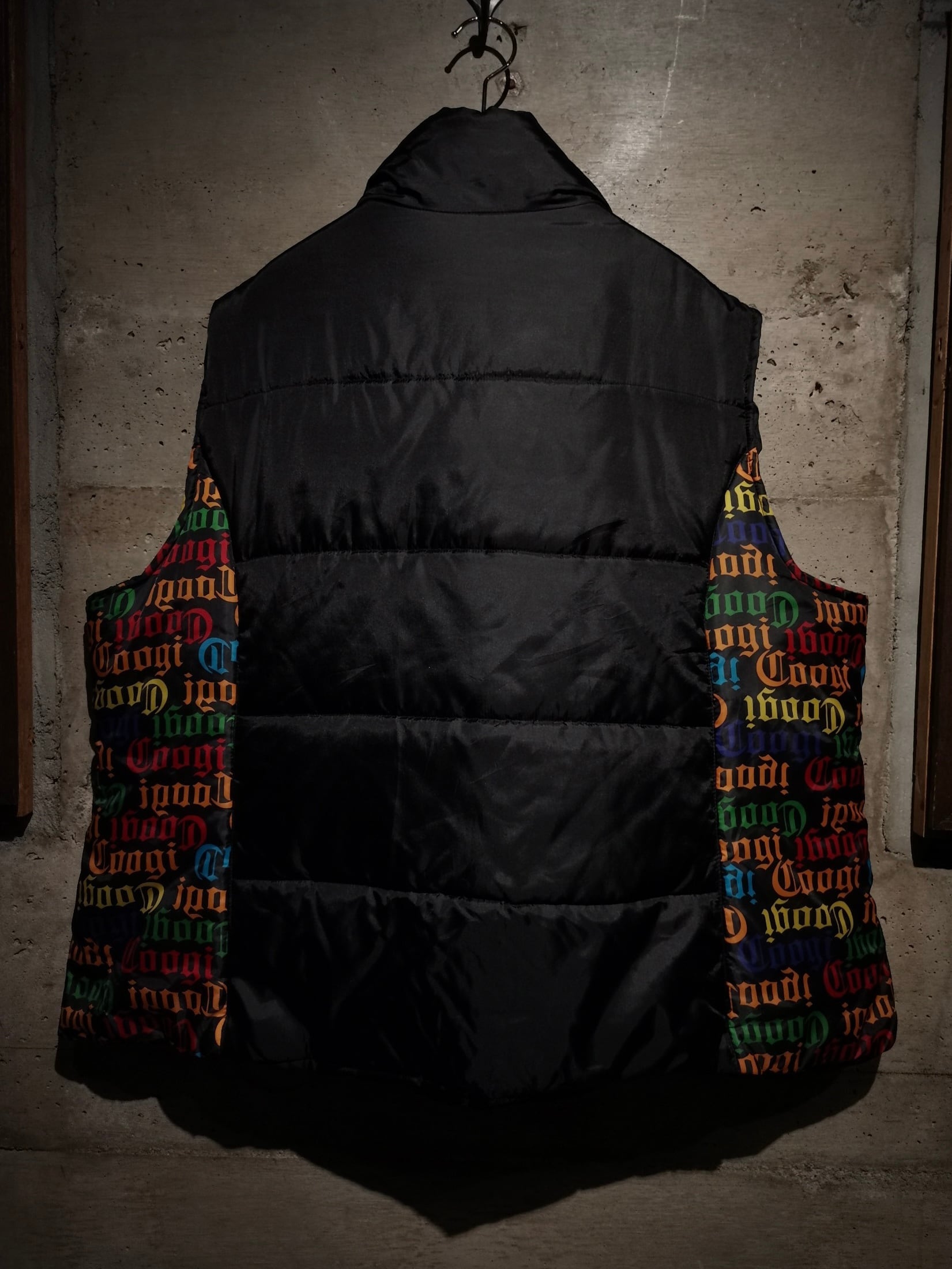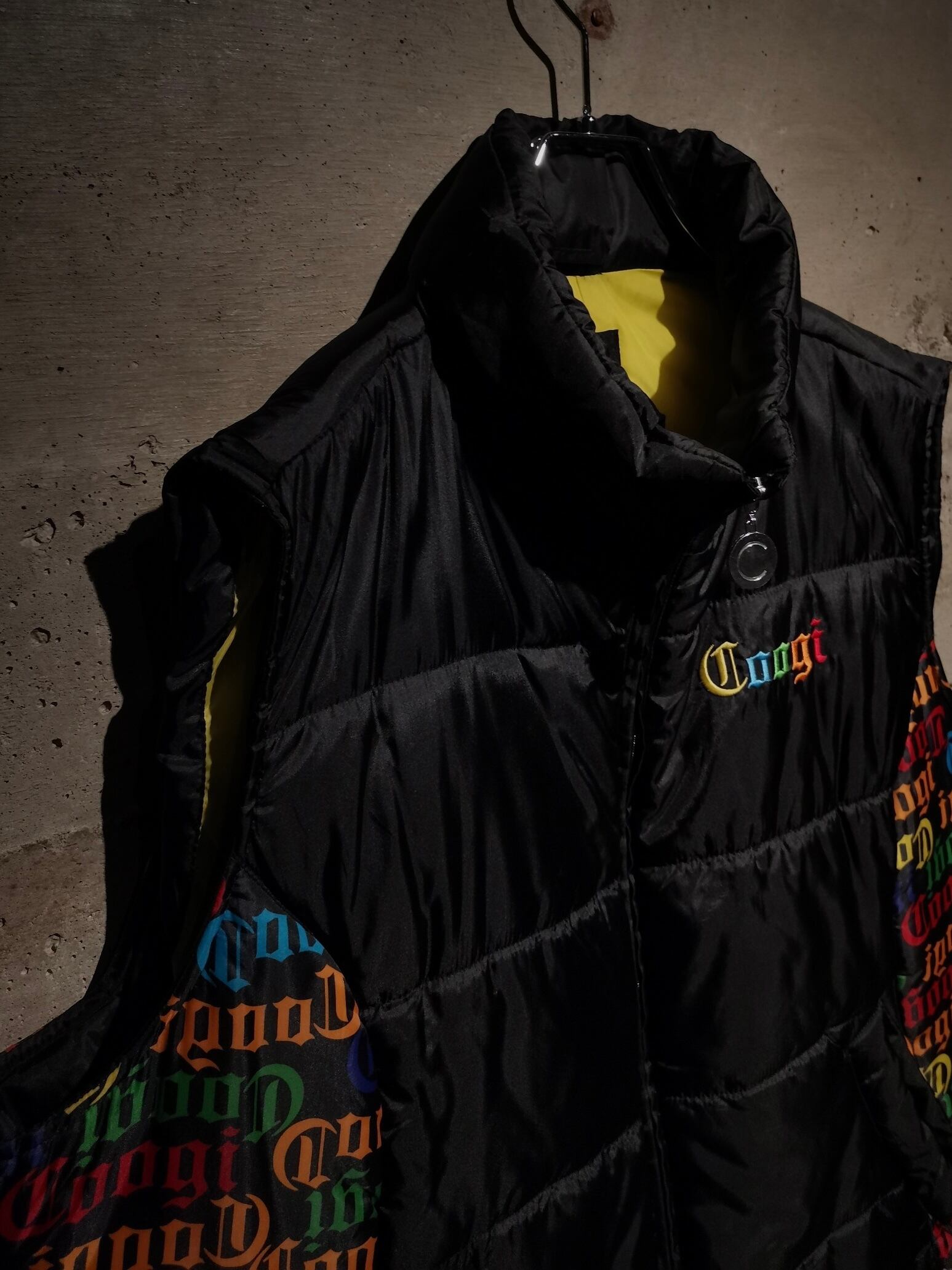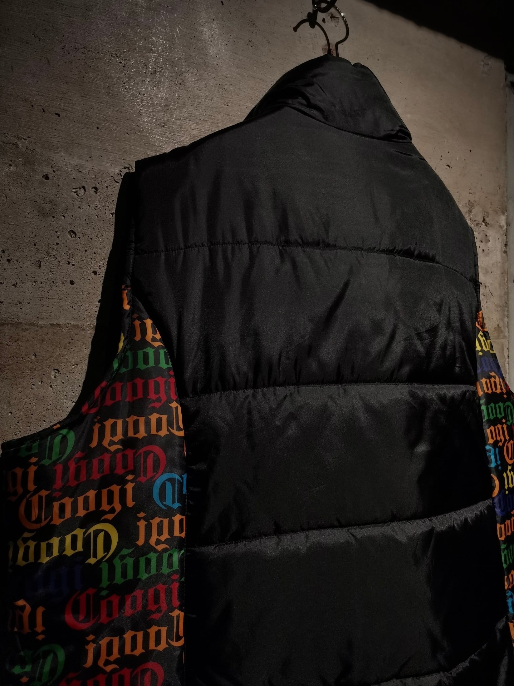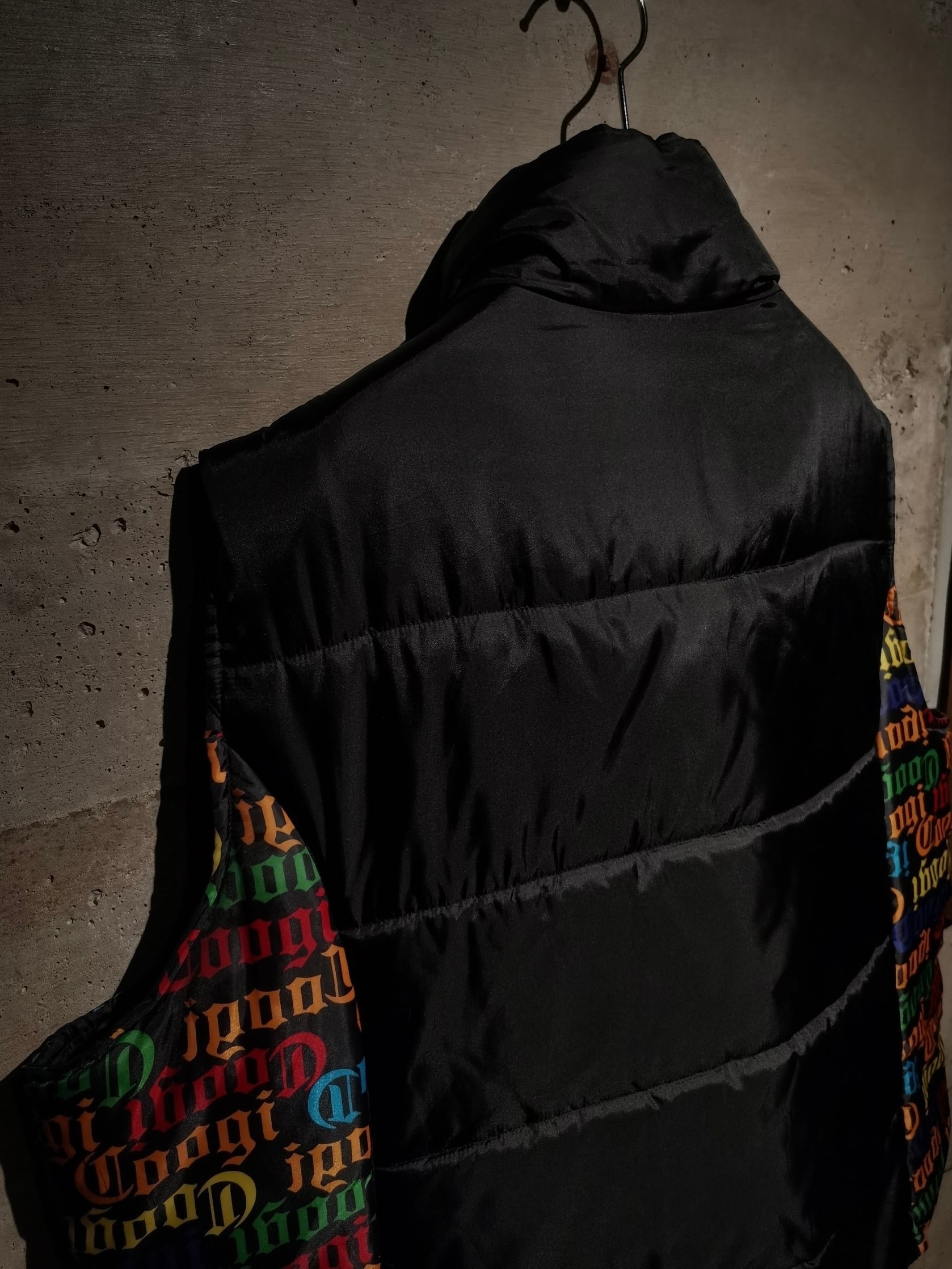 微光沢を放つブラックのボディをベースに、ボディサイドにはブランドネームを散りばめ切り替えたパデットベスト。