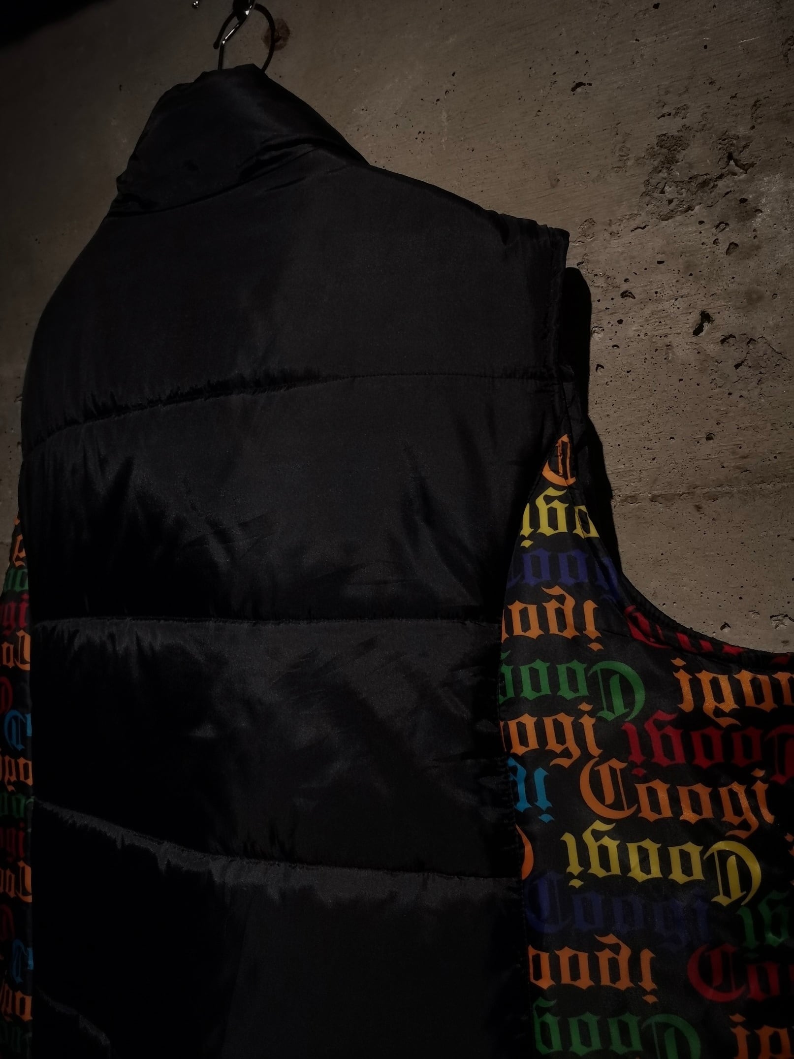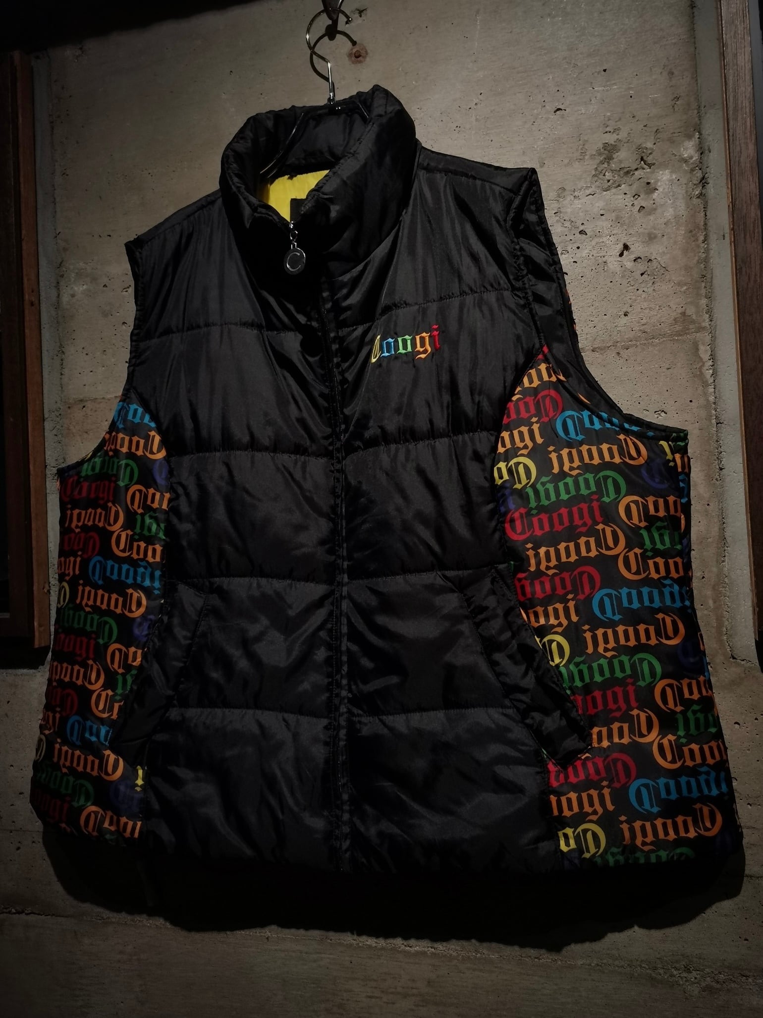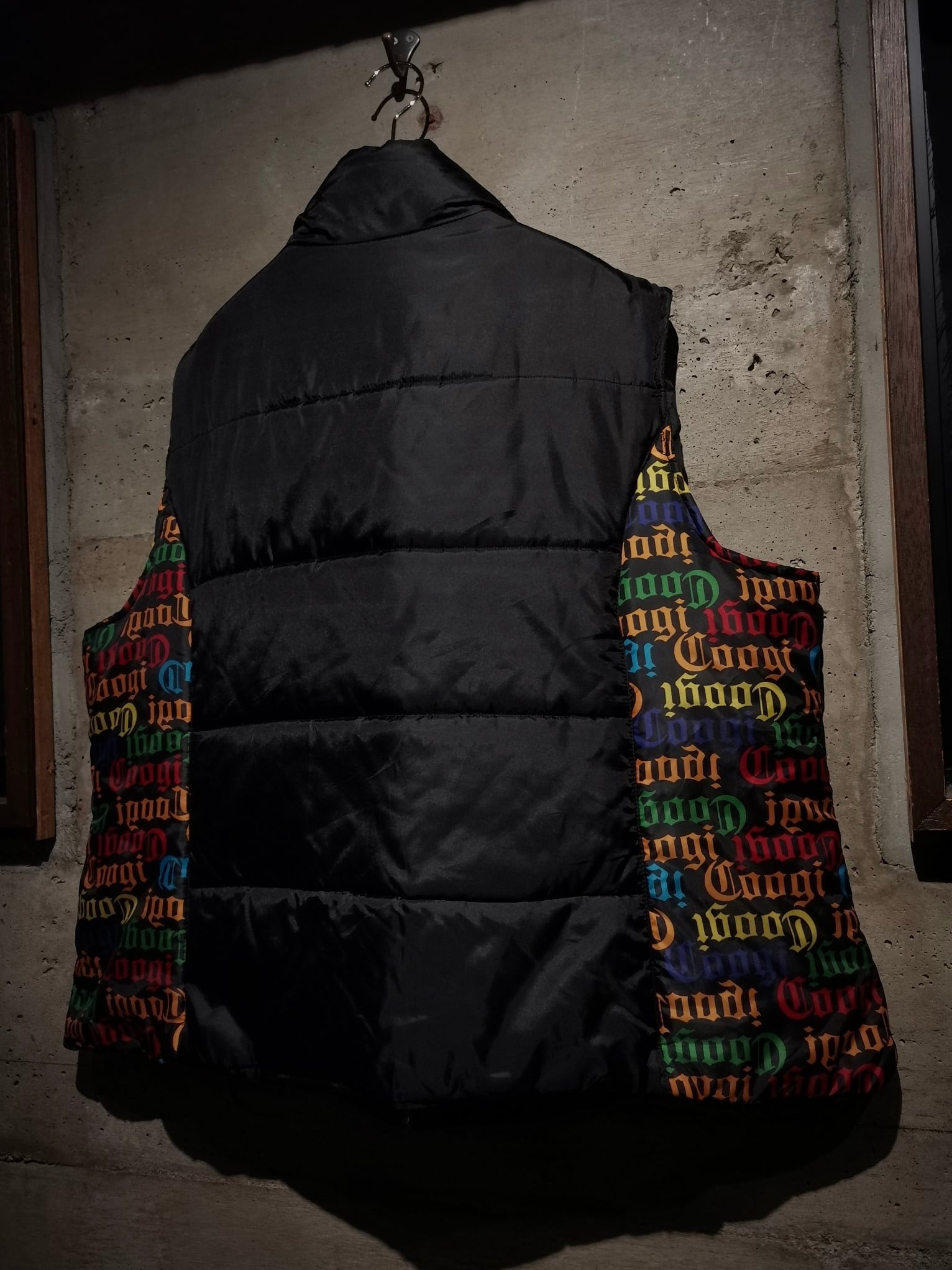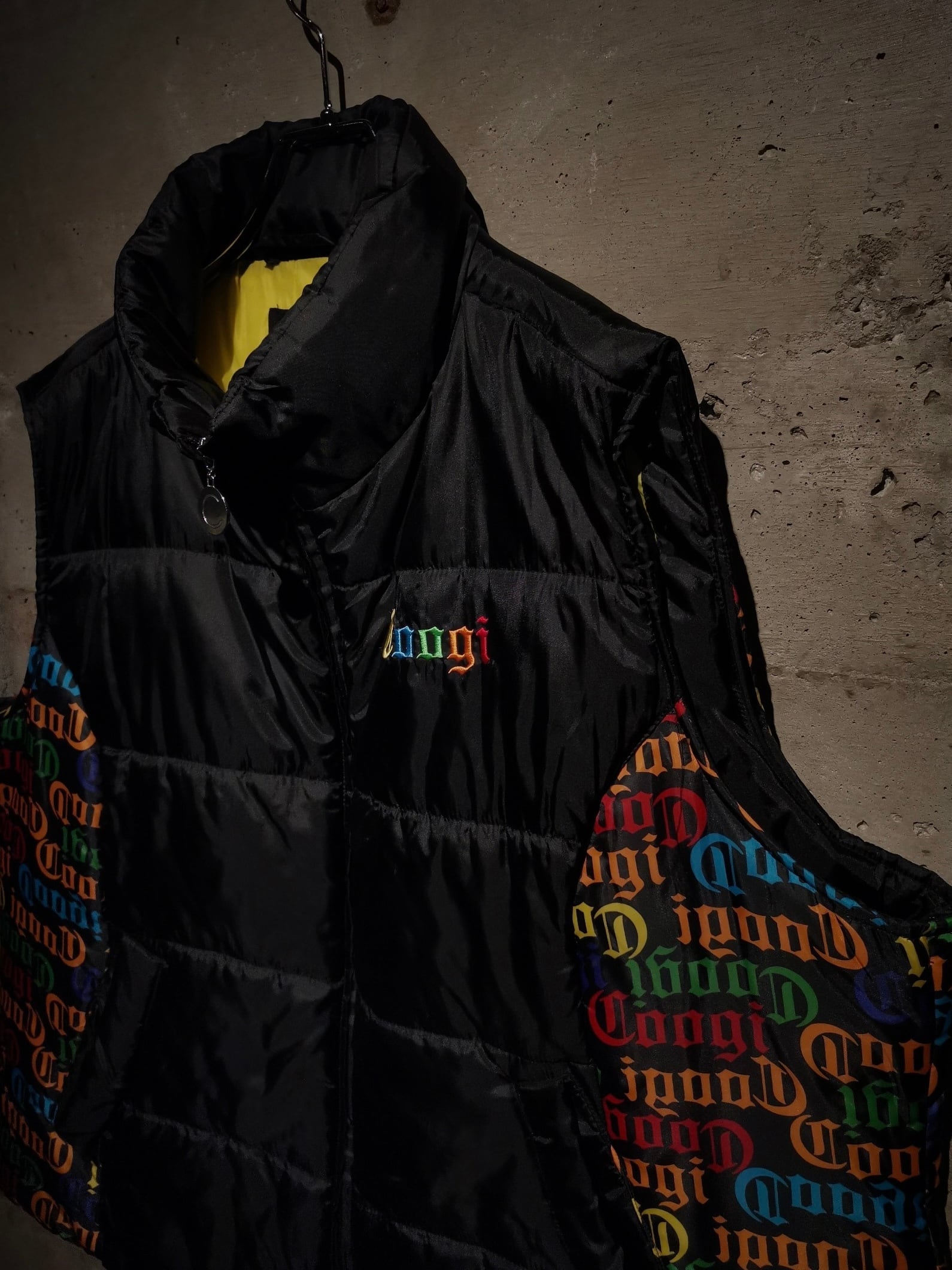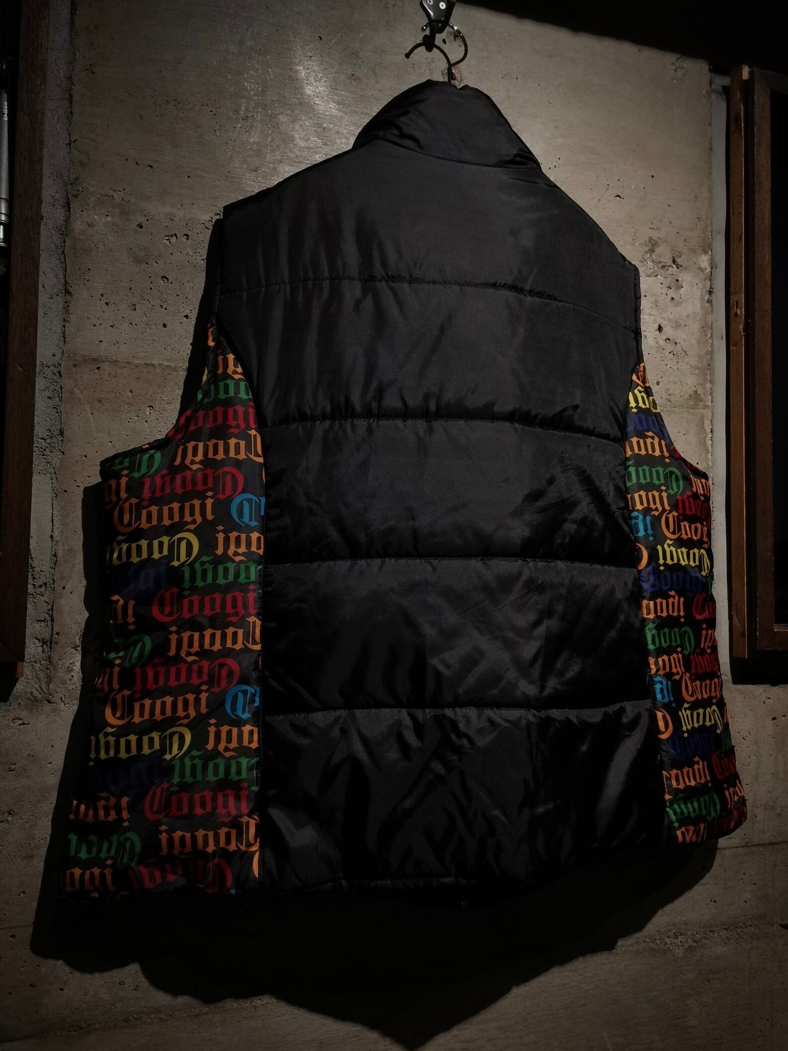 微光沢を放つブラックのボディをベースに、ボディサイドにはブランドネームを散りばめ切り替えたパデットベスト。