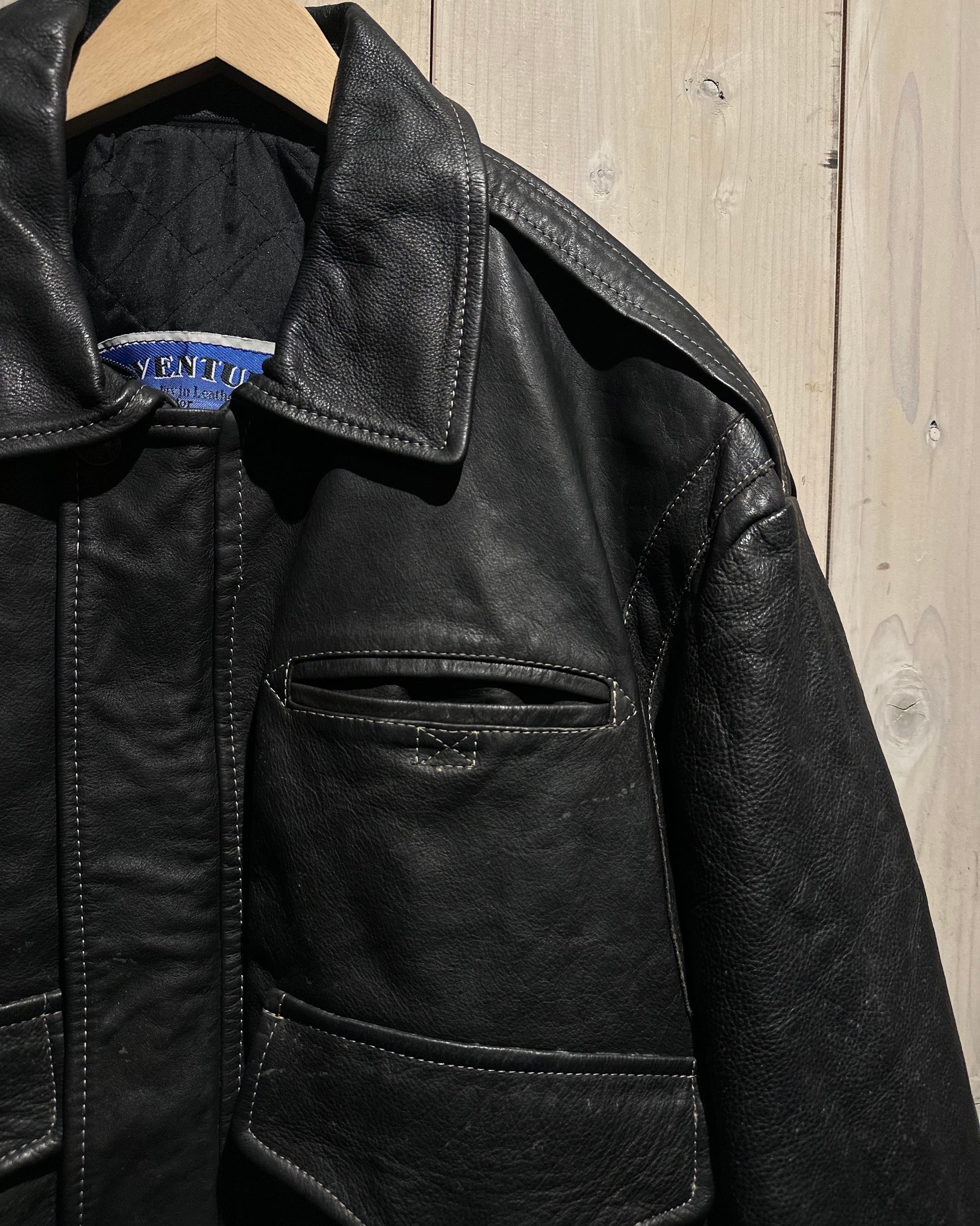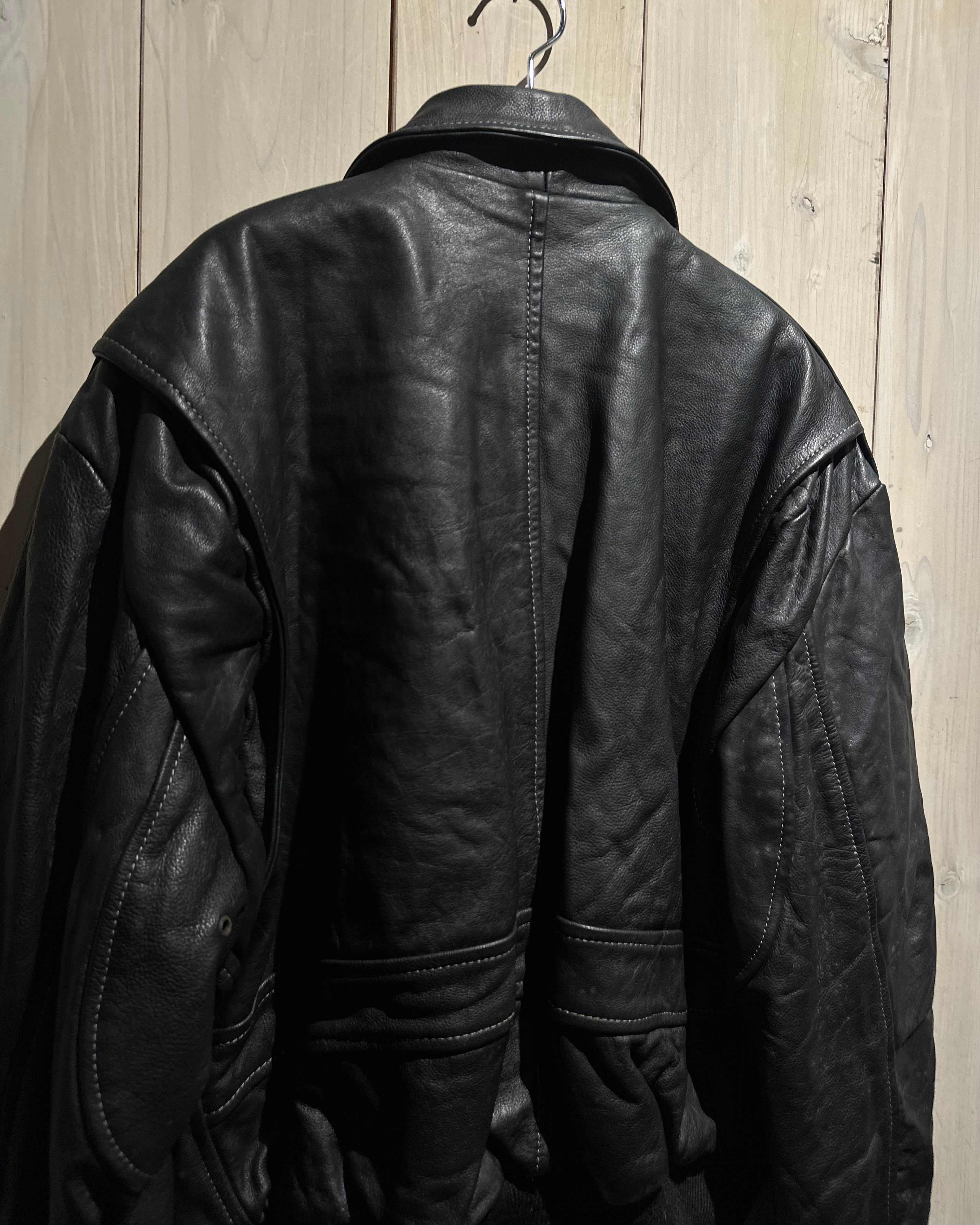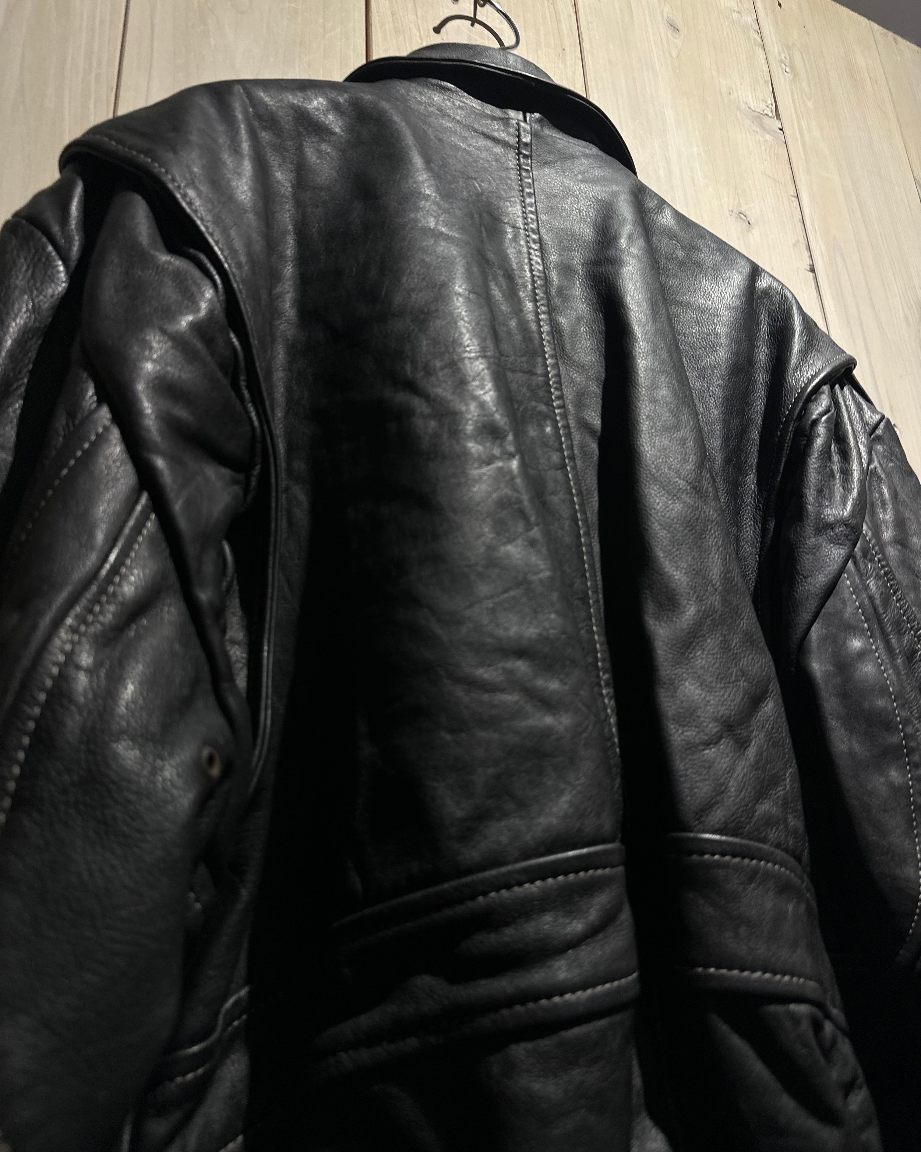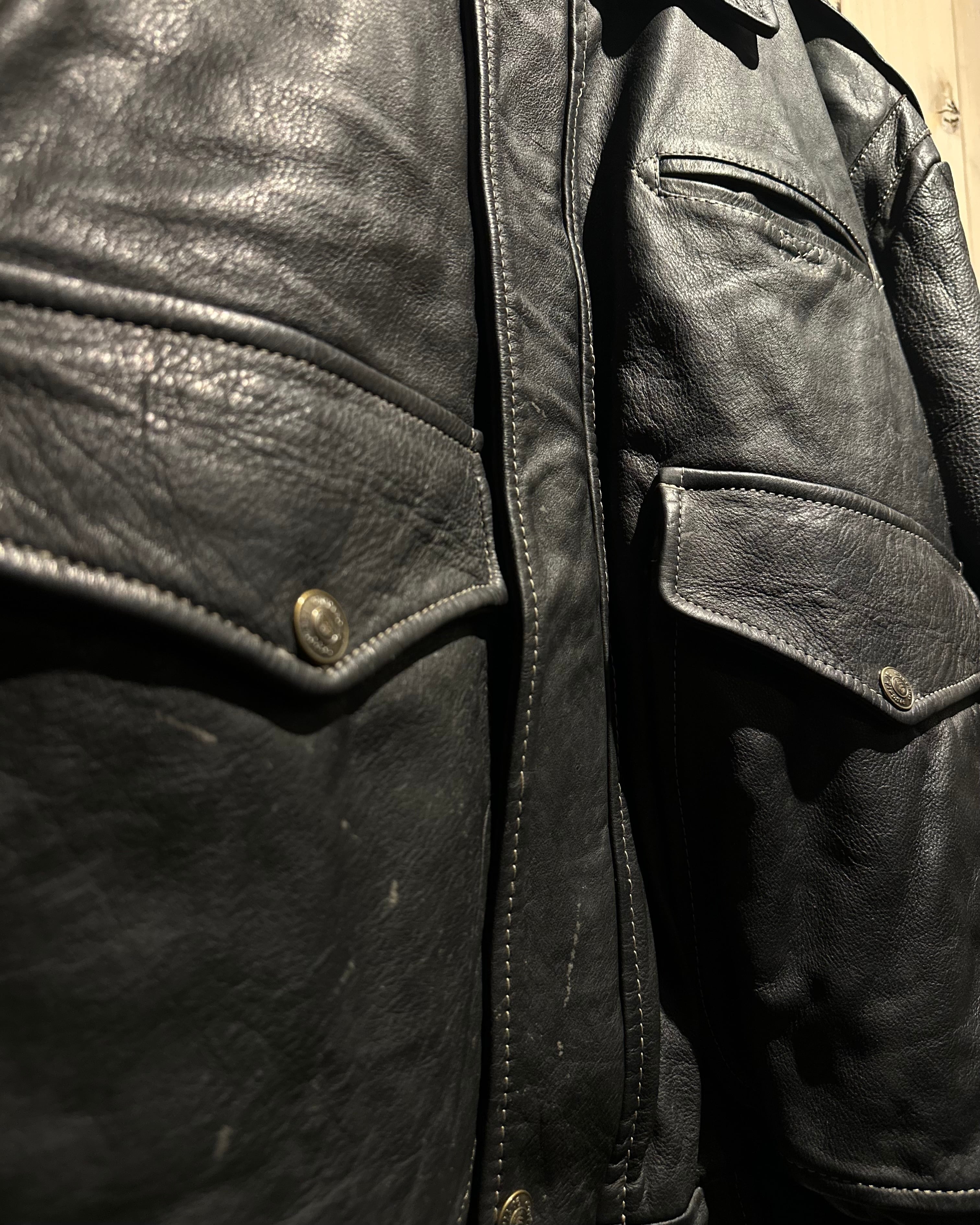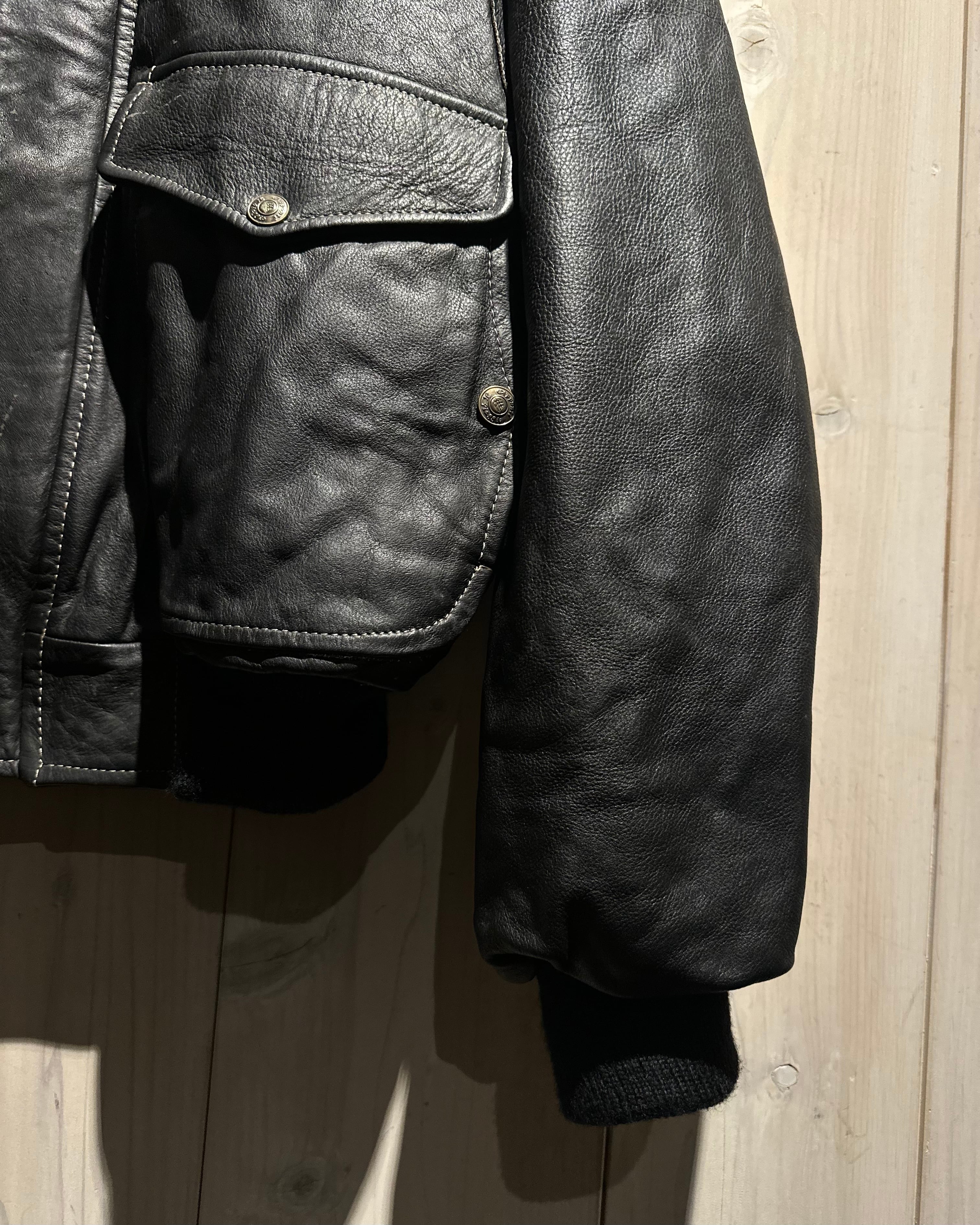 1931年に米陸軍航空隊に採用された、フライトジャケットの名作"A-2"をデザインソースにした1着。写真からもヒシヒシと伝わる上質なブラックレザーが無骨さを引き立ててくれています。