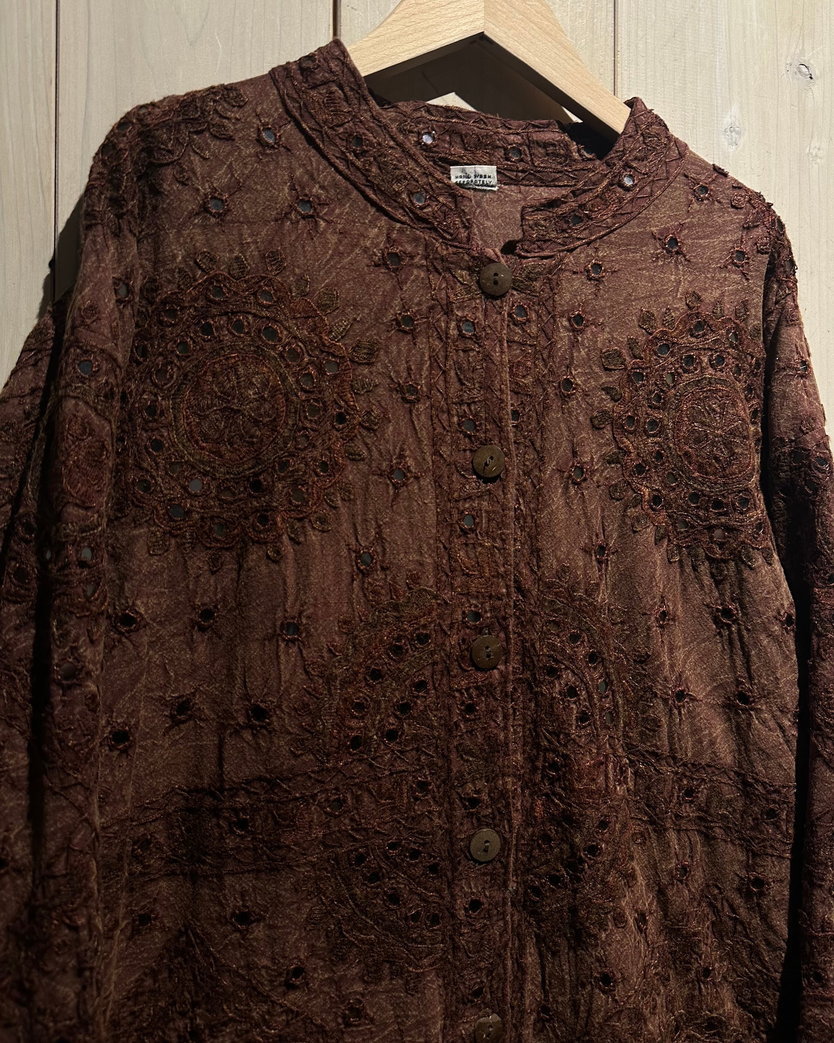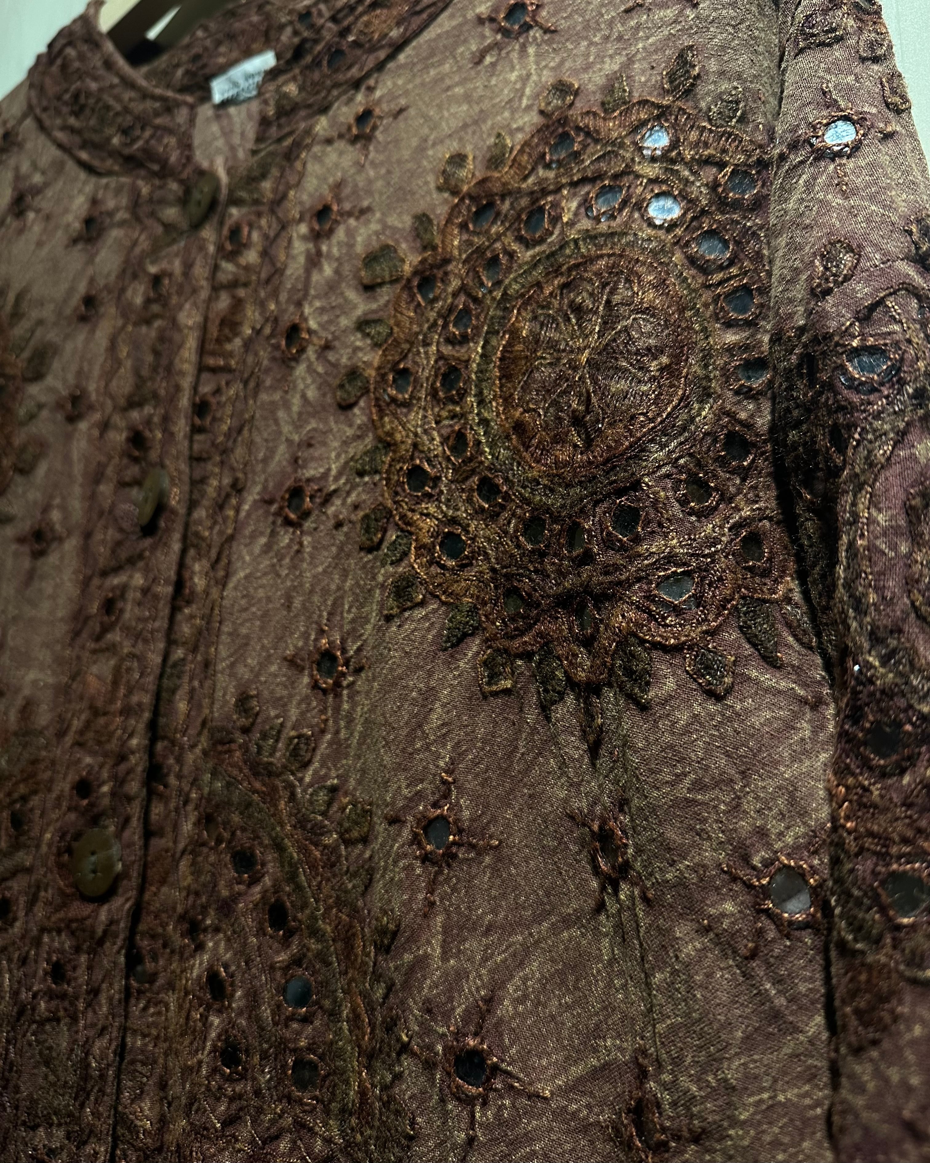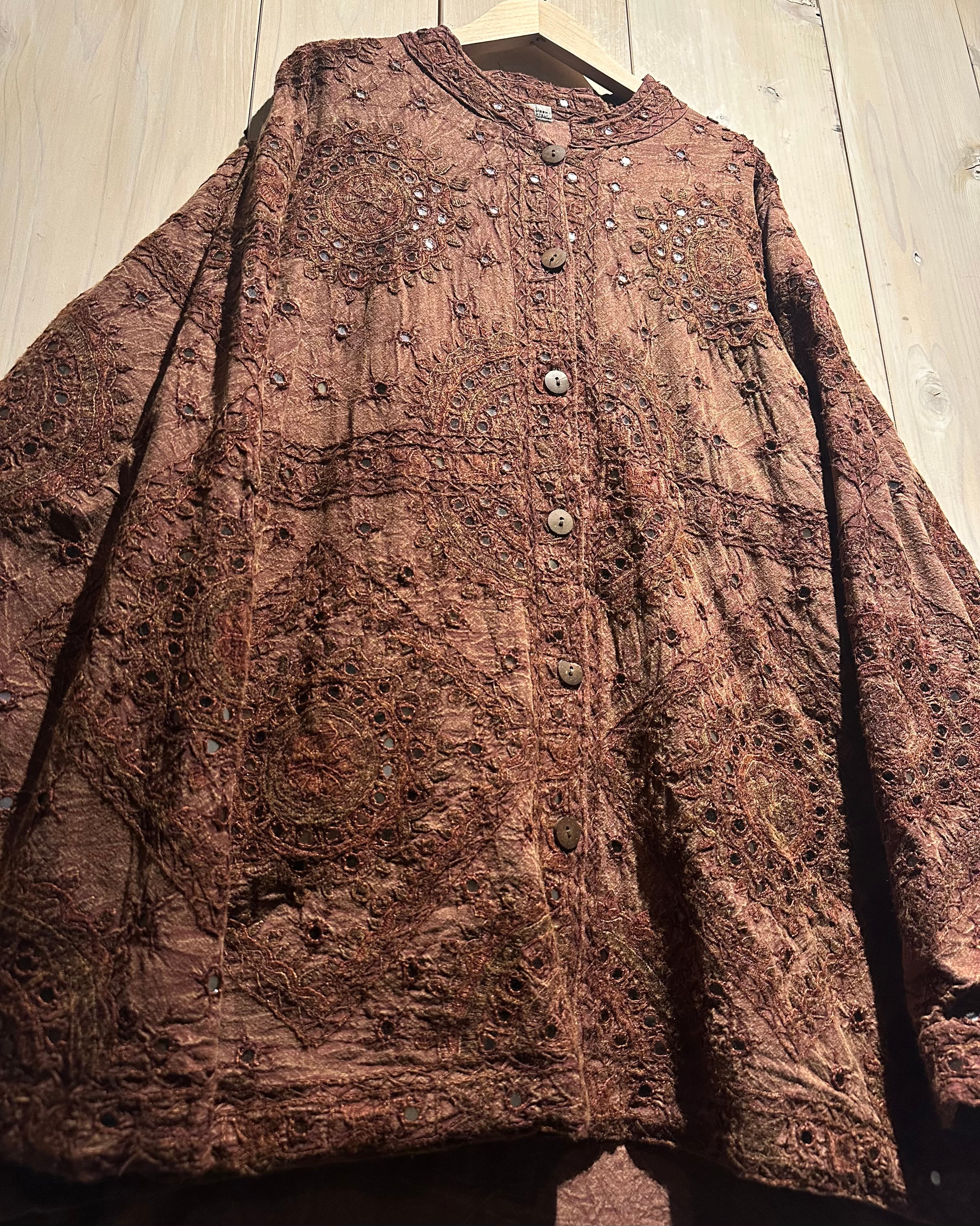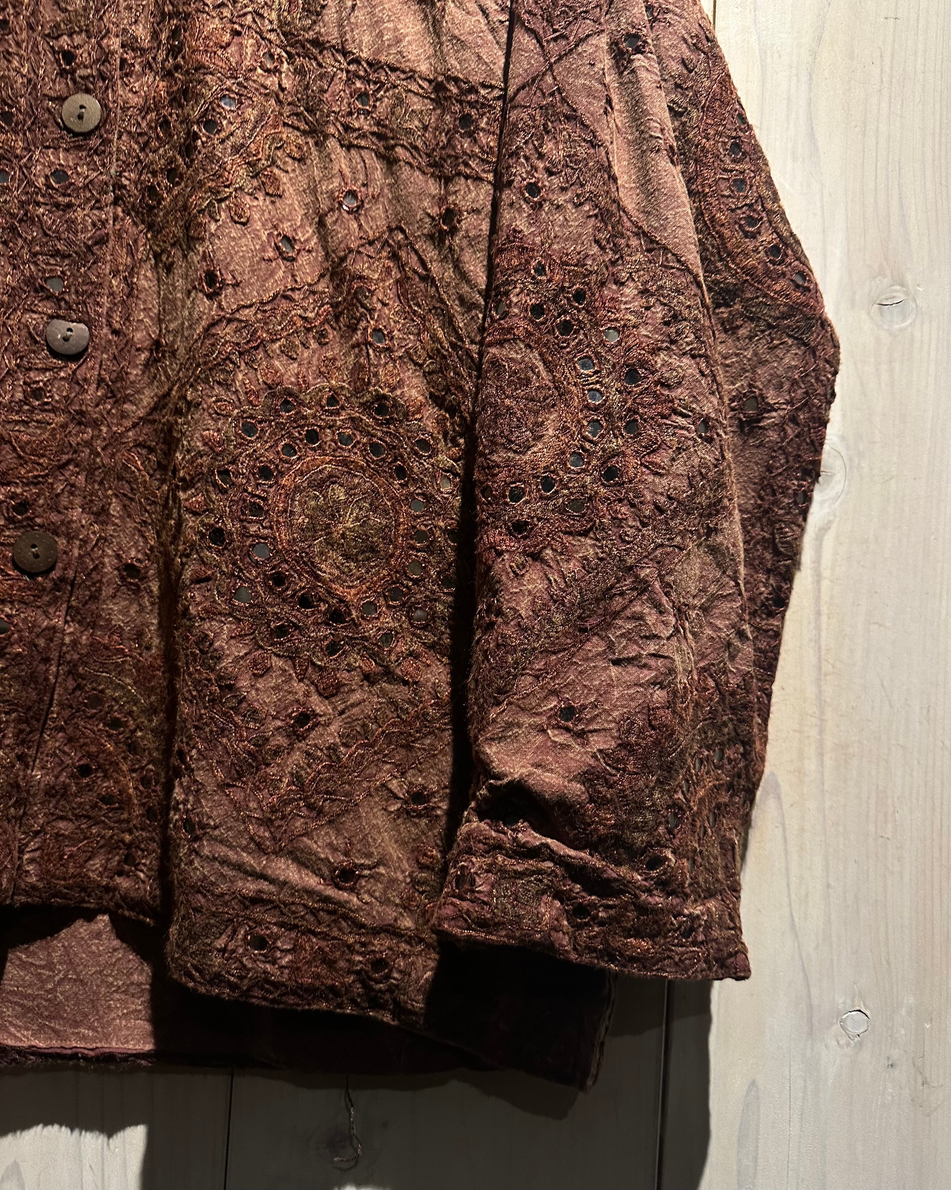 上品なブラウンカラーをベースとし、ヨーロピアンな柄模様を刺繍で表現したジャケット。