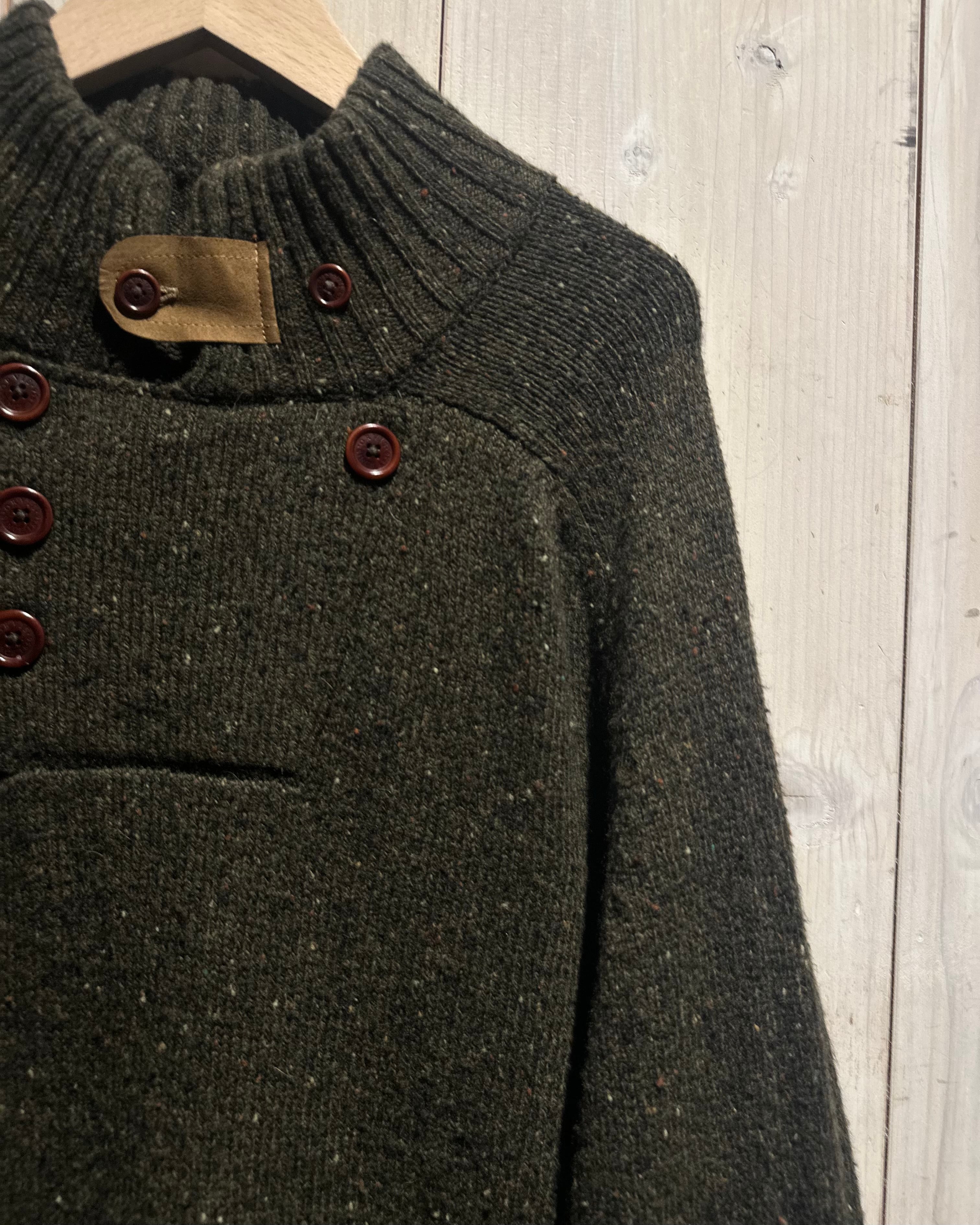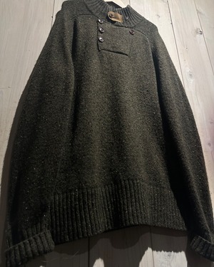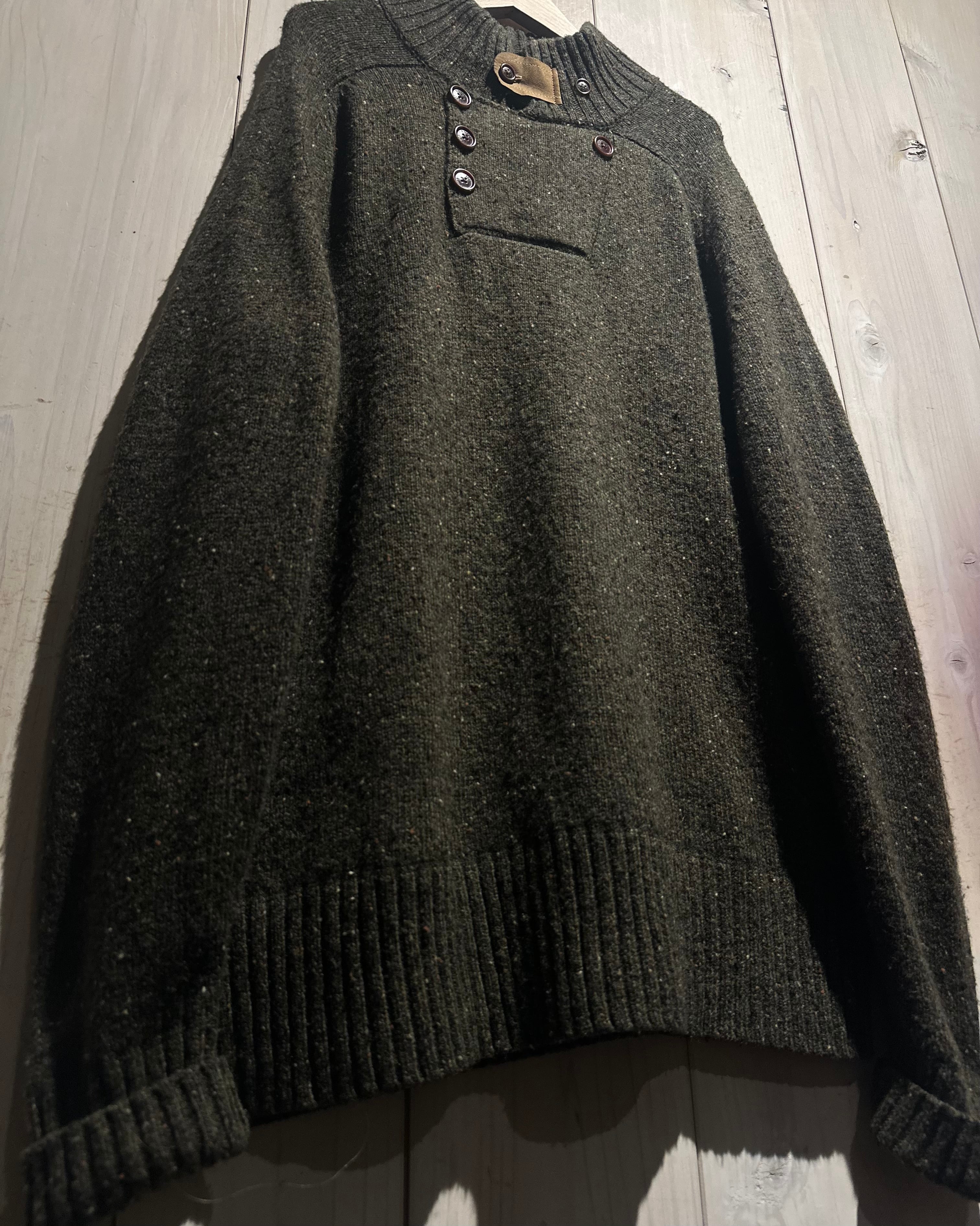 カーキをベースとしたボディに、フロント首元にボタンとベルトのギミックを載せた、シンプルなデザインながら、細やかなディテールに服好きの心ど真ん中を射抜かれるニット。