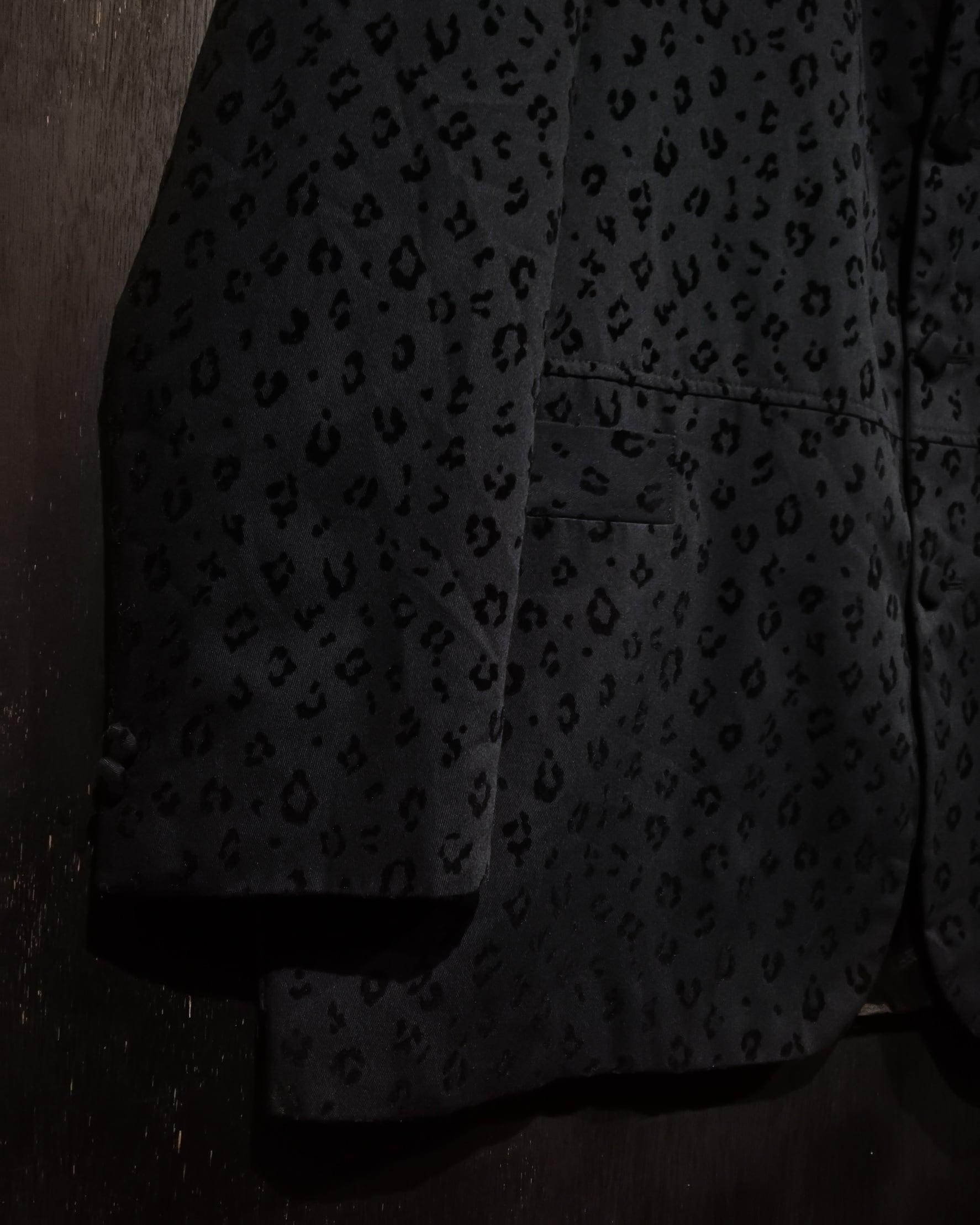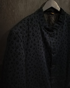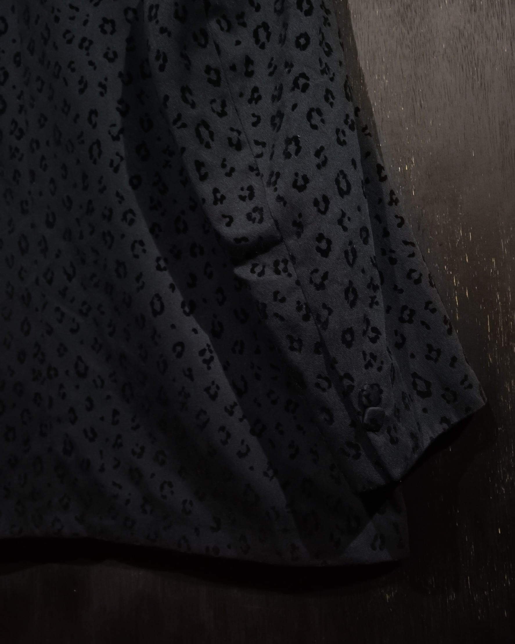 ブルーグレーのボディをベースに、フロッキープリントでレオパード柄を載せたジャケット。
