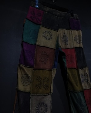 風合い豊かな染めを施した生地を用いて、赤×青×紫×橙×緑といったマルチな配色でパッチワークに落とし込んだフレアパンツ。