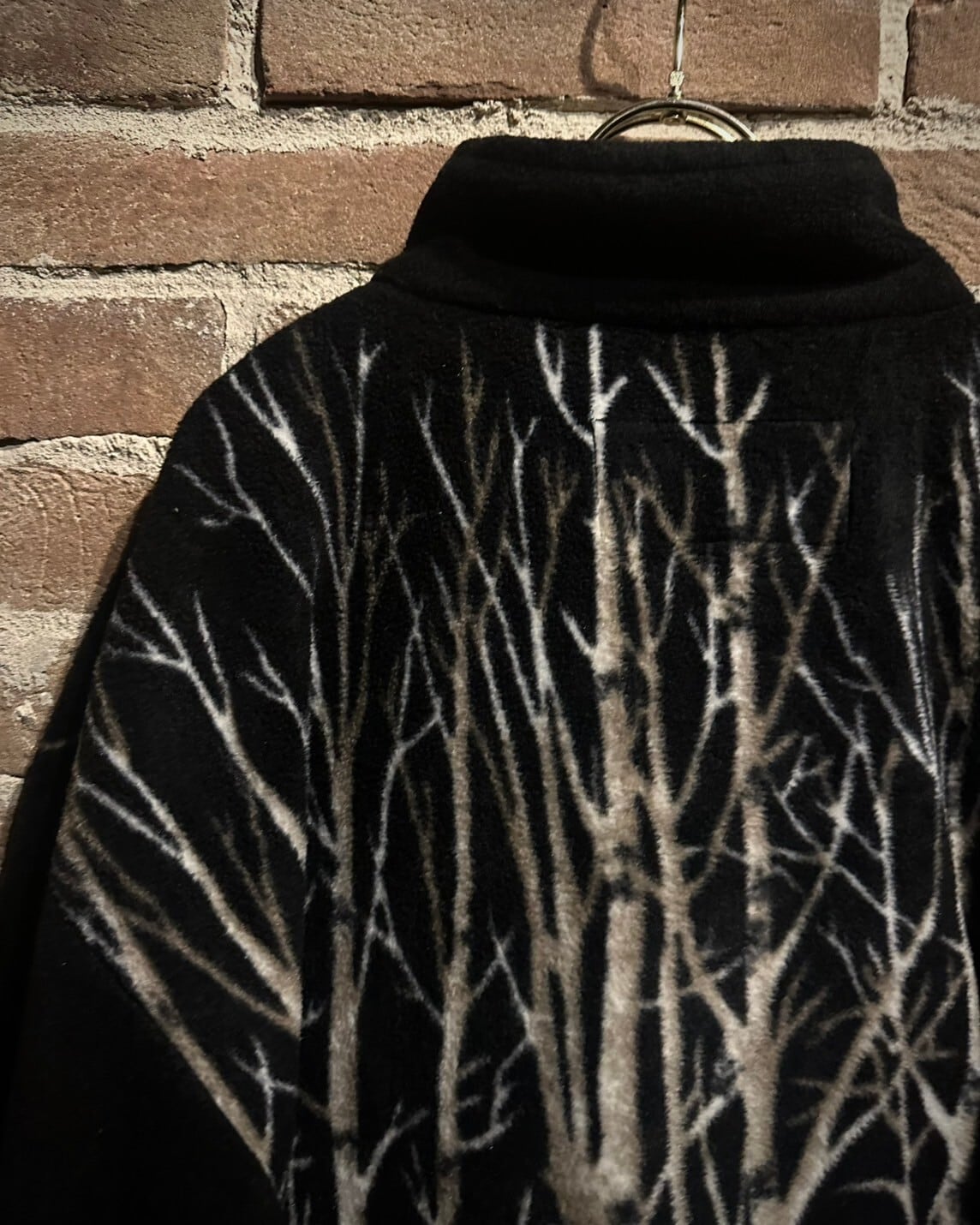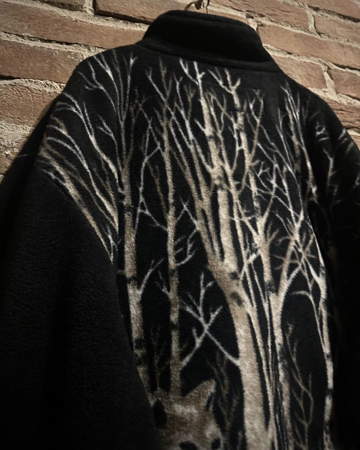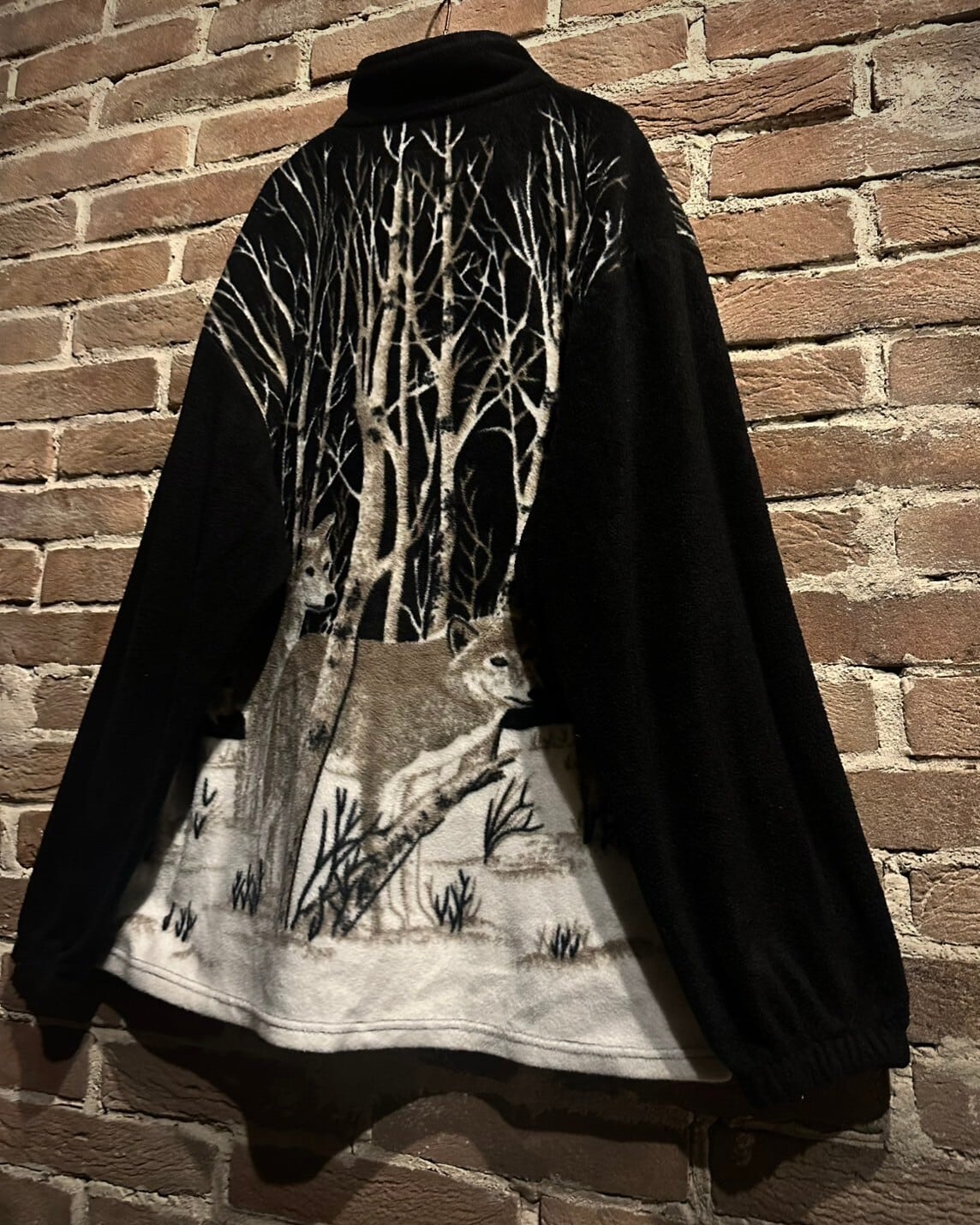 フワッと軽くて保温性が高いフリース素材に正面と裏面に自然の中に佇む狼を描いたフリースジャケットの逸品。