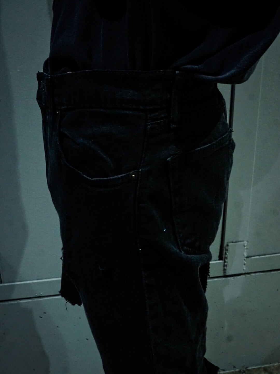フェード感のあるブラックデニムボディに、複数のデニムパンツを縫い合わせ、シルエットの拡張をした至極の一本。