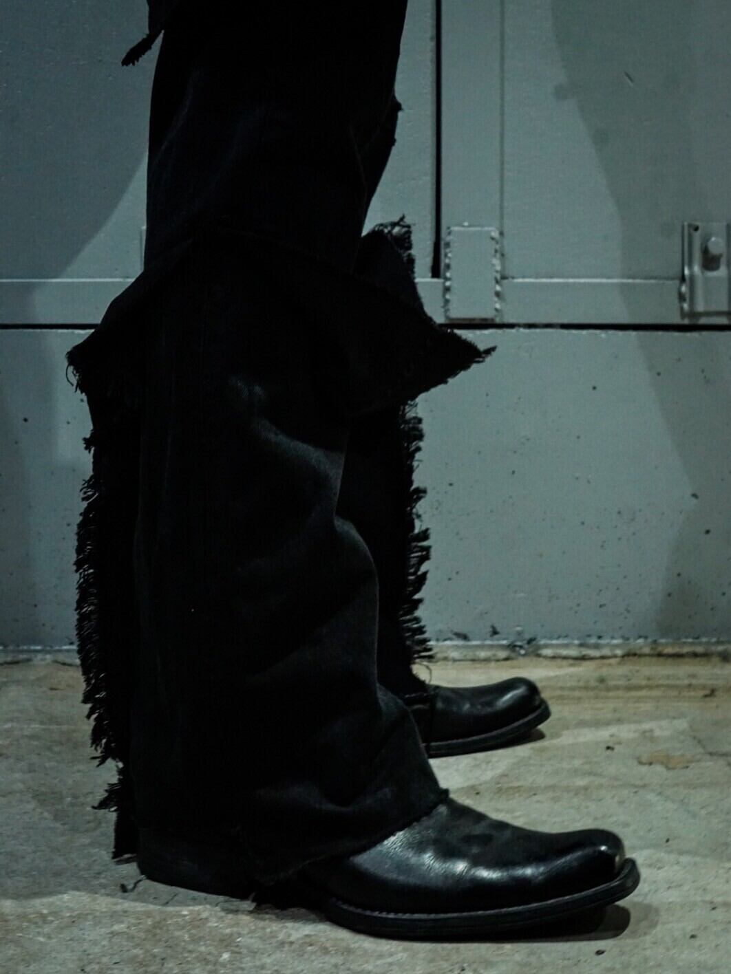 組み合わされたデニム素材はあえて糸処理をせず、粗野な表情を残したこともポイント。履く回数を重ねるに連れて、自分ならではの経年変化をお楽しみ頂けます。