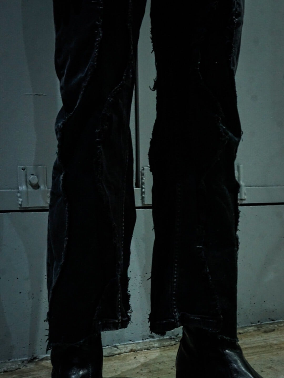 履いていくごとにフリンジが生み出され、程よいボロ感を演出しています。色の濃さの違う生地を使う事でデザイン性、シルエットを追求した逸品。
