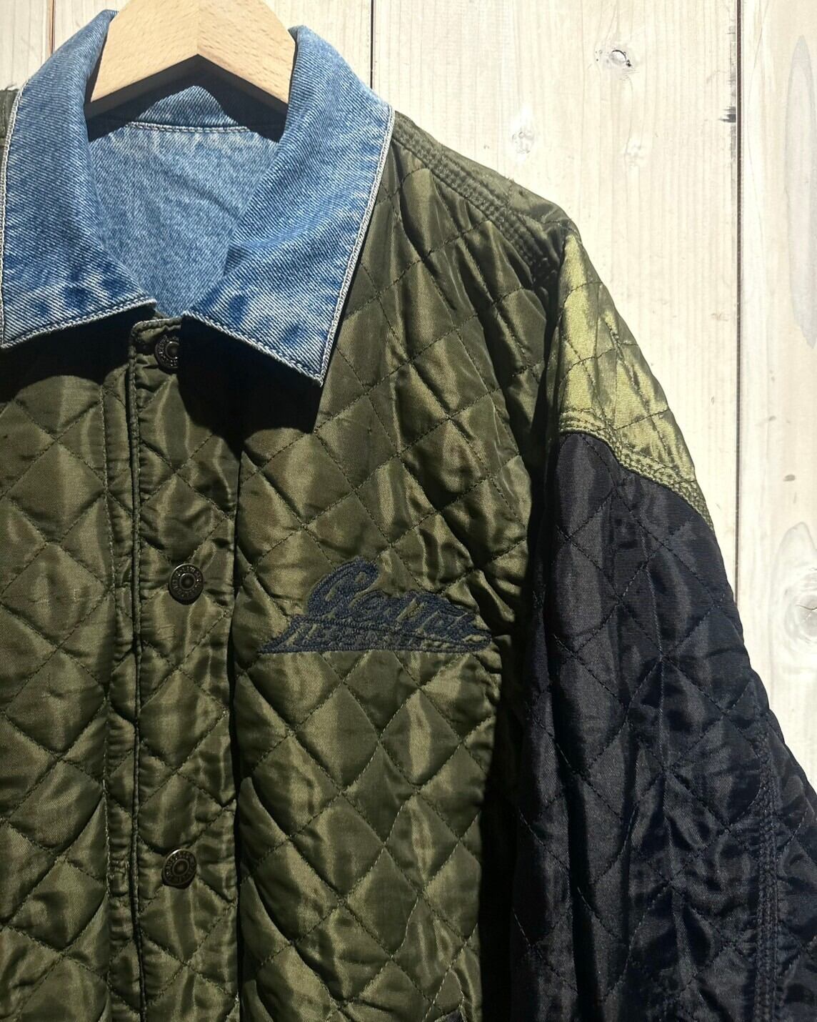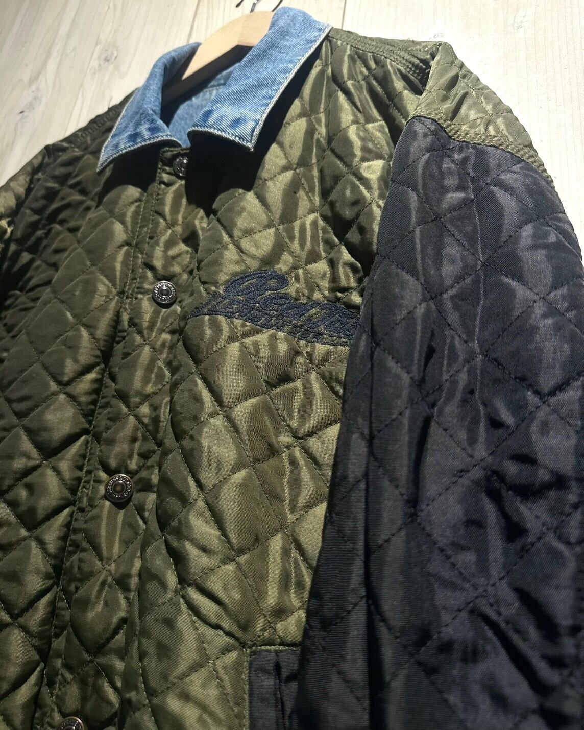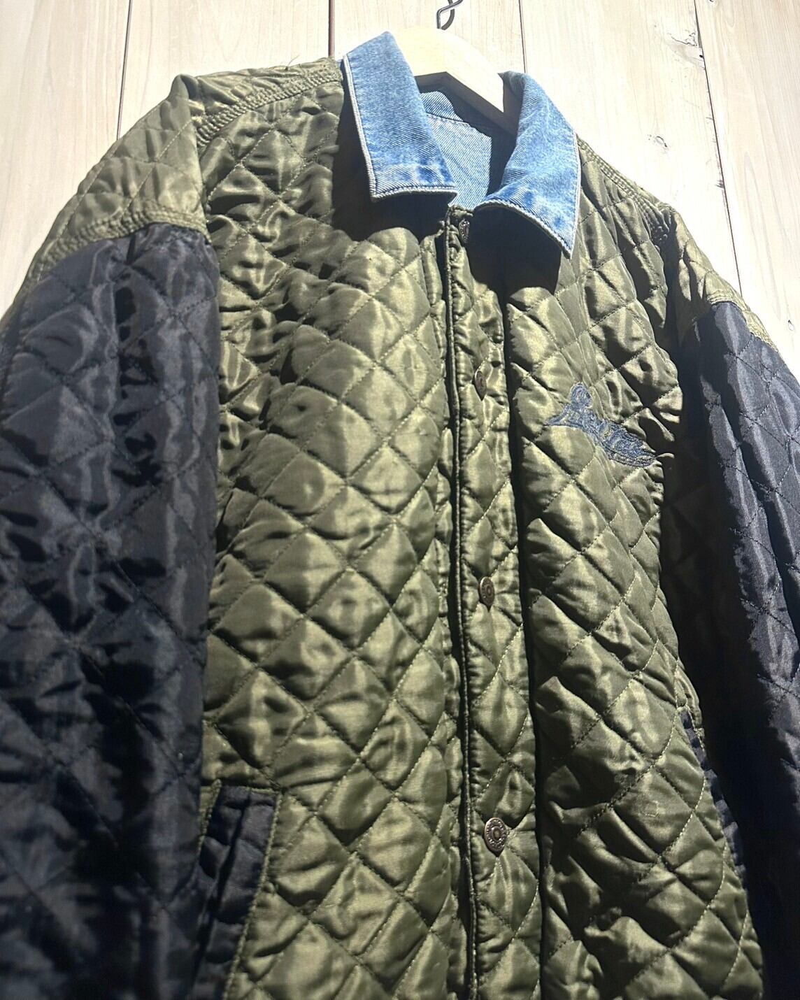 片面はオリーブ×ブラックでカラーを切り替えたキルティングを採用し、左胸、背面にはスタジャンノリのブランドネーム刺繍をON。