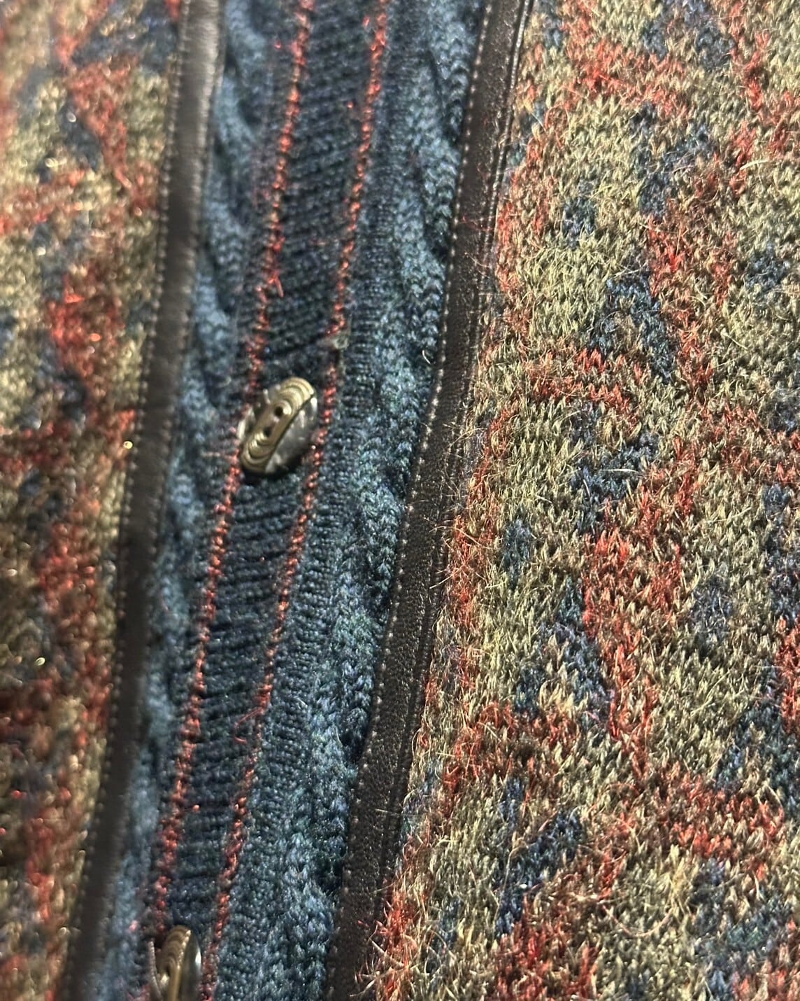 柄模様とケーブルニットの切り替え部分にはレザーのパイピングが施され、デザインに高級感とメリハリをもたらせてくれています。