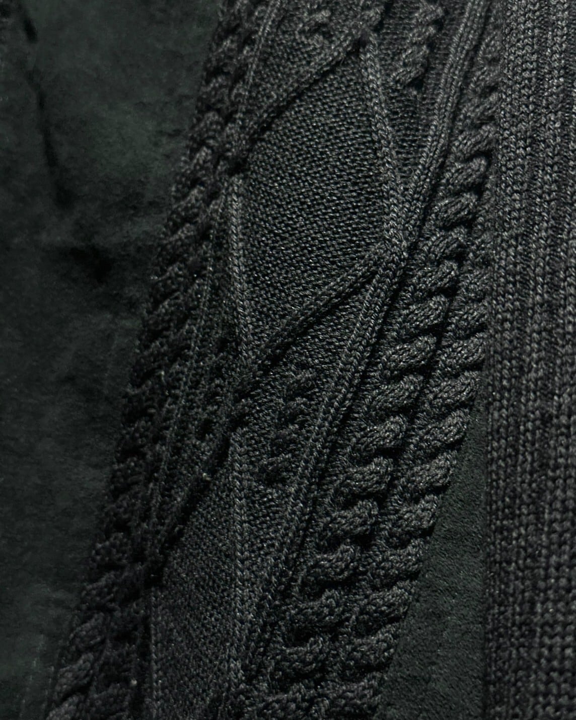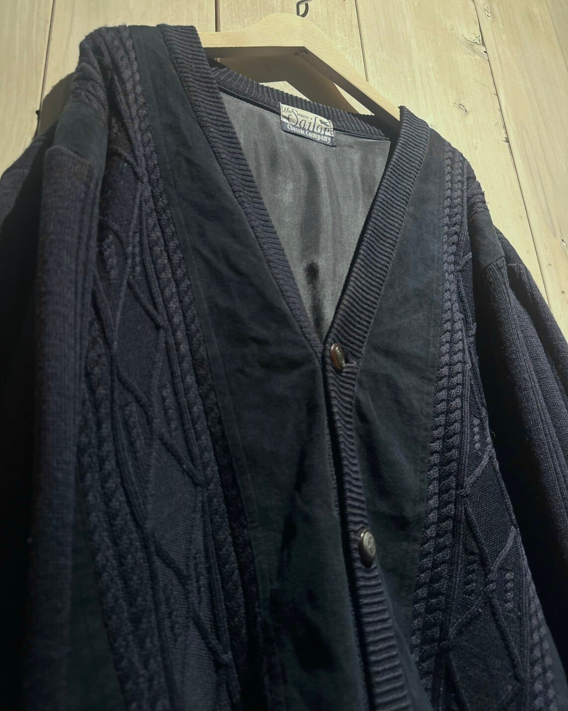 ネイビーをワントーンで仕上げられており、異素材の掛け合わせにより素材間のコントラストを演出したデザインバランスも素晴らしい仕上がりに。さらにはケーブルニットが施されており、デザインへの拘りを感じられます。