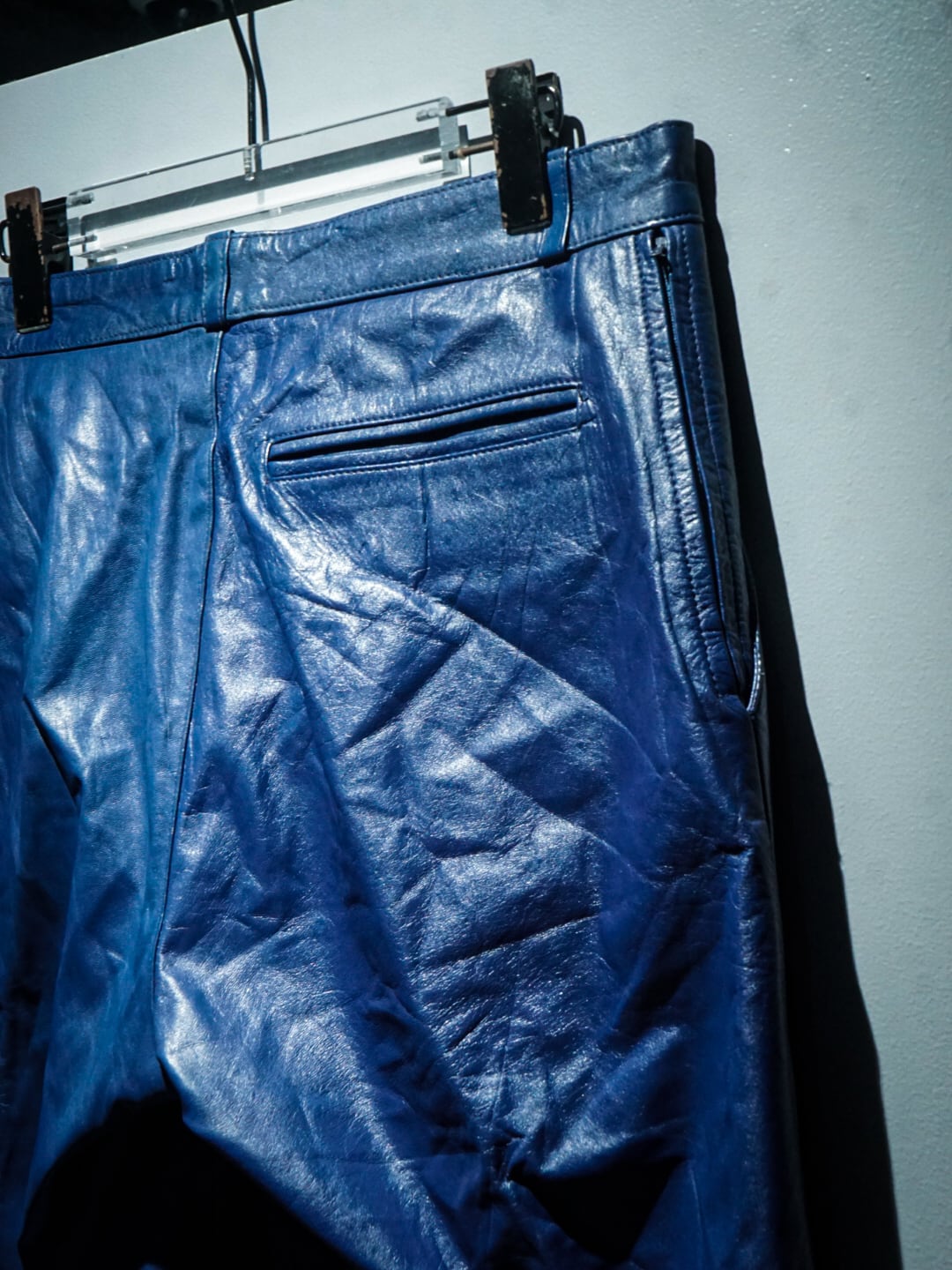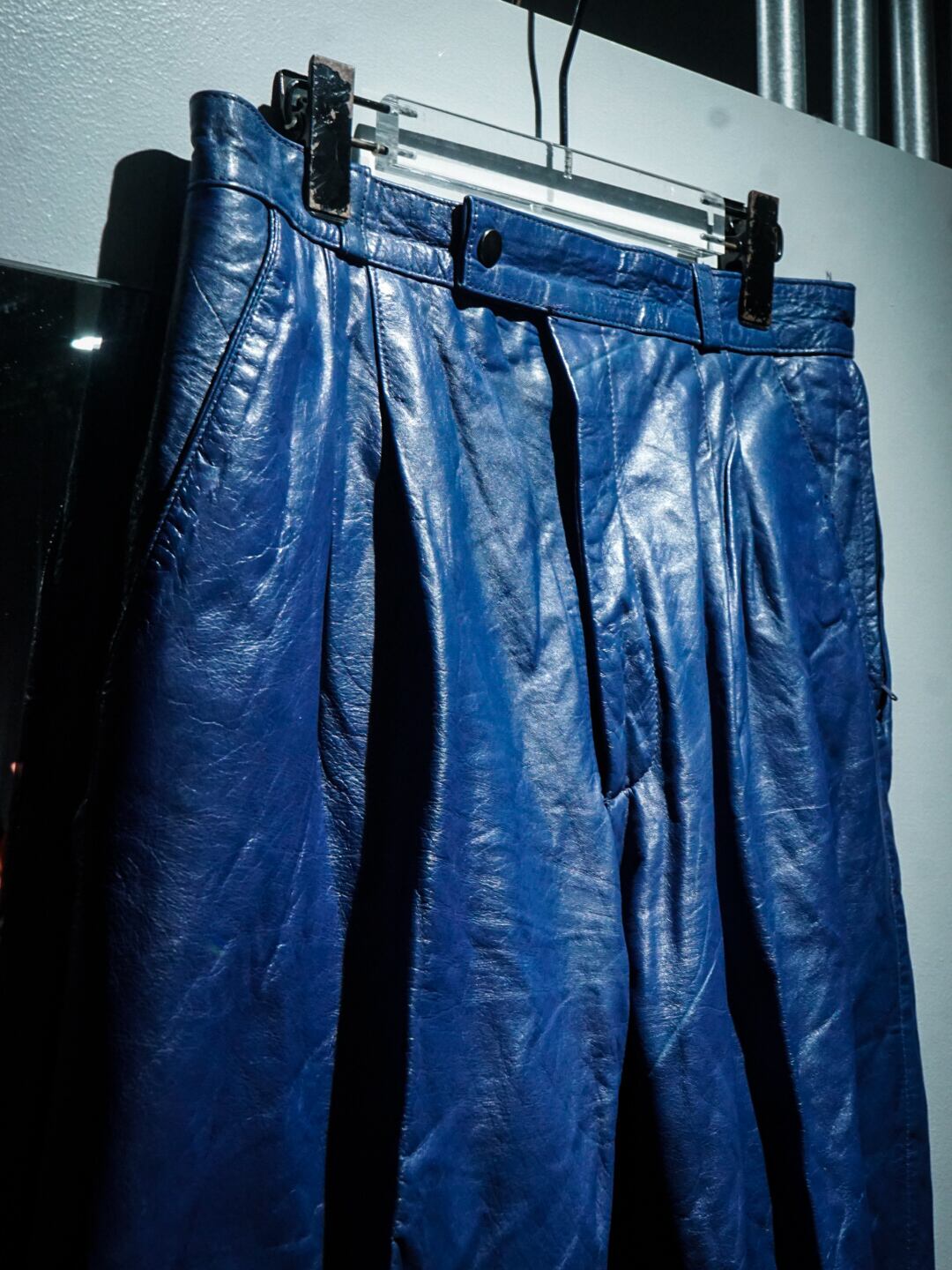 ハリのある上質なレザーを用いて、美しく鮮やかなブルーカラーで仕上げたレザーパンツ。
