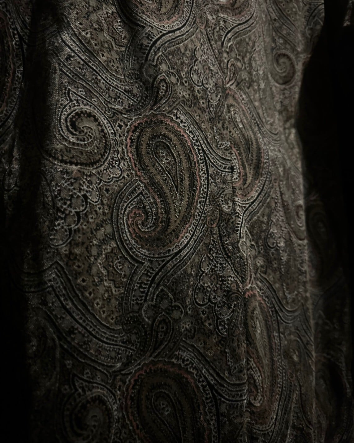 鈍い光沢を帯びたベロア素材とペイズリー柄が見事にマッチ、ラグジュアリーな雰囲気をムンムンに漂わせます。