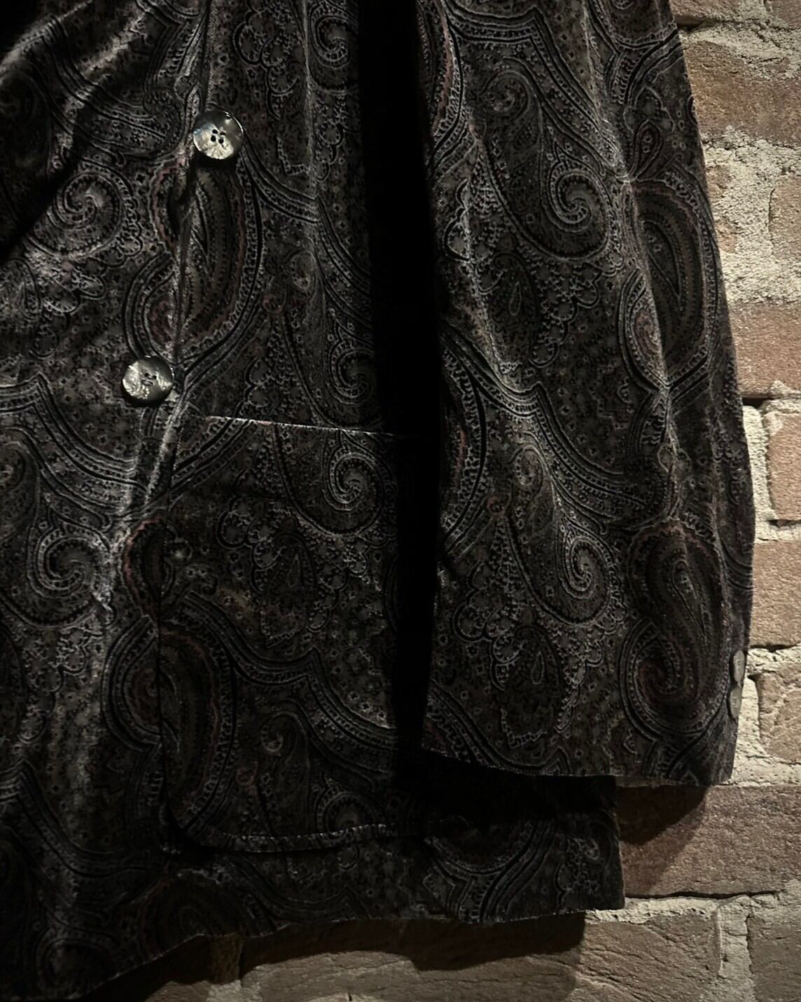 見る角度や光の当たり方によって見え方、輝き方が変わる、極上ベロア素材を用いたテーラードジャケットに非常に美しいペイズリー柄を載せた逸品。