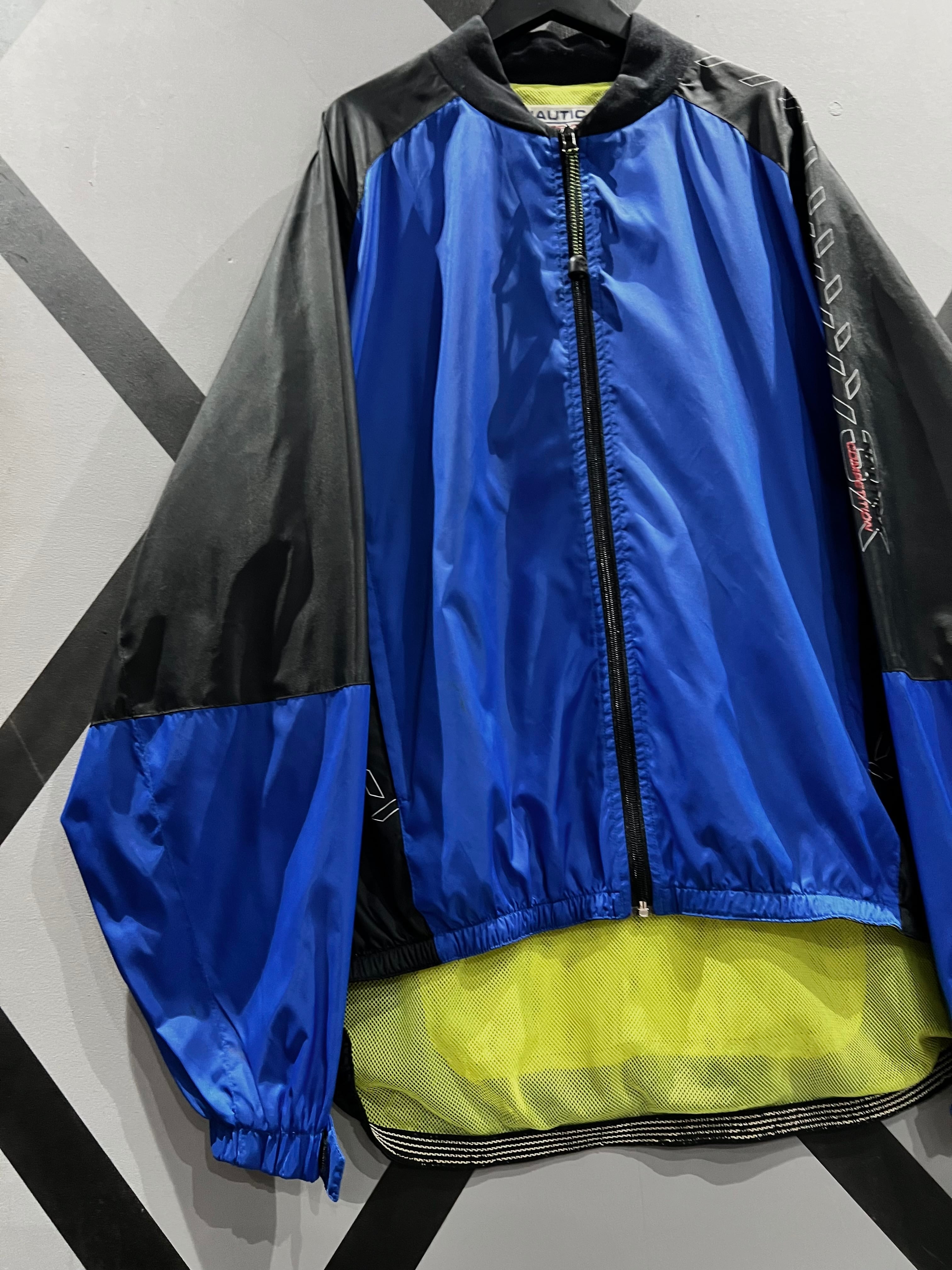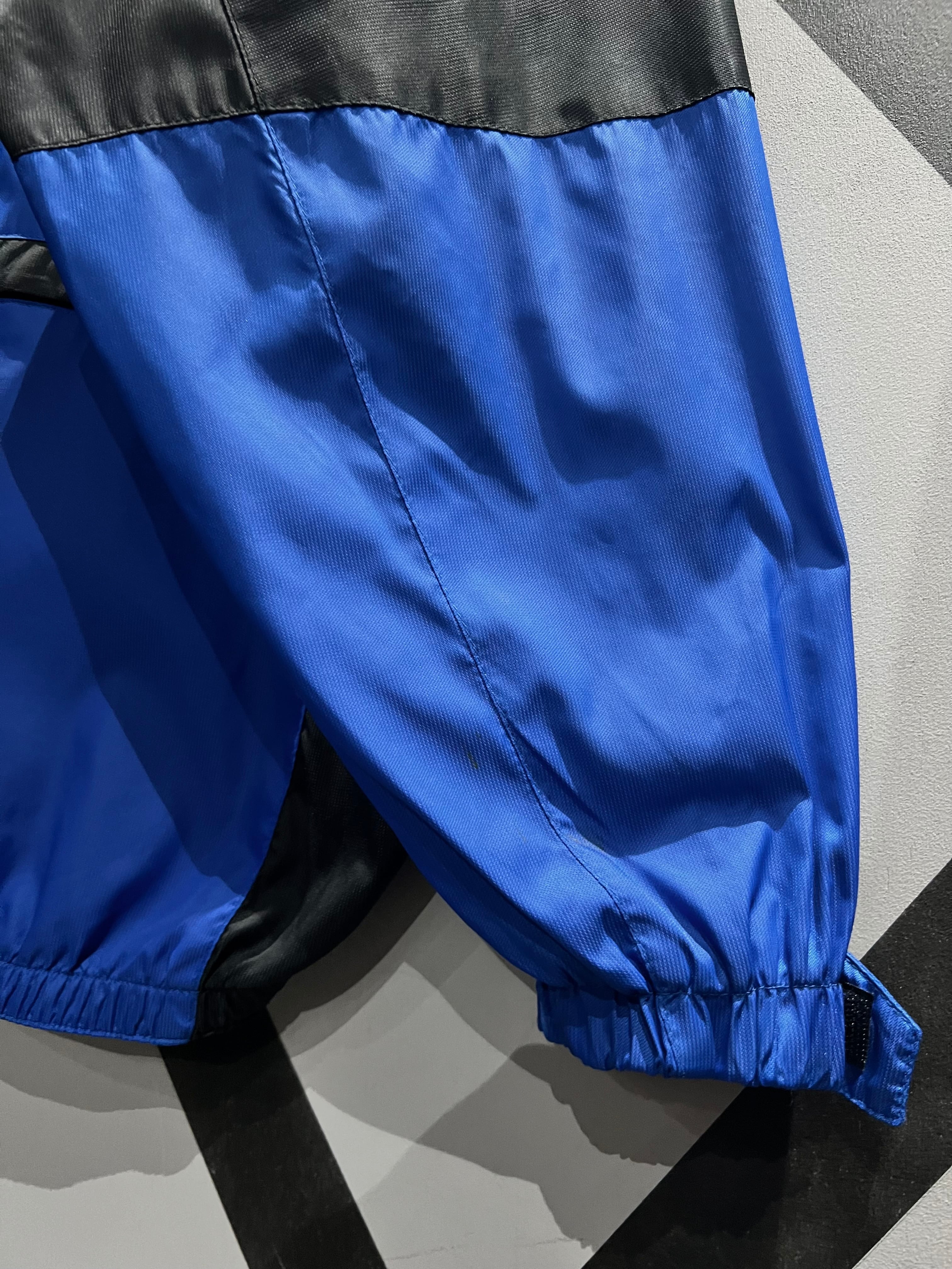 ブルーのナイロンを素材をベースに、肩からアーム、脇腹にかけてブラックのナイロンを切り替え、左胸アームや裾にはプリントデザインを施したテクニカルな雰囲気を醸し出す1着。