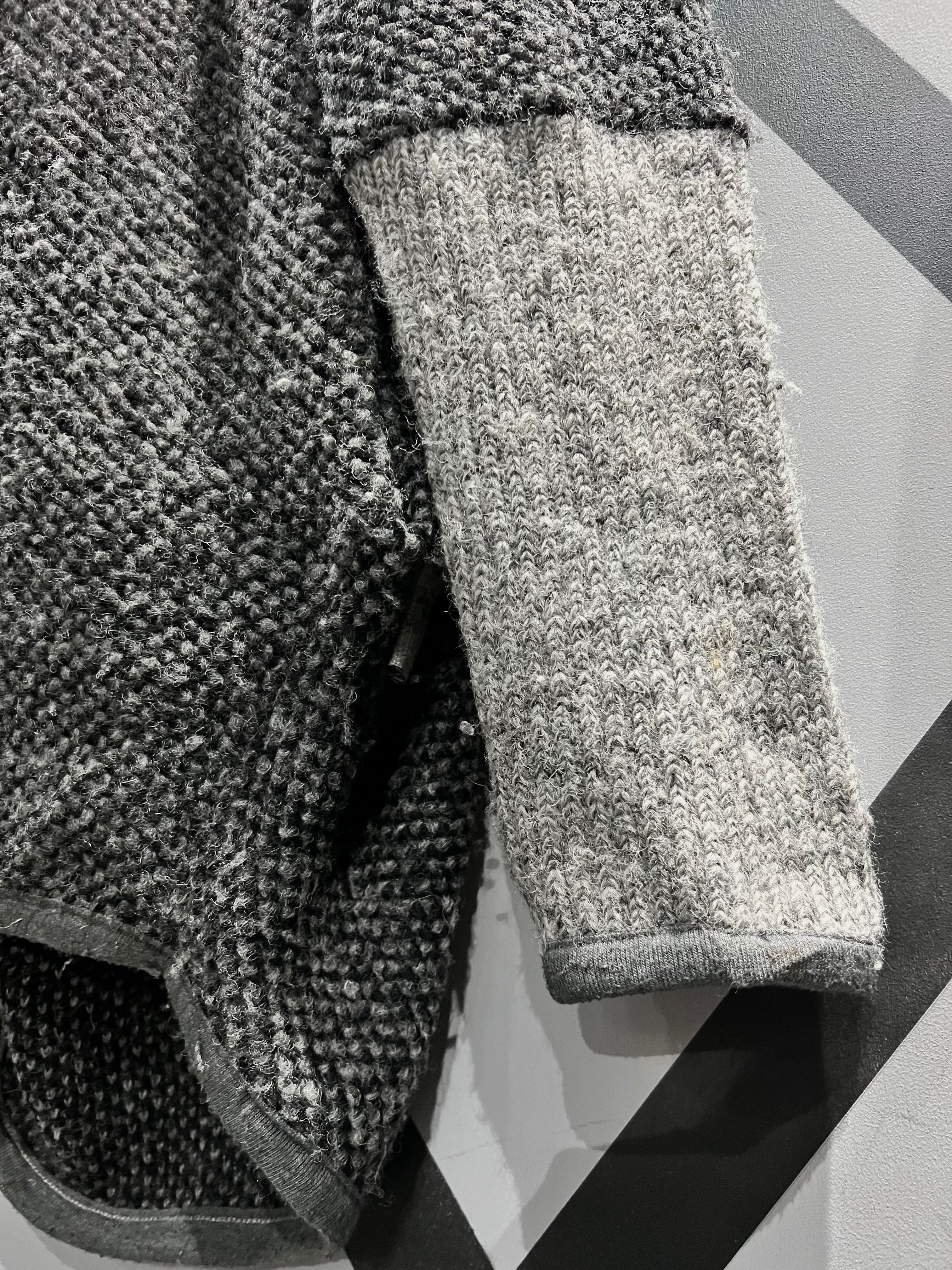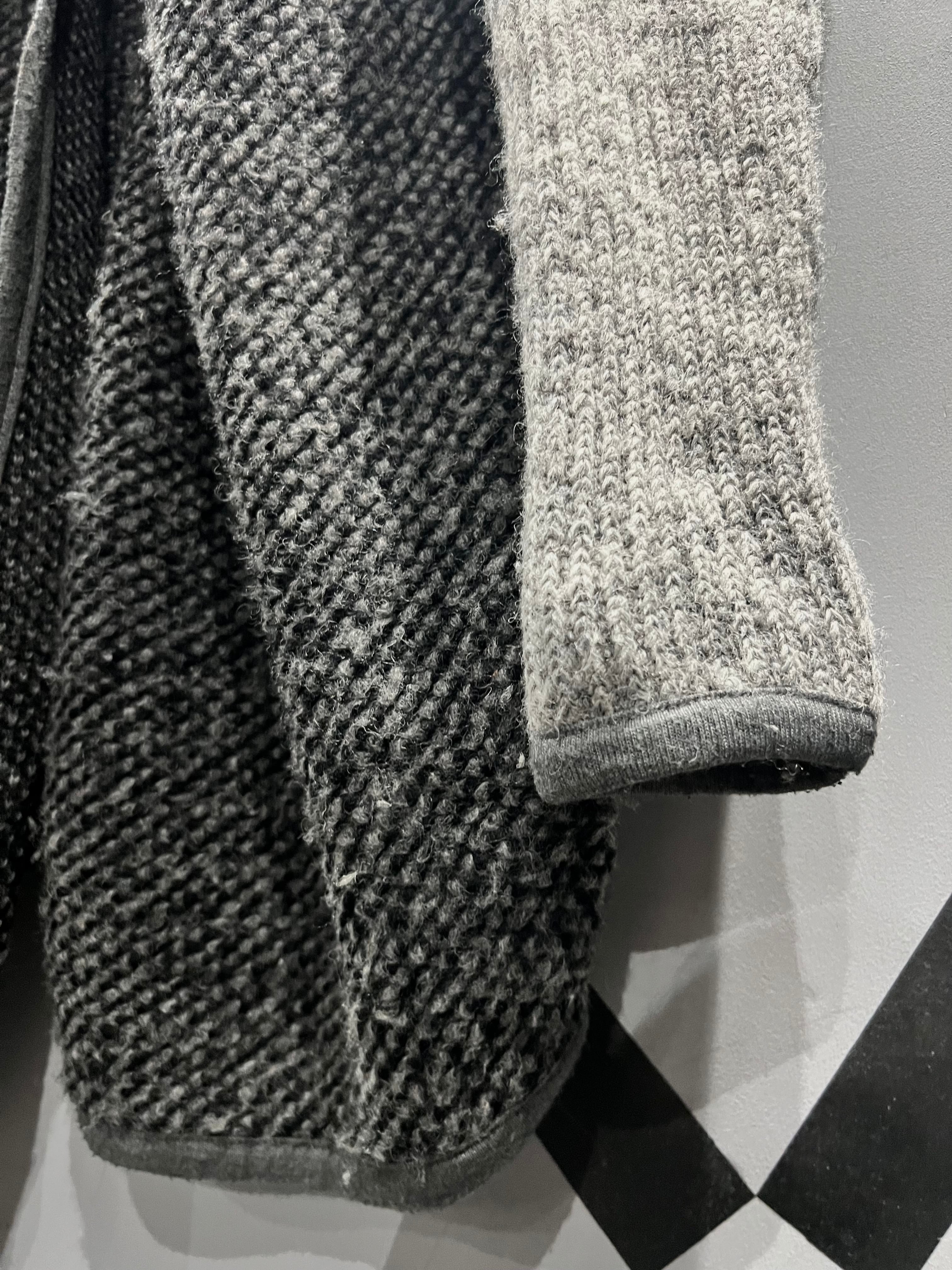 フワッと柔らかくエアリーなウールとポリエステルの混紡素材を使用し、変型のボディに落とし込んだ変型のニット。
