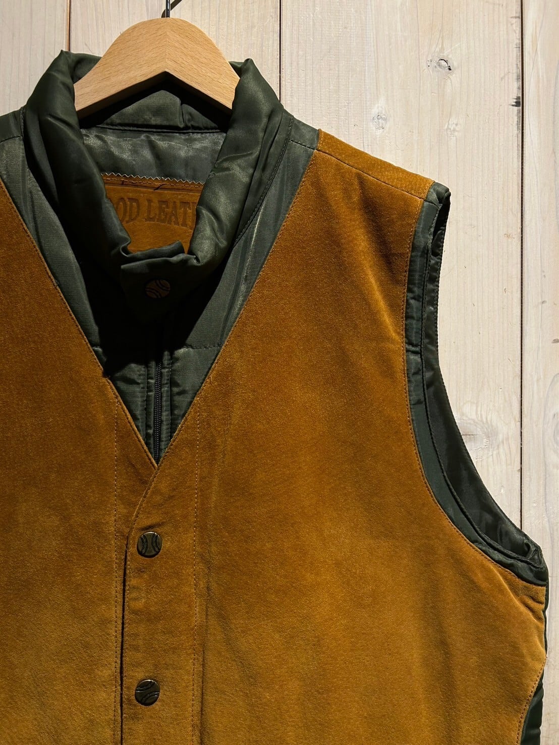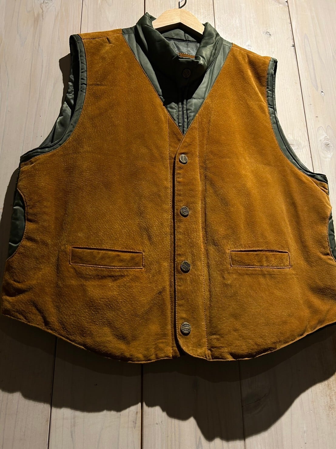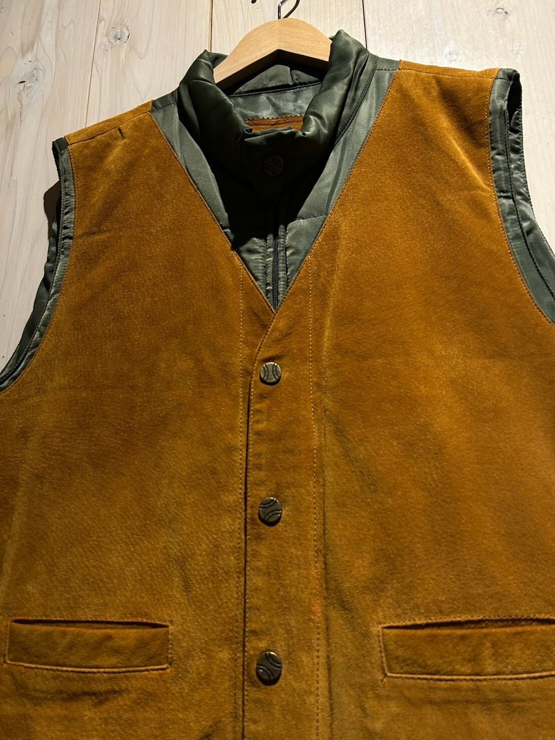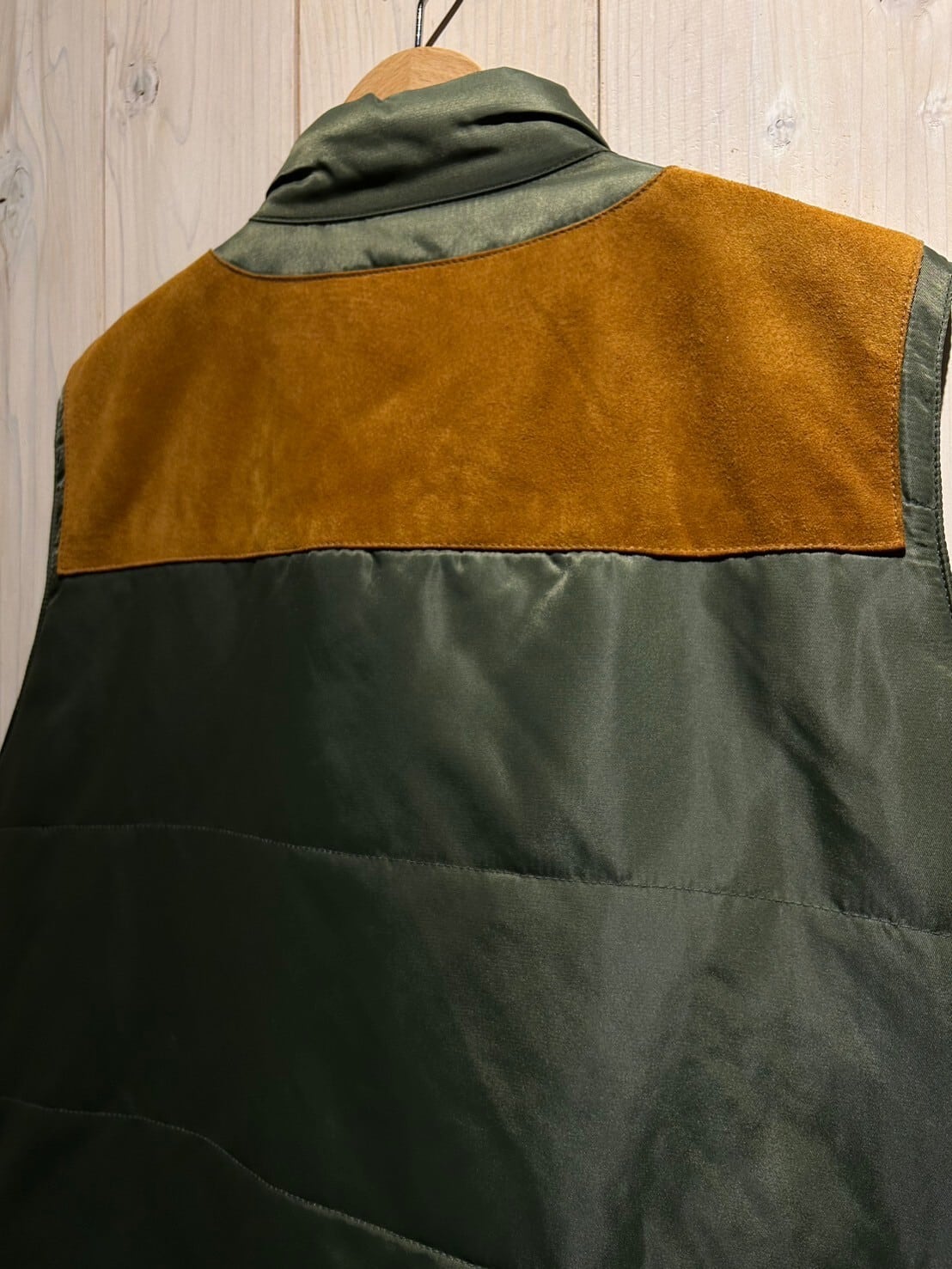 カーキカラーのナイロン素材のパデットベストに、しっとりと柔らかなスエードレザーベストをレイヤードしたかのようなユニークかつヴィンテージならではのデザインアプローチによって生み出されたスペシャルな1着。