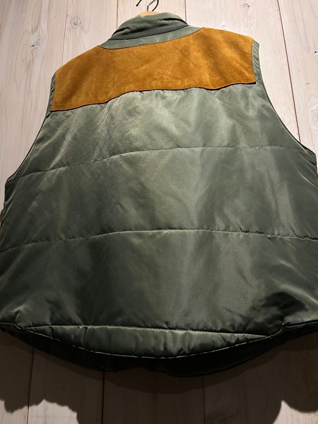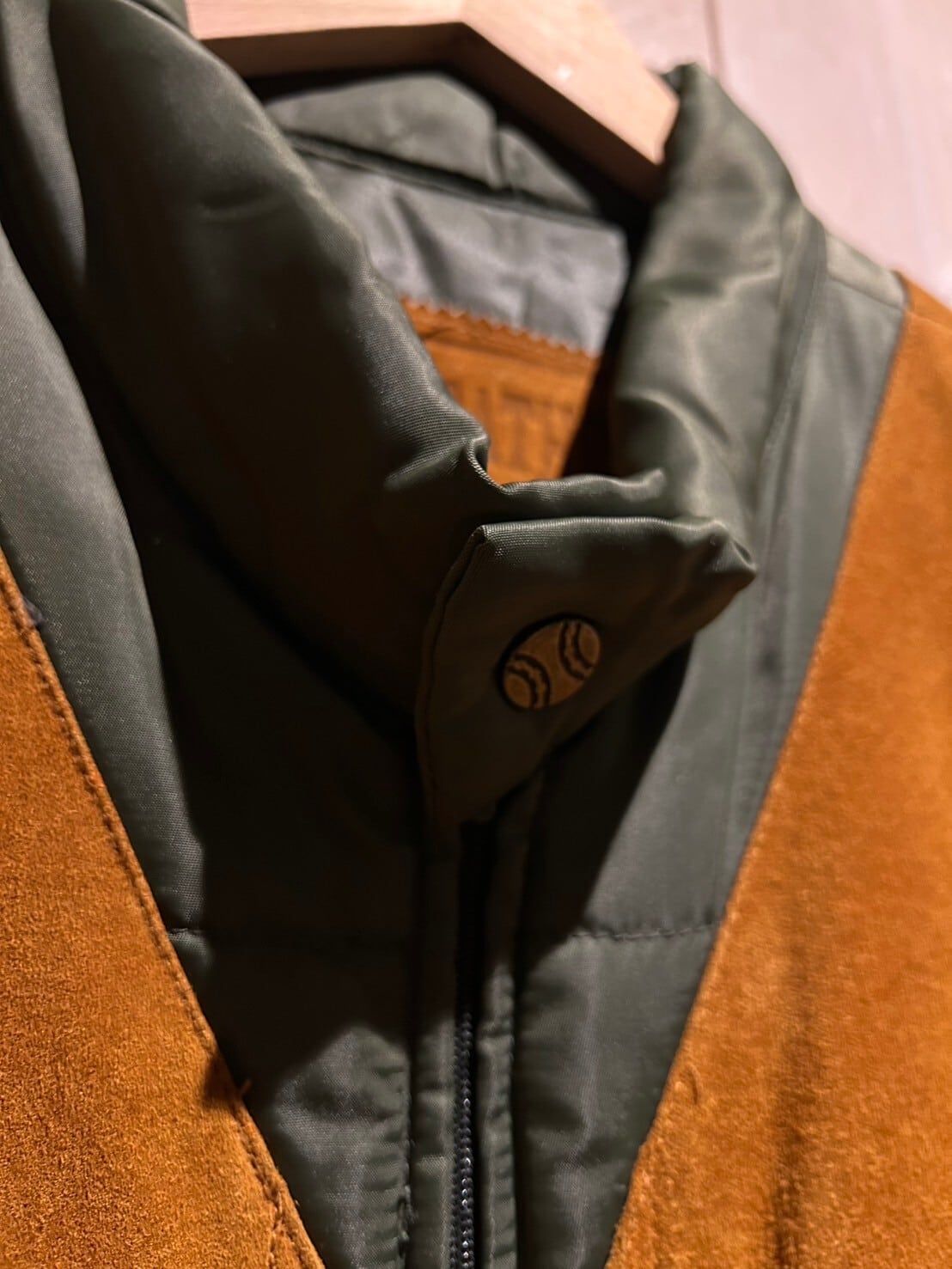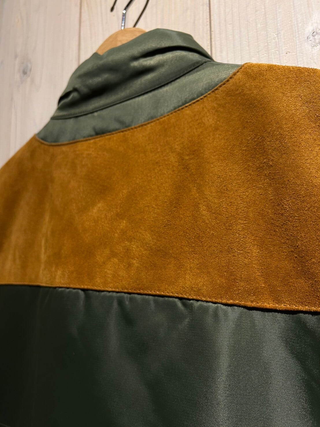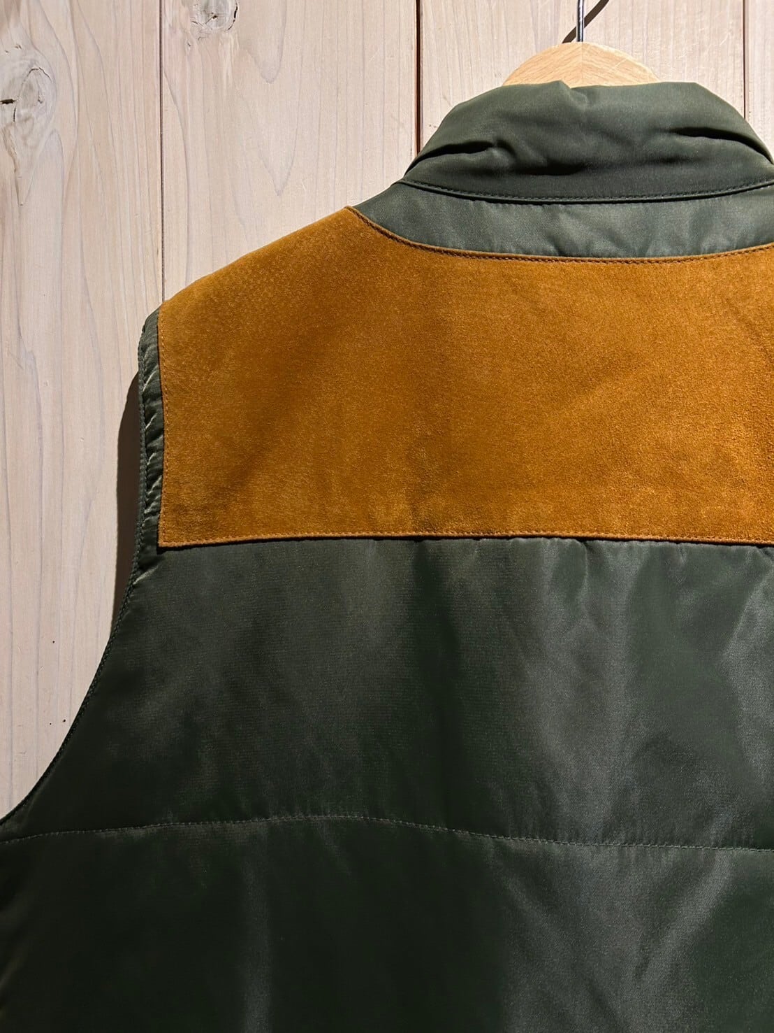 カーキカラーのナイロン素材のパデットベストに、しっとりと柔らかなスエードレザーベストをレイヤードしたかのようなユニークかつヴィンテージならではのデザインアプローチによって生み出されたスペシャルな1着。