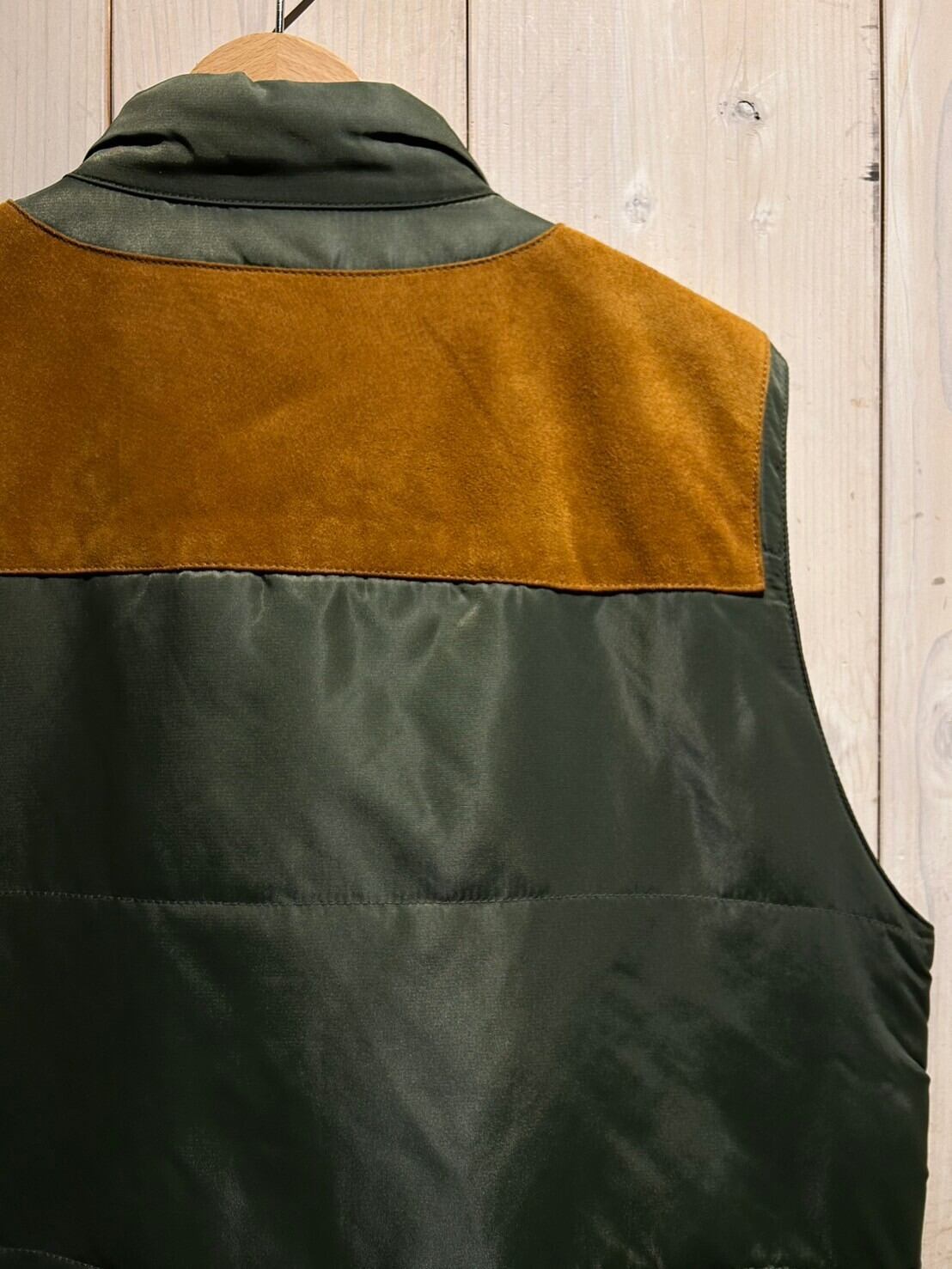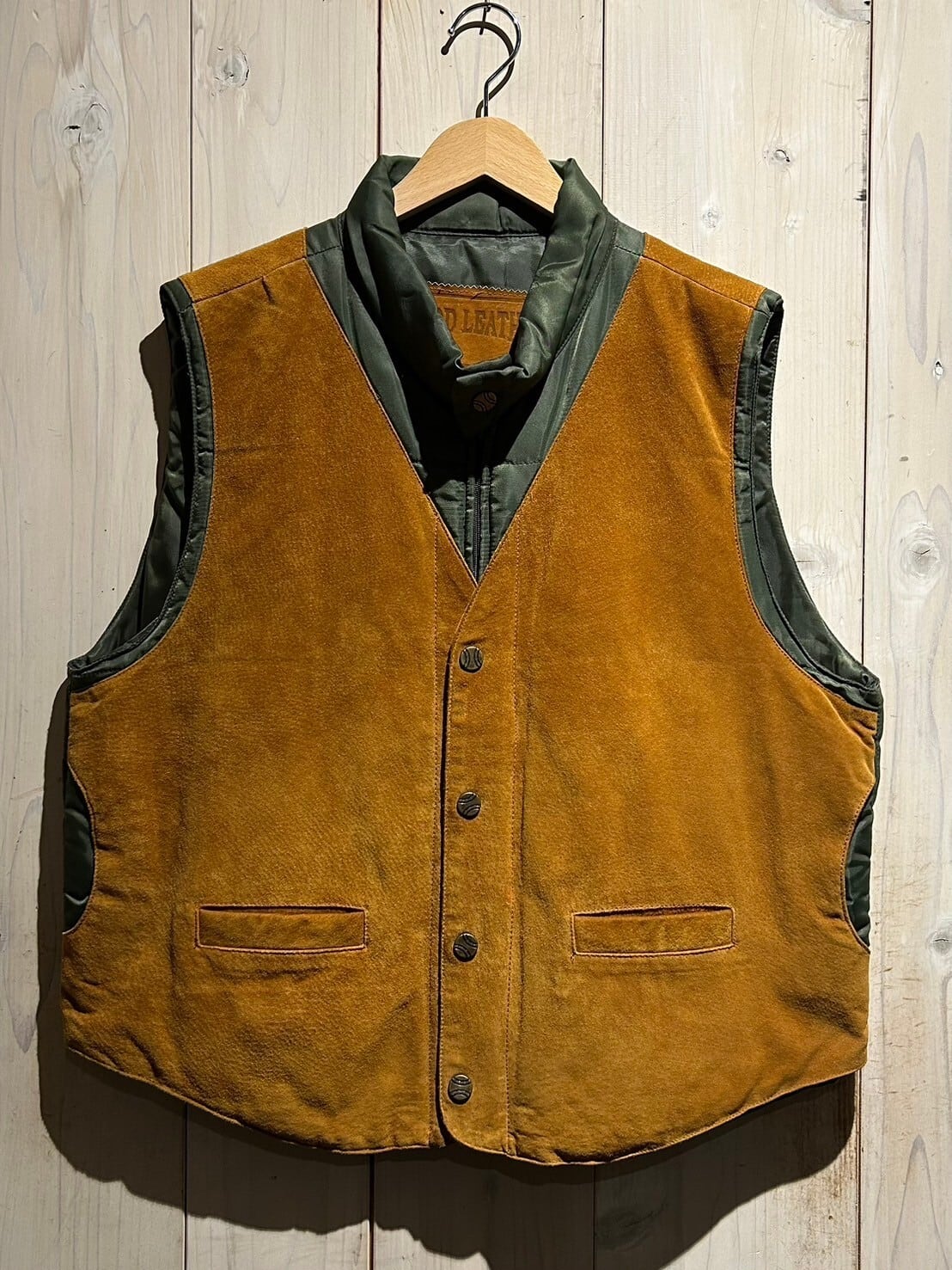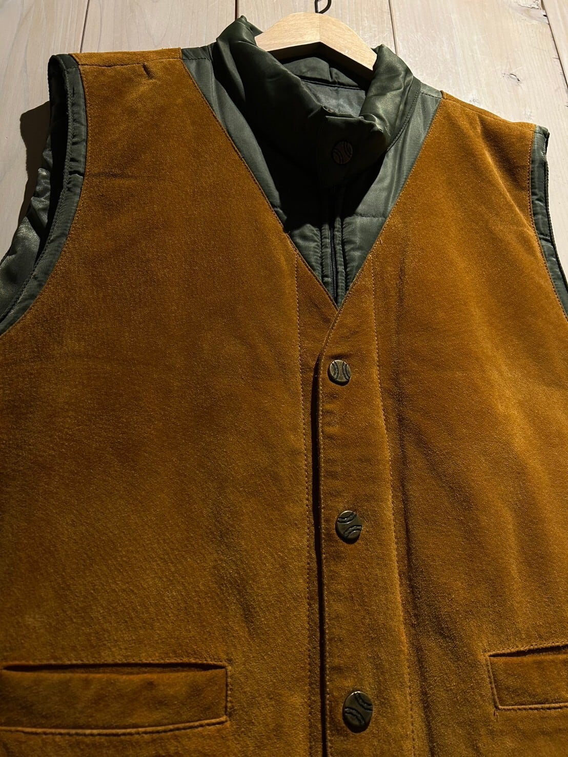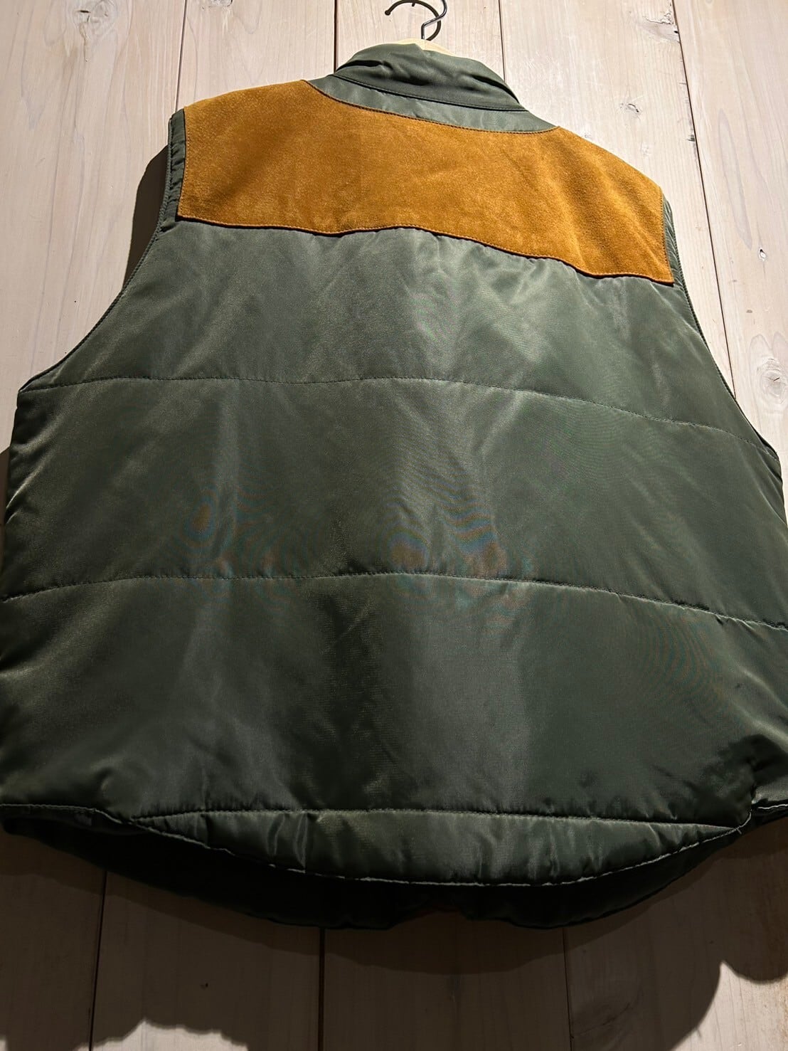 カーキカラーのナイロン素材のパデットベストに、しっとりと柔らかなスエードレザーベストをレイヤードしたかのようなユニークかつヴィンテージならではのデザインアプローチによって生み出されたスペシャルな1着。