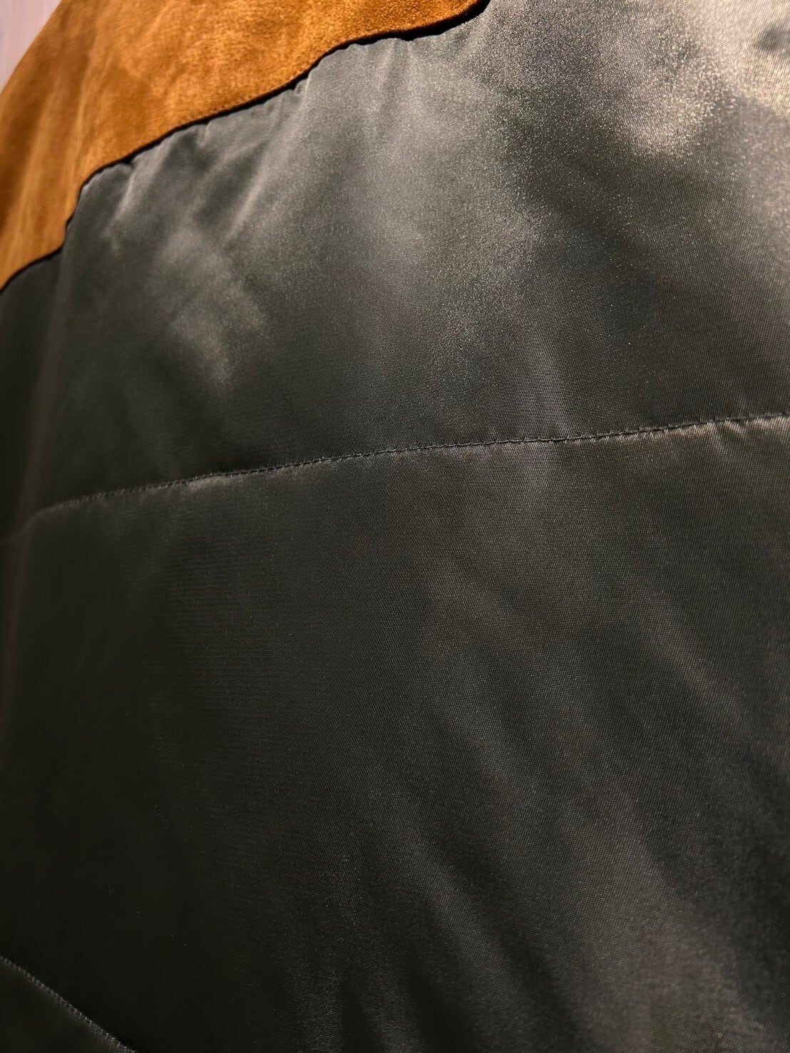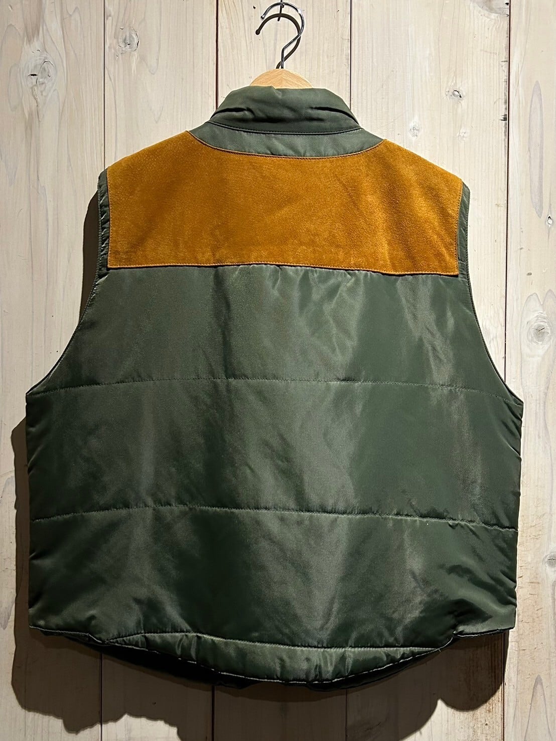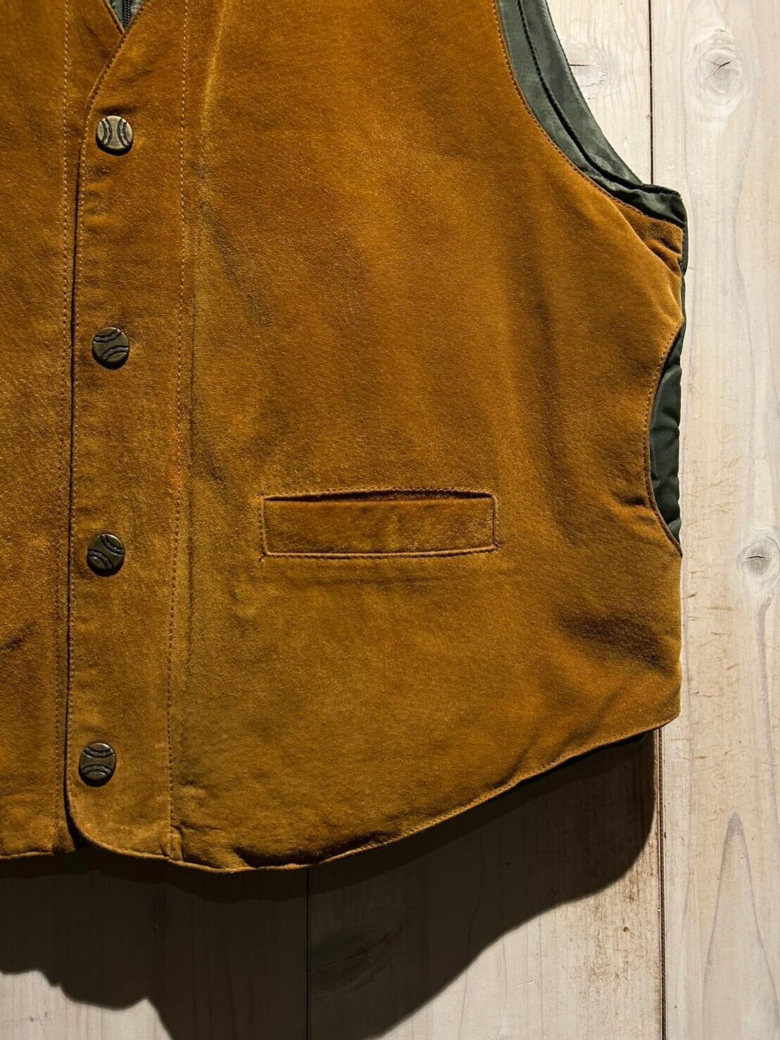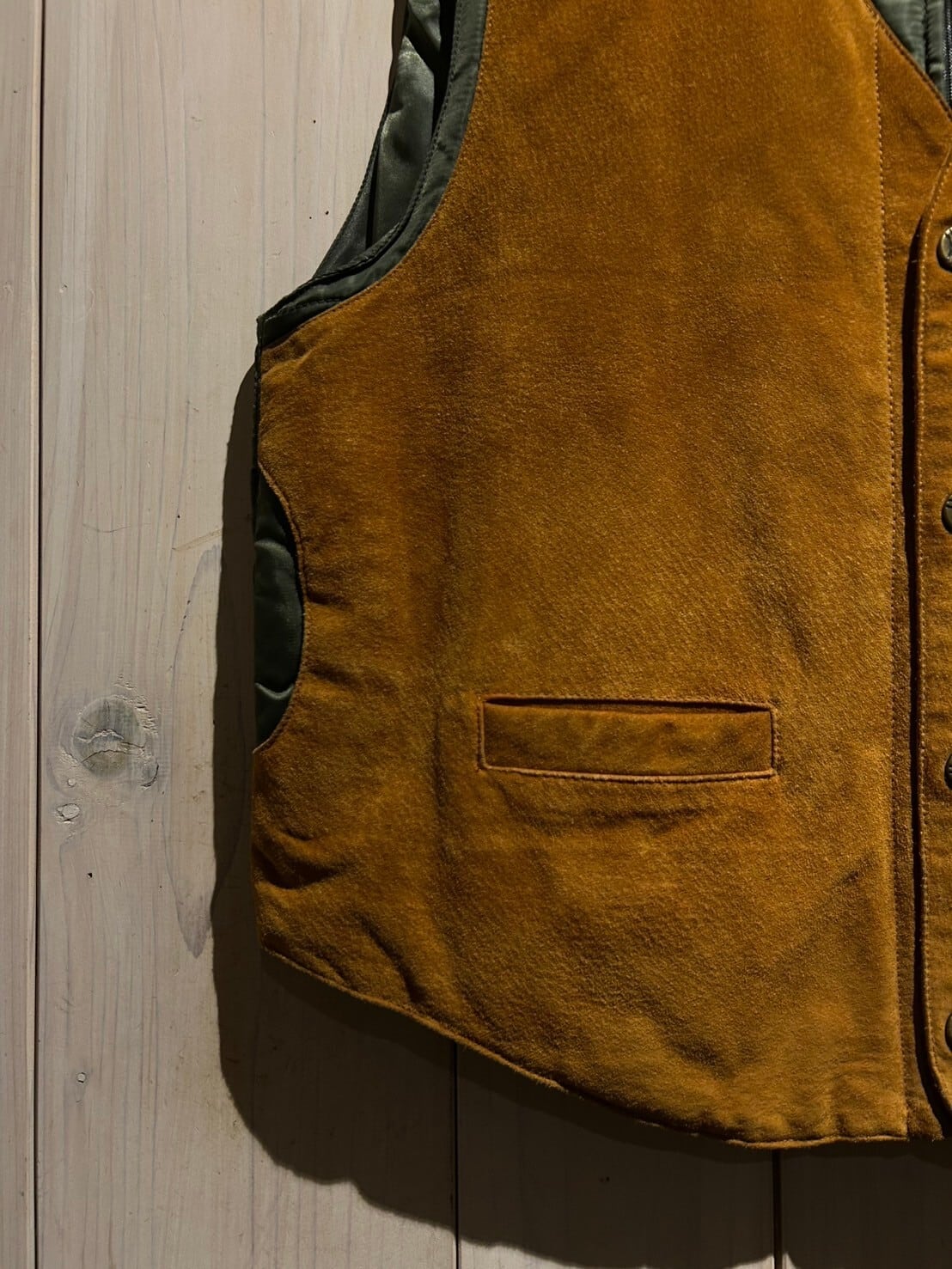 カーキカラーのナイロン素材のパデットベストに、しっとりと柔らかなスエードレザーベストをレイヤードしたかのようなユニークかつヴィンテージならではのデザインアプローチによって生み出されたスペシャルな1着。