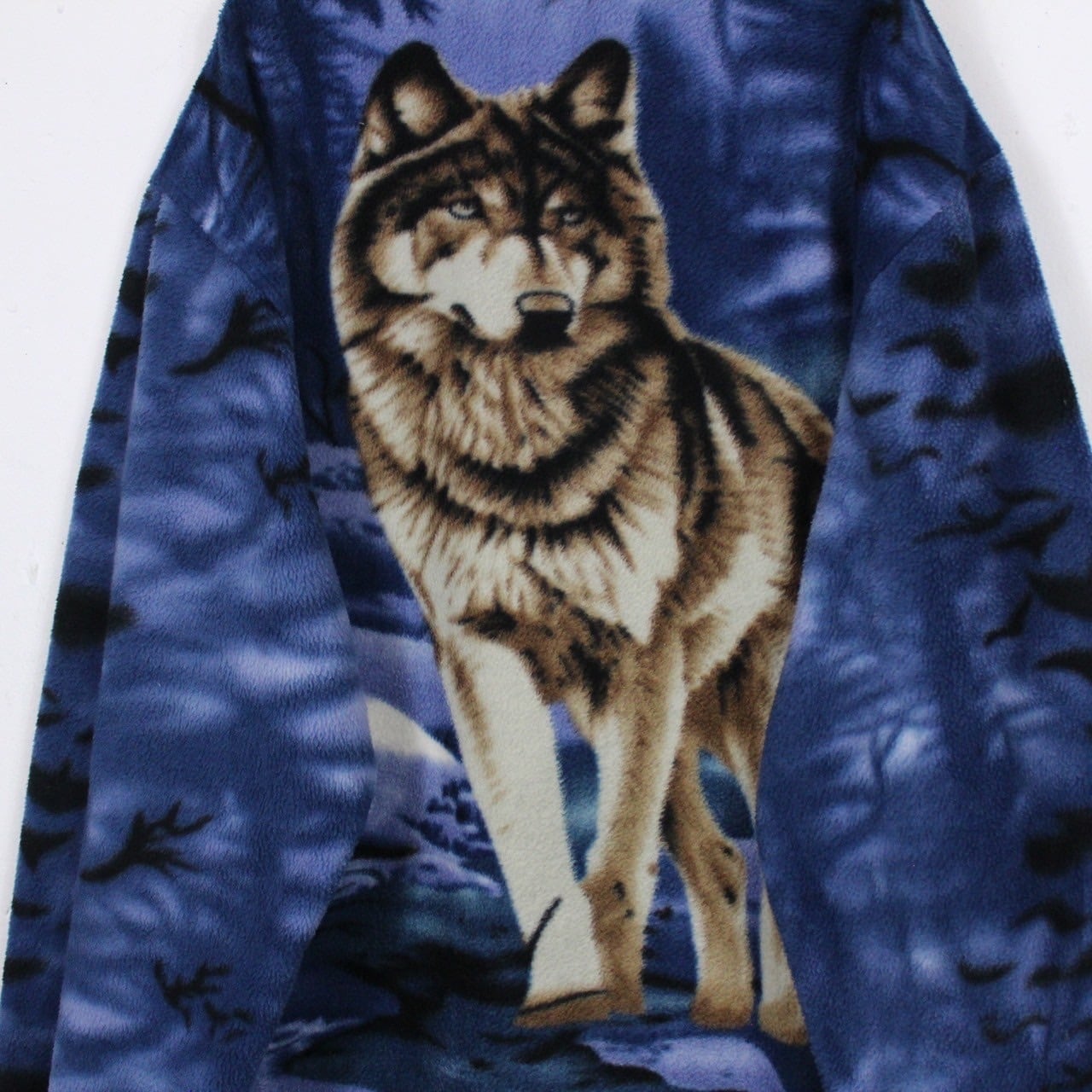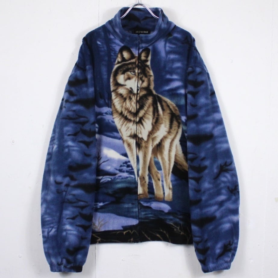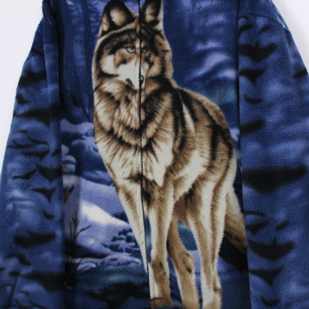 雪の積もる山を背景に、凛々しい表情のオオカミを配した1着。悠然な表情、佇まいが巧妙に映し出されています。