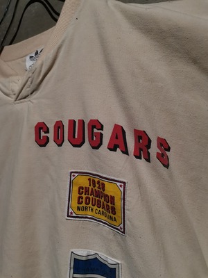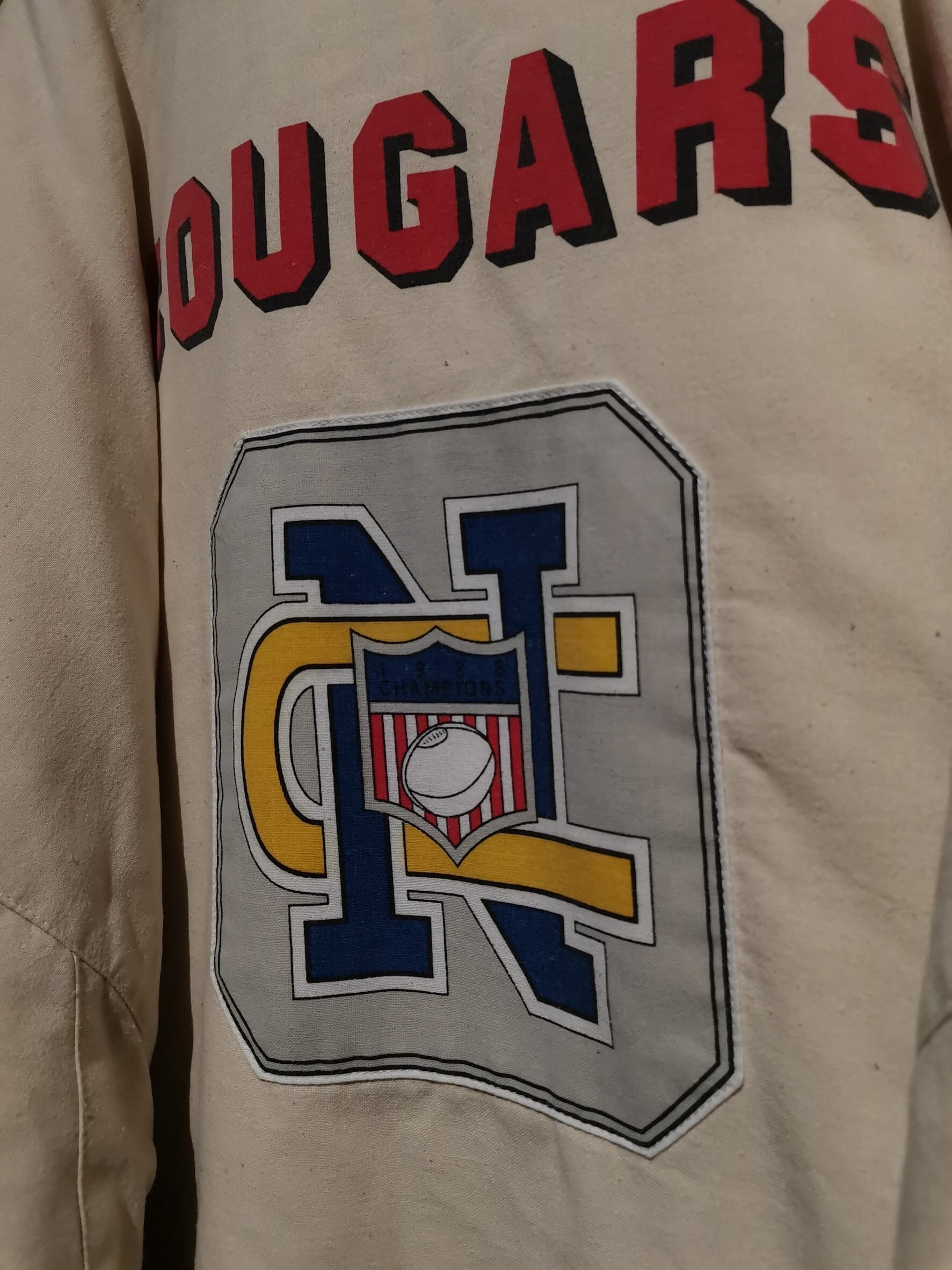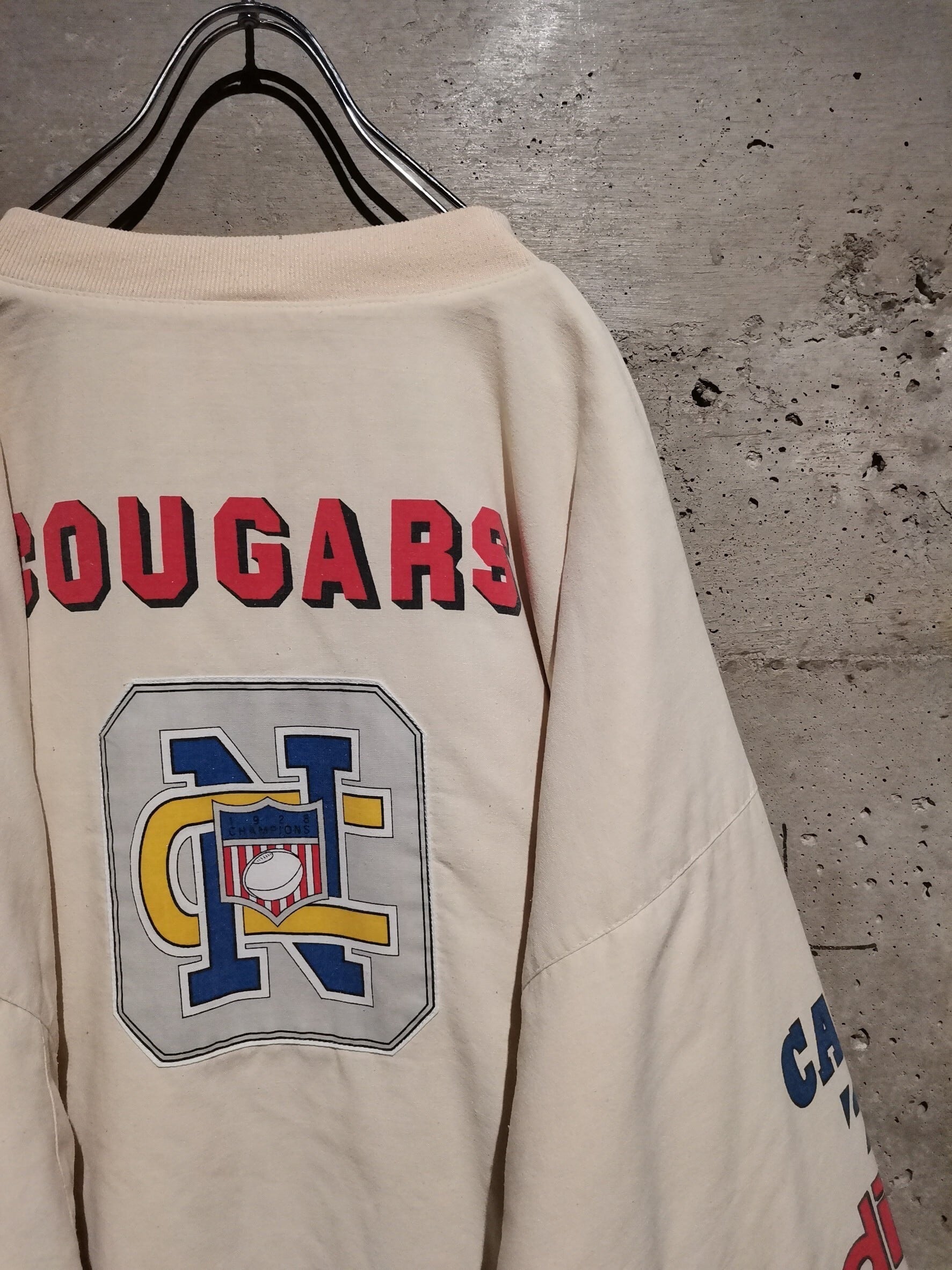 サラッとした生成り色のボディをベースに、アメフトチームのエンブレム等をプリント×パッチによって載せた稀有なパデッドプルオーバー。