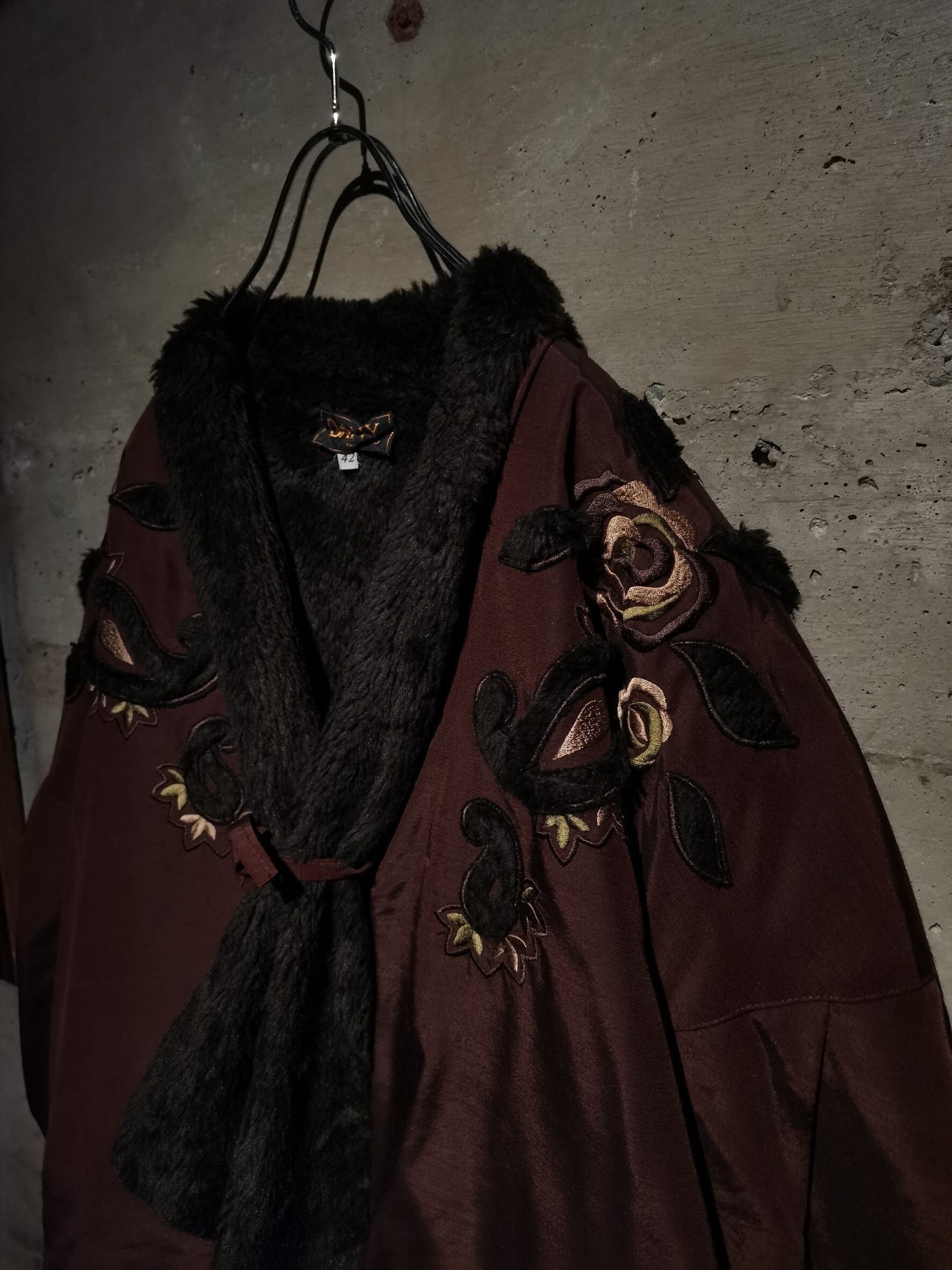 もふもふのボア素材を裏地に配した、サラッとしたコットン地のボディに、ペイズリー柄や刺繍による花柄を施した1着。