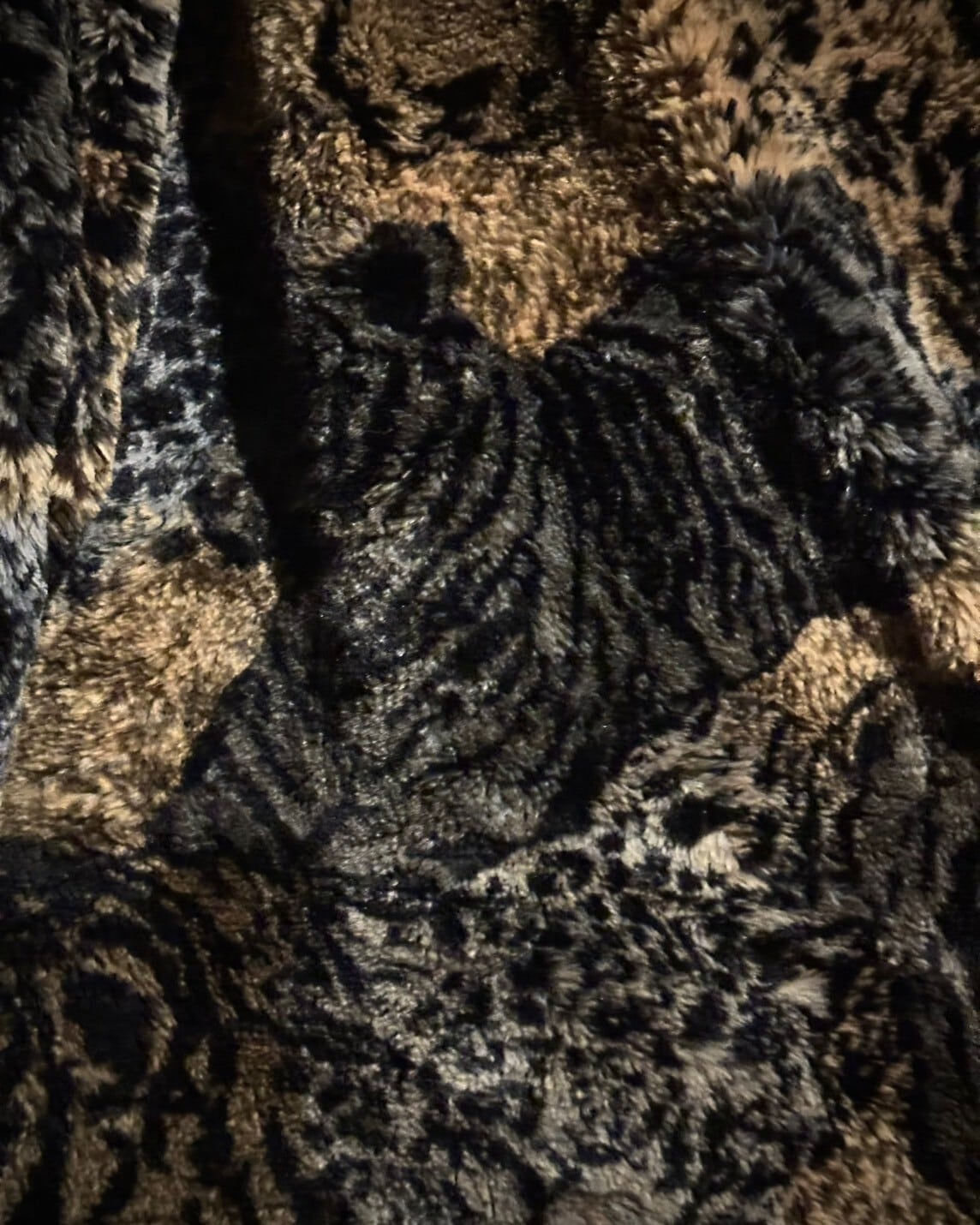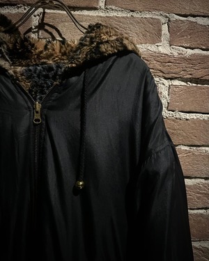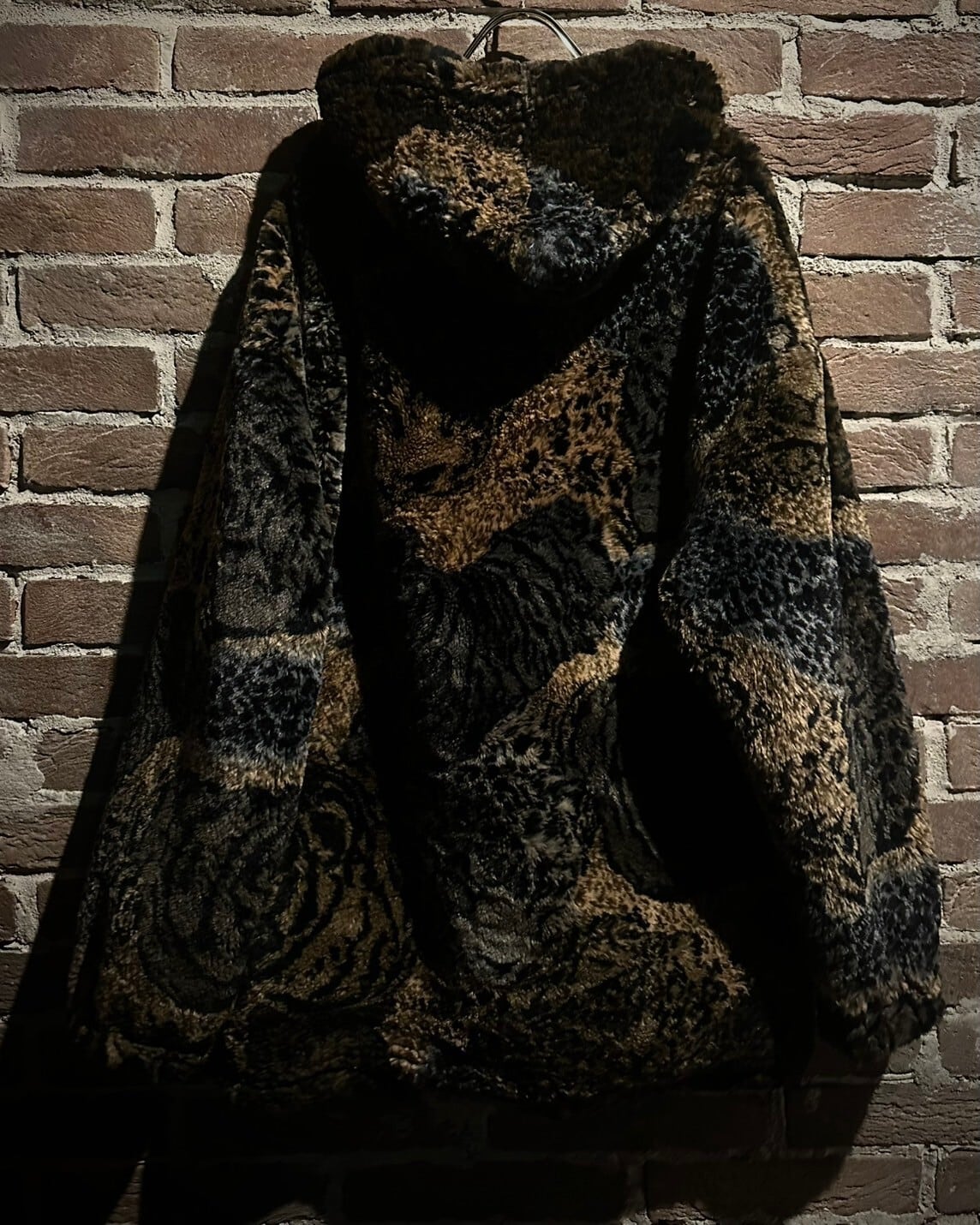 表面はモフッと柔らかなファーにタイガーパターンを載せ、裏返すとソリッドなブラックのナイロン面へと切り替わる、稀有なリバーシブル仕様のフーディジャケット。