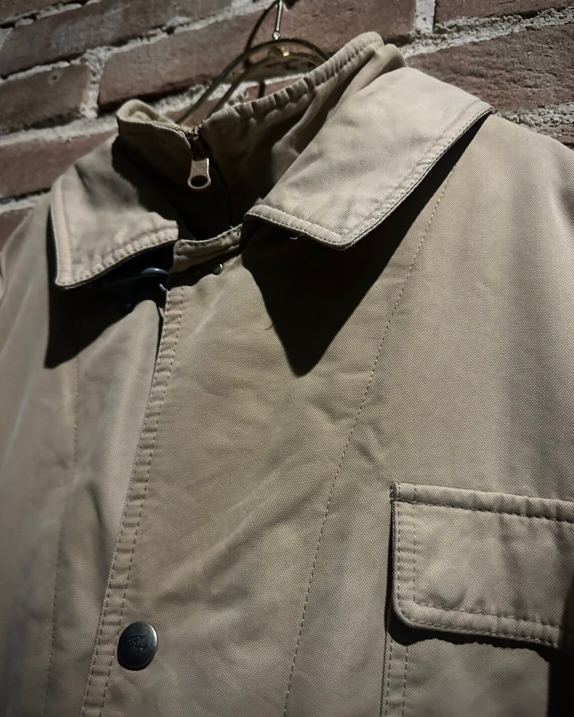 ガシッとタフなダック地を用いたボディに、大ぶりなフラップポケット、ジップポケットをON。首元はハイネックのインナーを仕込んだような、レイヤード風のデザインに仕上げたジャケット。
