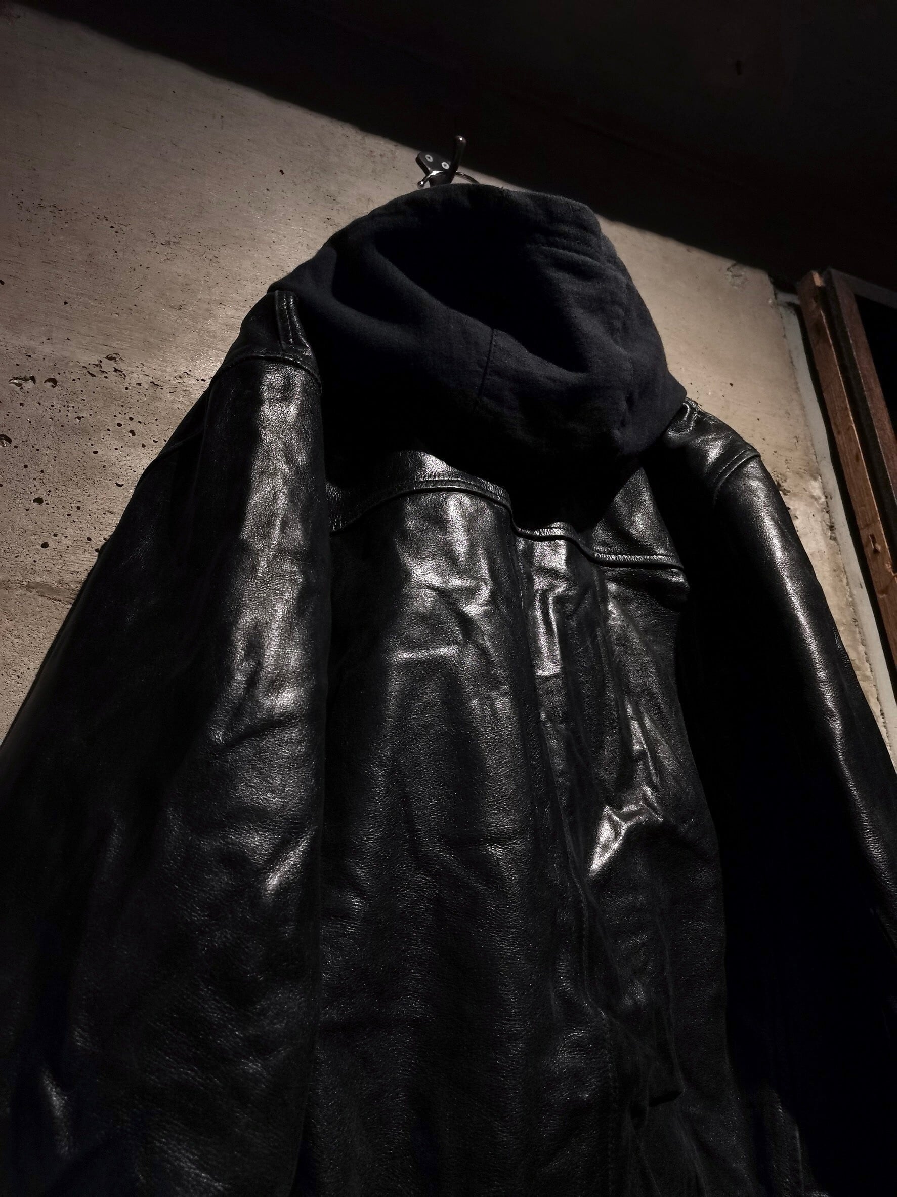 パリッとハリのあるブラックのレザーを使用したジャケットの中に、ブラックのフーディーをドッキングさせたレザージャケット。
