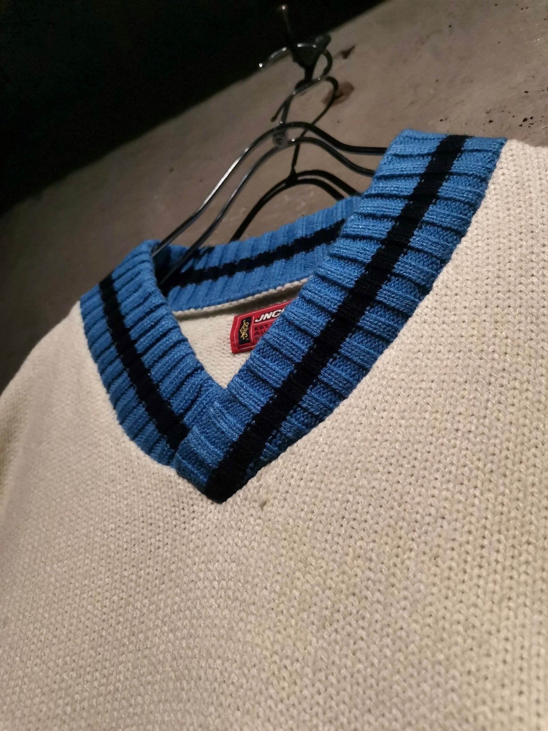 白のボディをベースに、水色×黒のラインを切り替え、フロントにブランドロゴの刺繍を刻み込んだVネックニット。