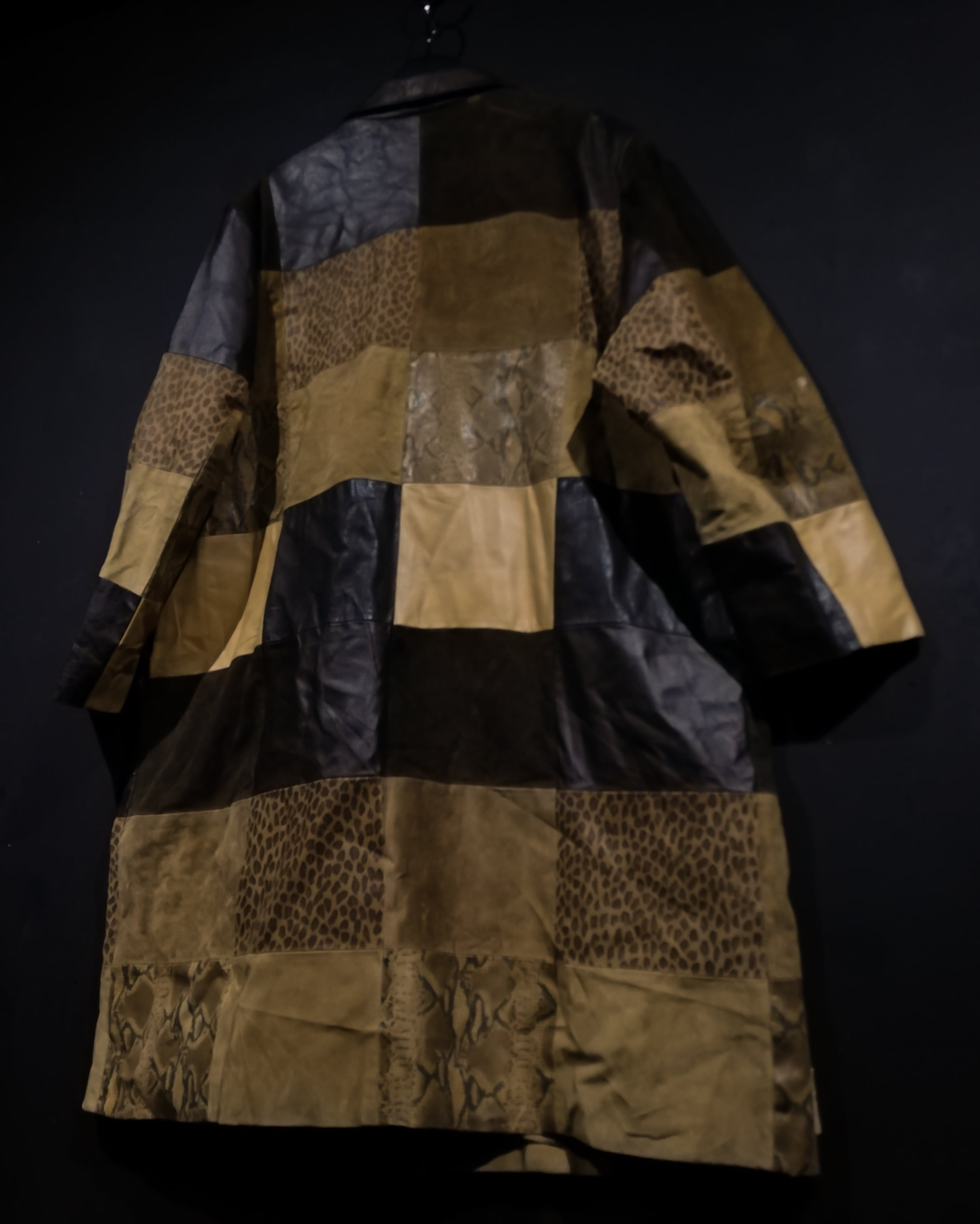パイソン、クロコダイル等のエキゾチックレザーをパッチワークのようにマルチに切り替えたレザーコート。カラーバランスが素晴らしく、アースカラーをベースによりインパクト抜群な印象ながら、まとまりのある見栄えに。