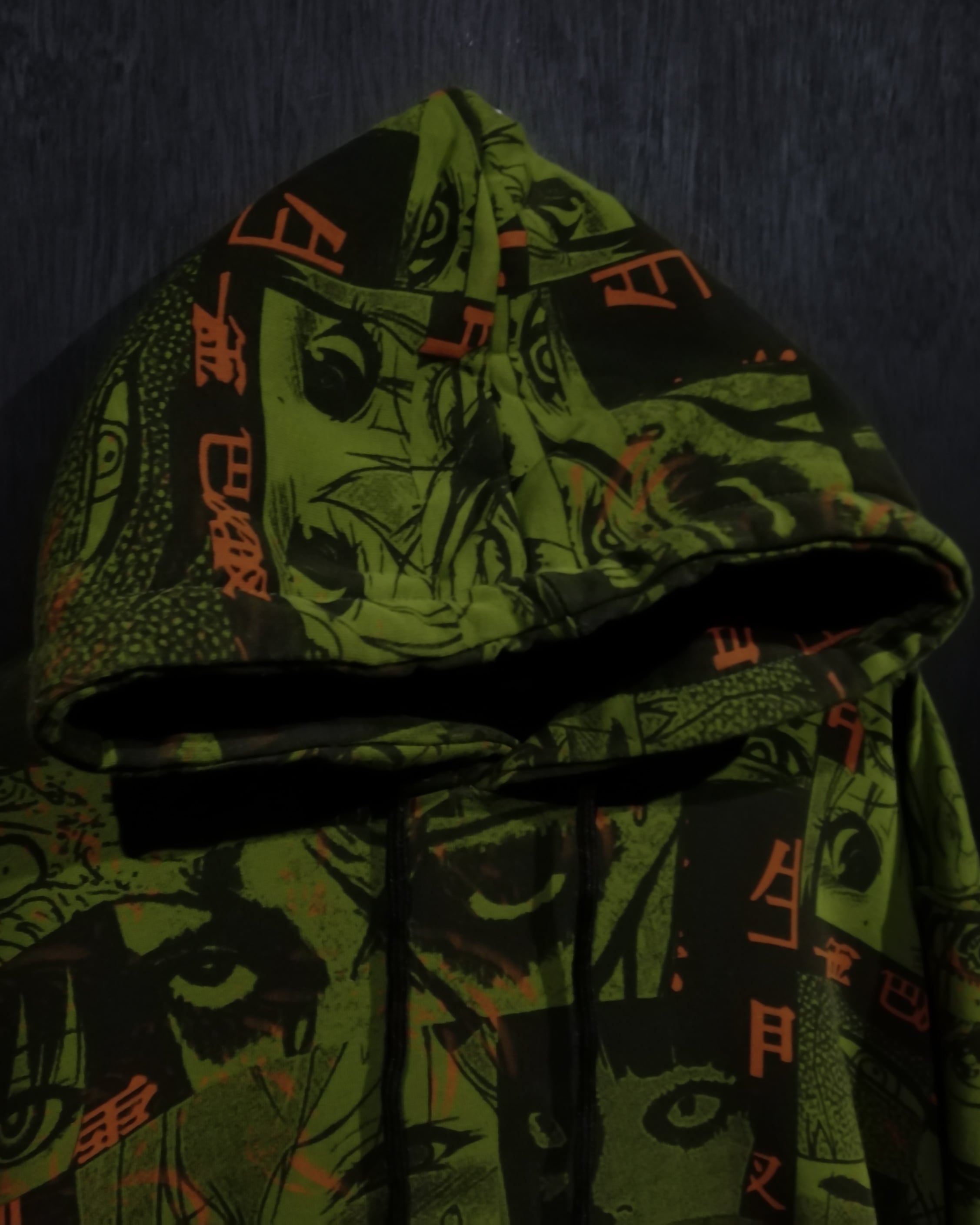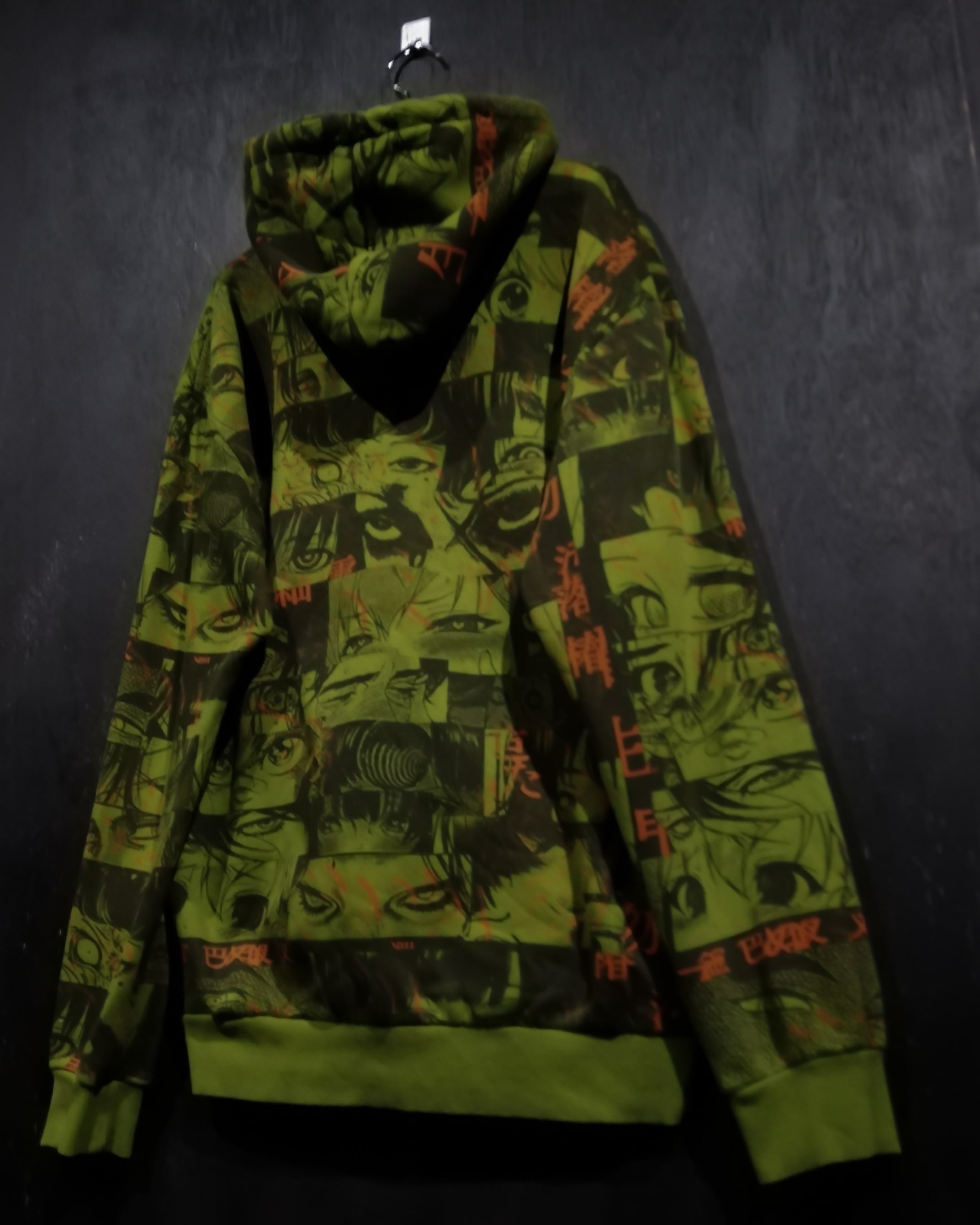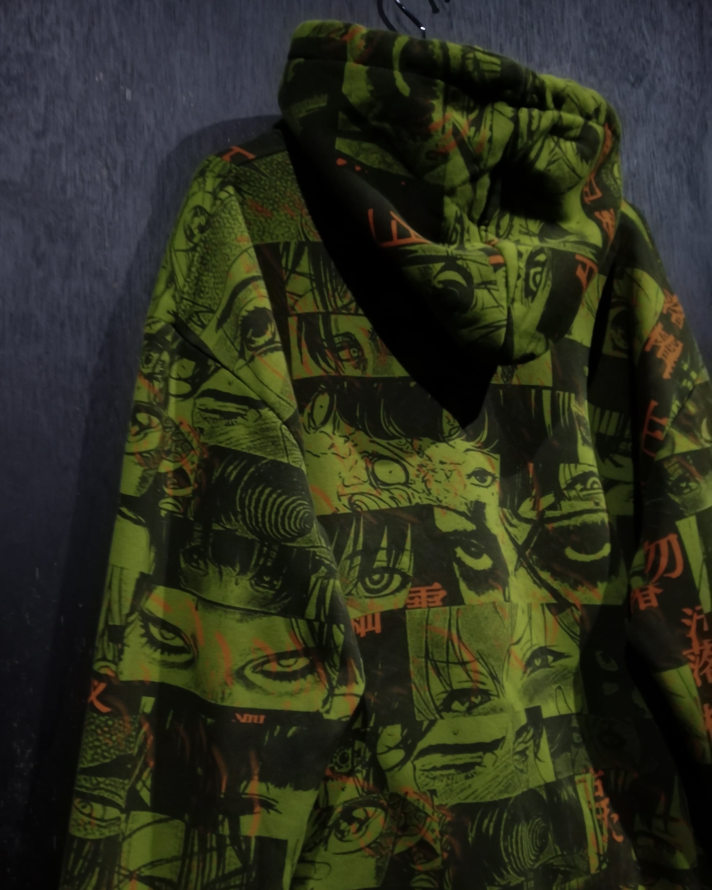 緑のボディに様々なマンガのキャラクターの目元を無数に切り替えたスウェットフーディー。海外で作られたアイテムですが、日本のカルチャーが載った、ファッションの面白さが詰まった1着です。