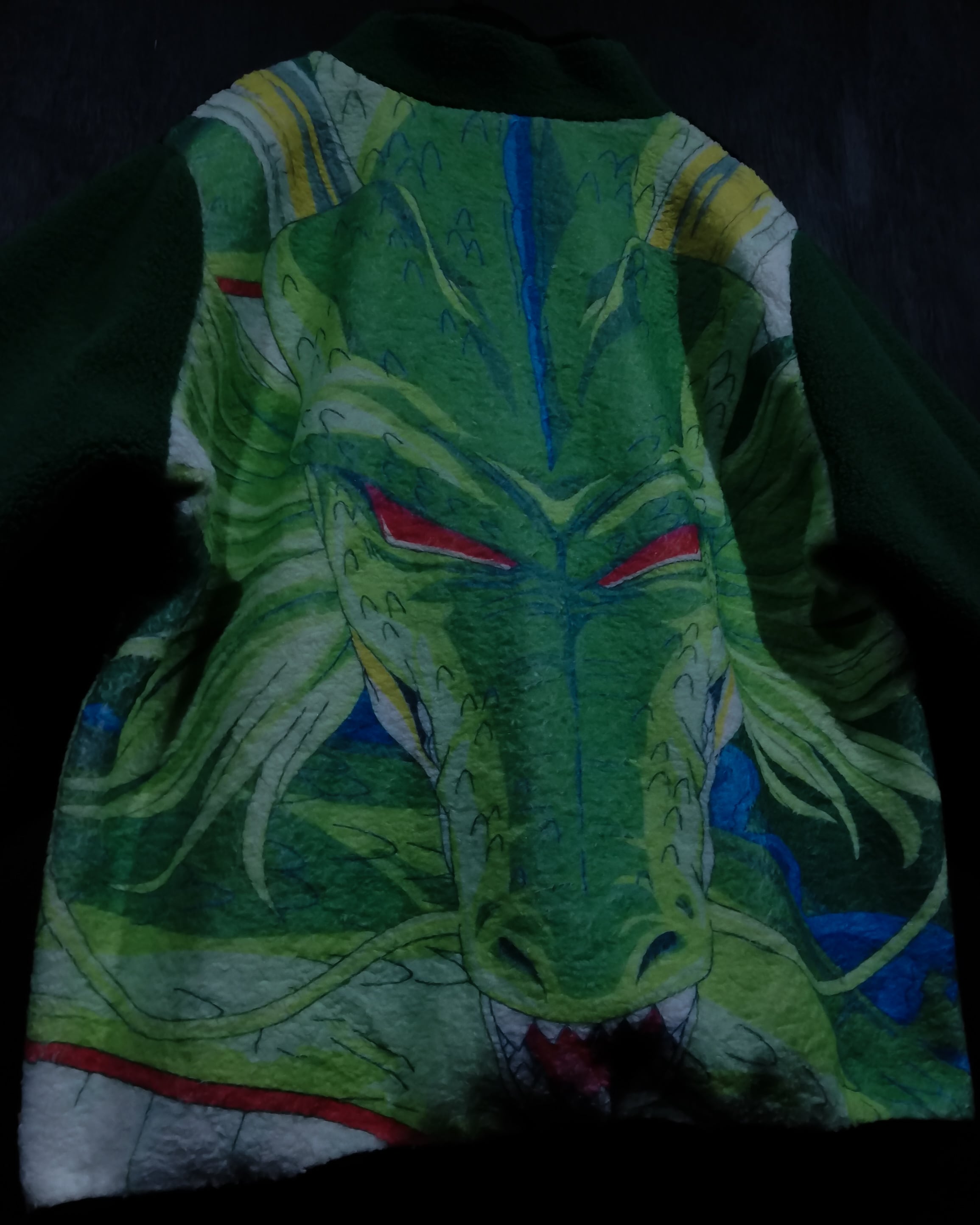 今回ご紹介しますのは、緑のフリースボディのバックにドカンと神龍を載せた1着。ドラゴンボールのアイテムでフリース素材は希少かと。