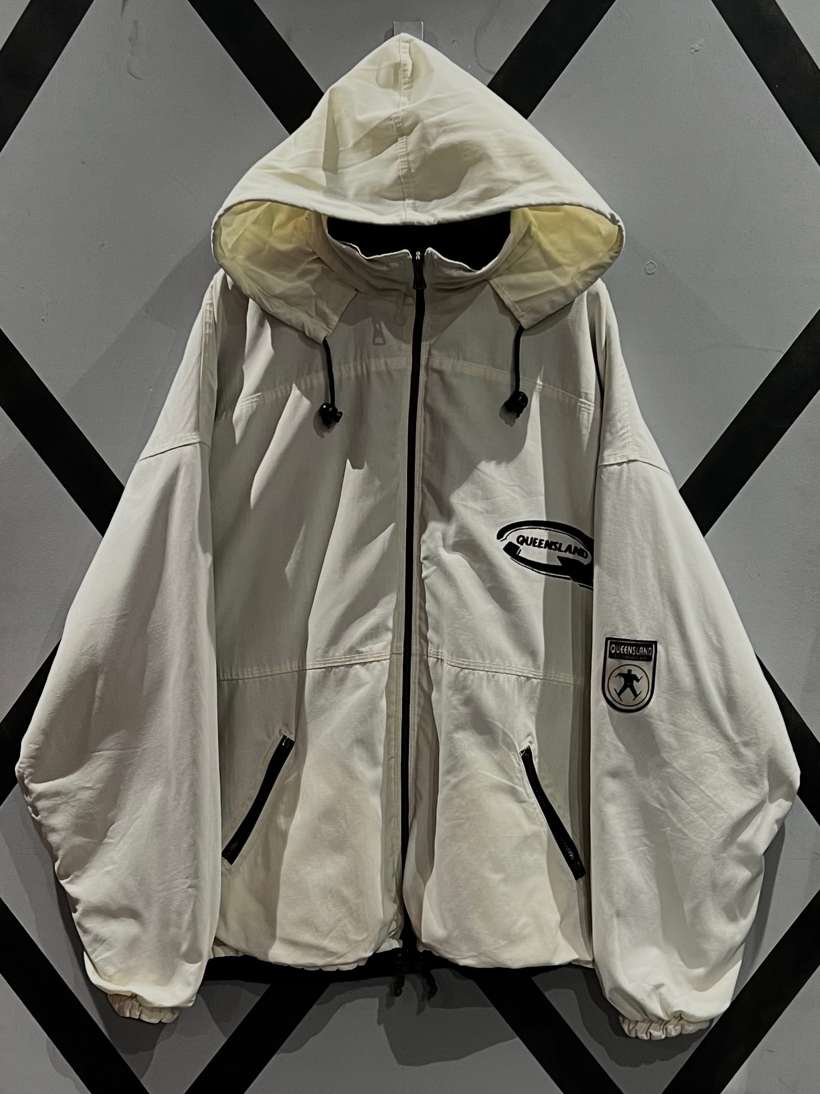 表面にはモフッと柔らかな黒のフリース素材にブランドネームをプリントしたシンプルな仕上がり、ガバッと裏返すとスポーティーなの白のナイロン素材に切り替わり、左胸にブランドネームをフロッキーで施した、リバーシブル仕様のジャケット。ナイロン地の面にのみ備わっているフードも◎