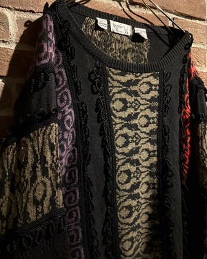 エスニック調の柄をニッティングで表現したボディに、パイピング風の装飾を載せたニット。