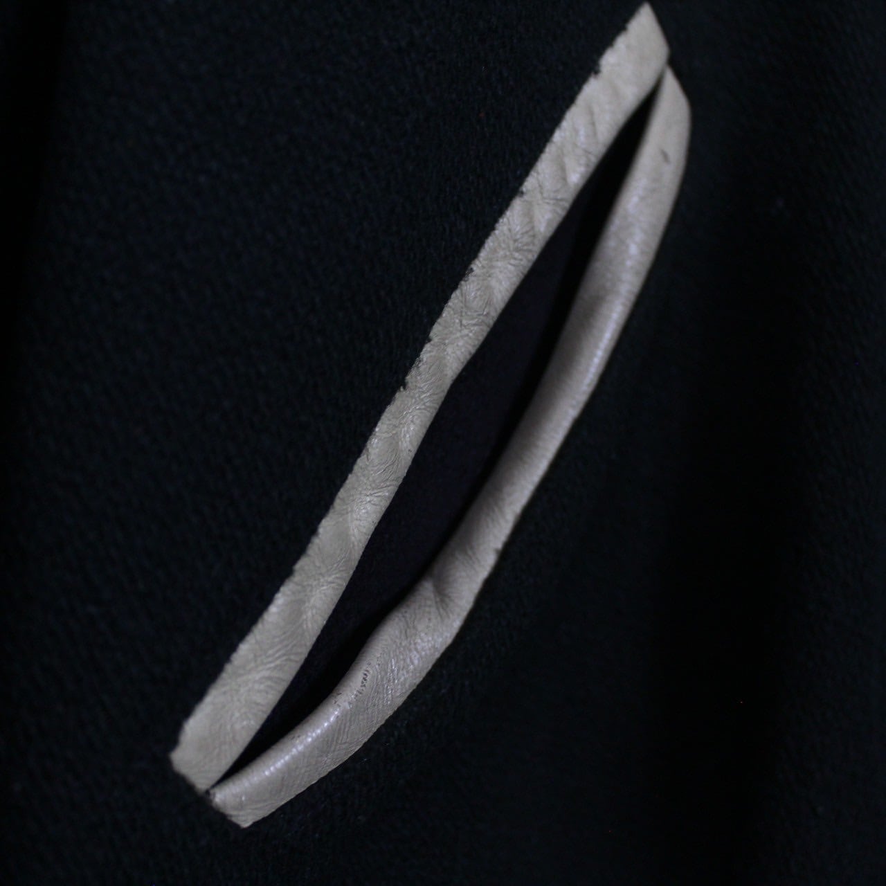 ネイビーのウールボディに、袖にはベージュのレザーを切り替えたスタジャン。両胸にはレタリングデザイン、背面にも起毛感のあるシェニールワッペンを施した1着。
