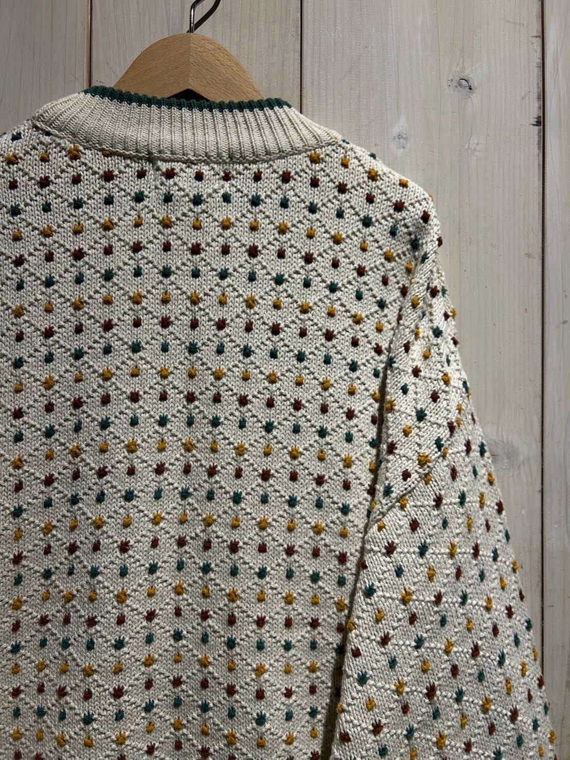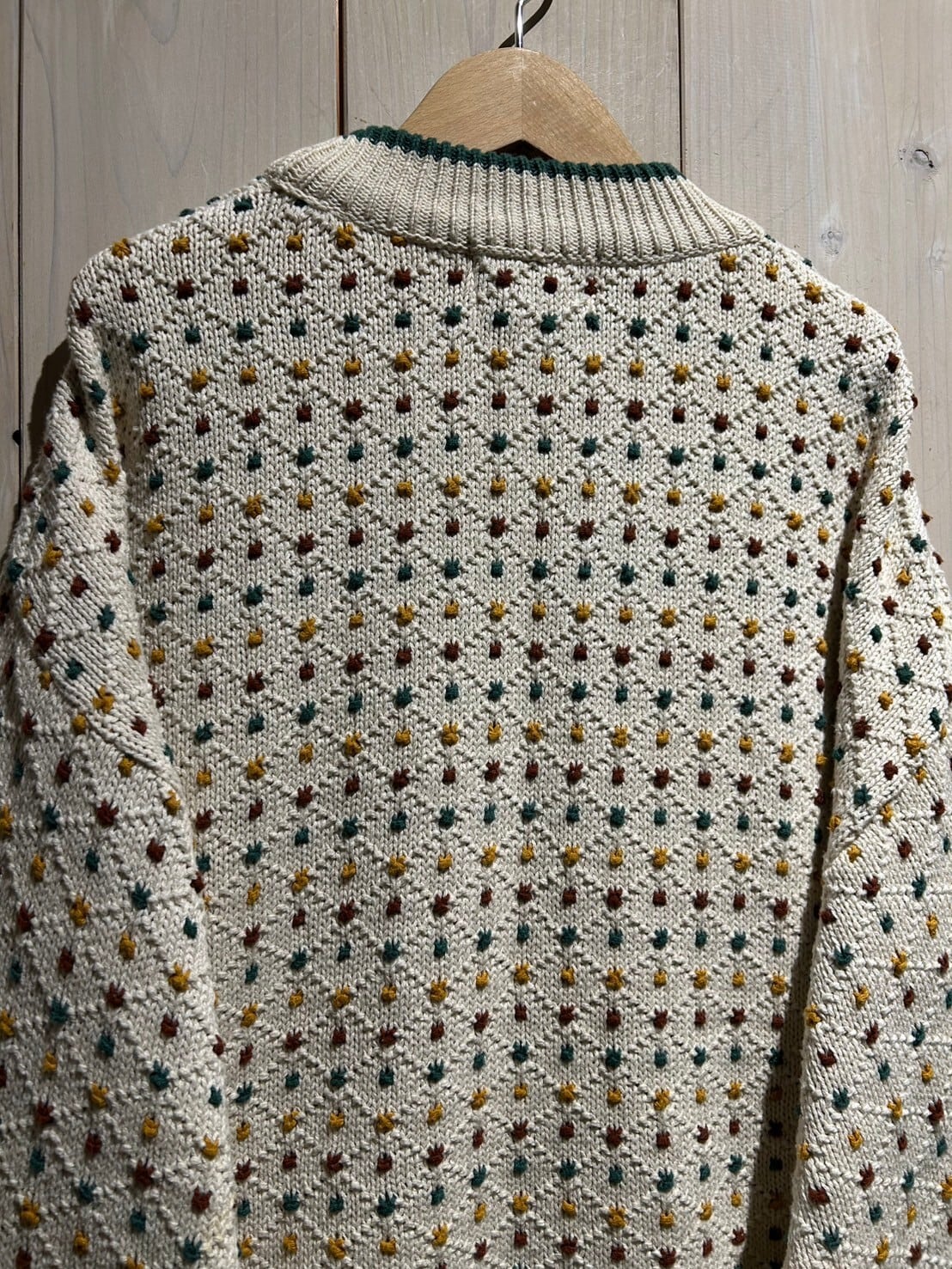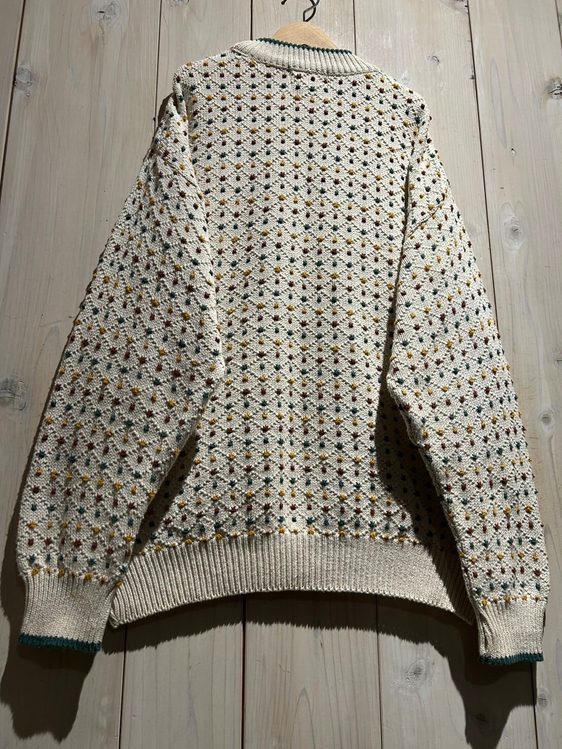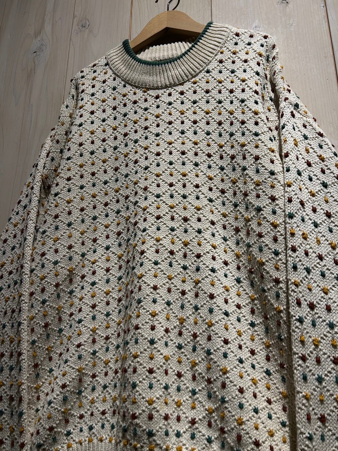 上品なホワイトのカラーリングのニットをベースに、3色のドット柄をを全面に載せたニットセーター。