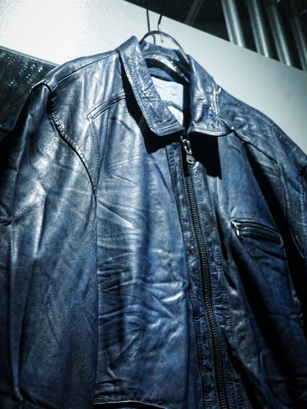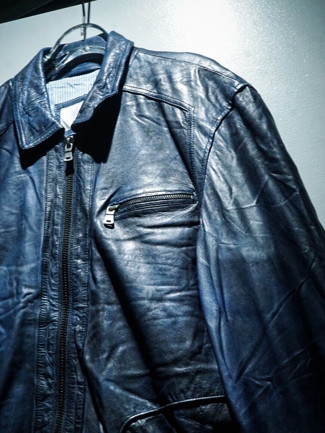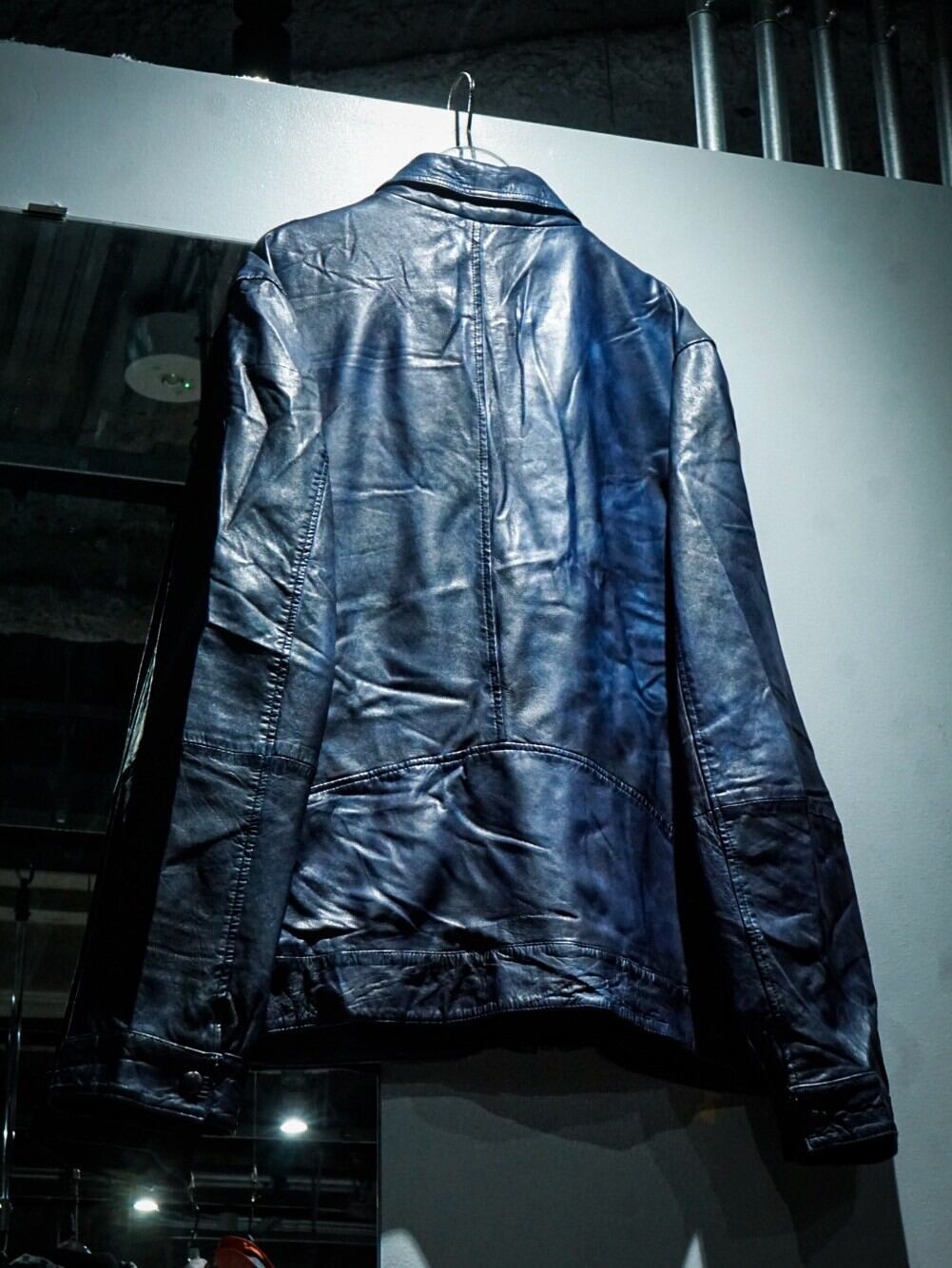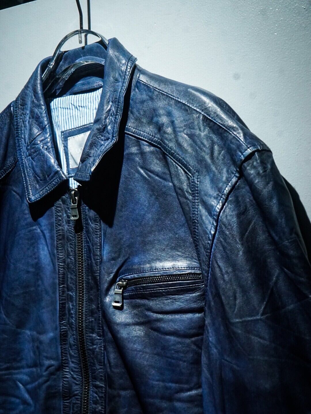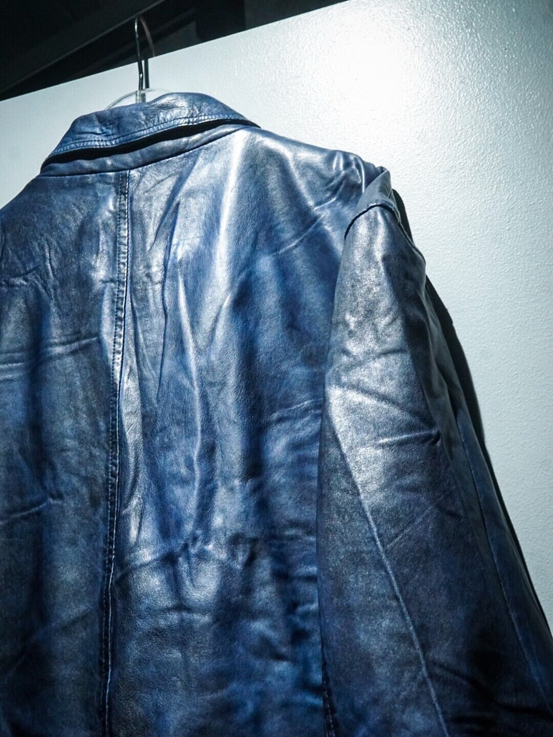 深く渋みのある青のカラーリングで仕上げた上質なレザーを使用したレザージャケット。元のカラーリングも珍しいですが、この色合いから成るフェードの効いた風合いに心惹かれます。