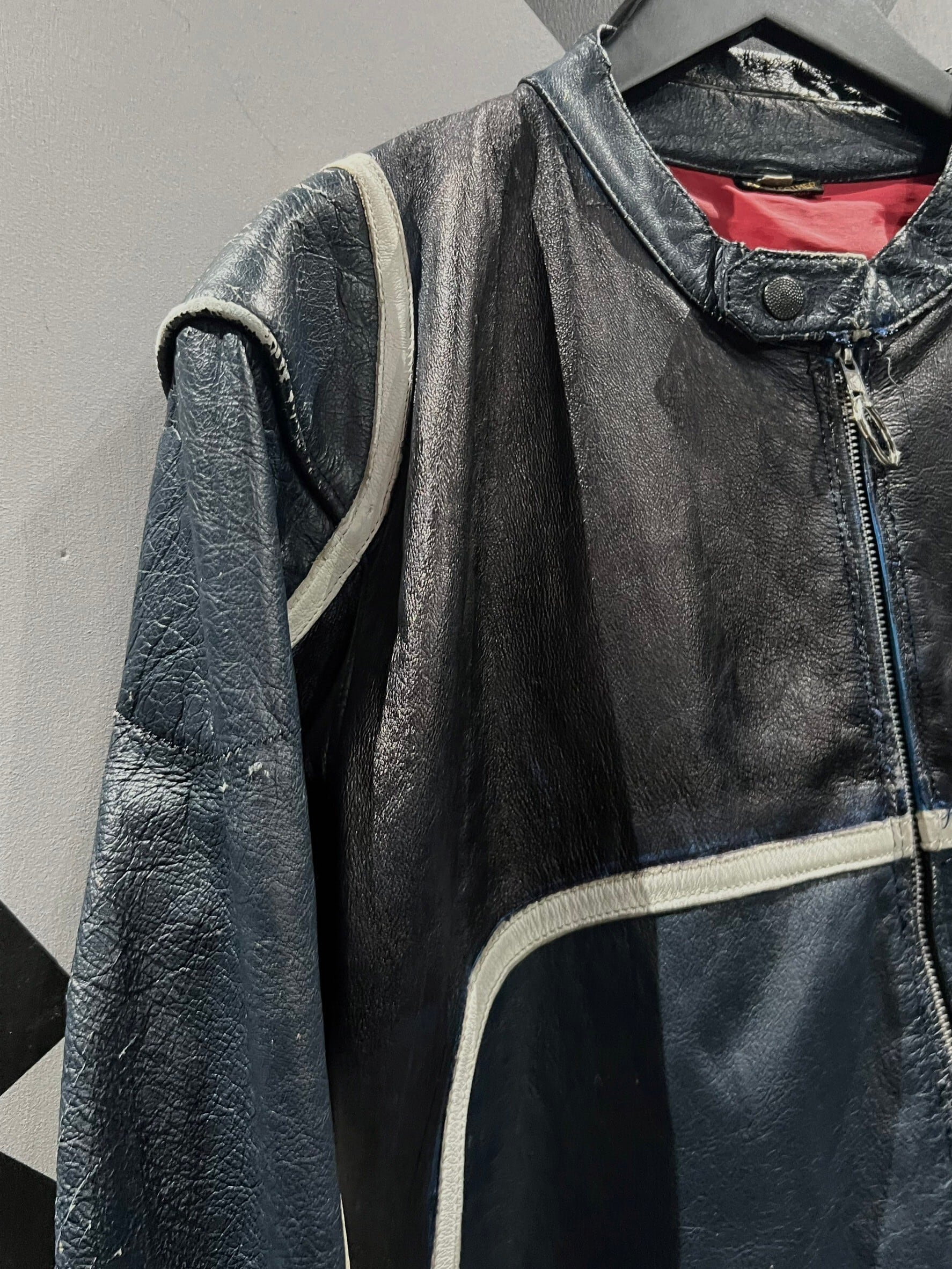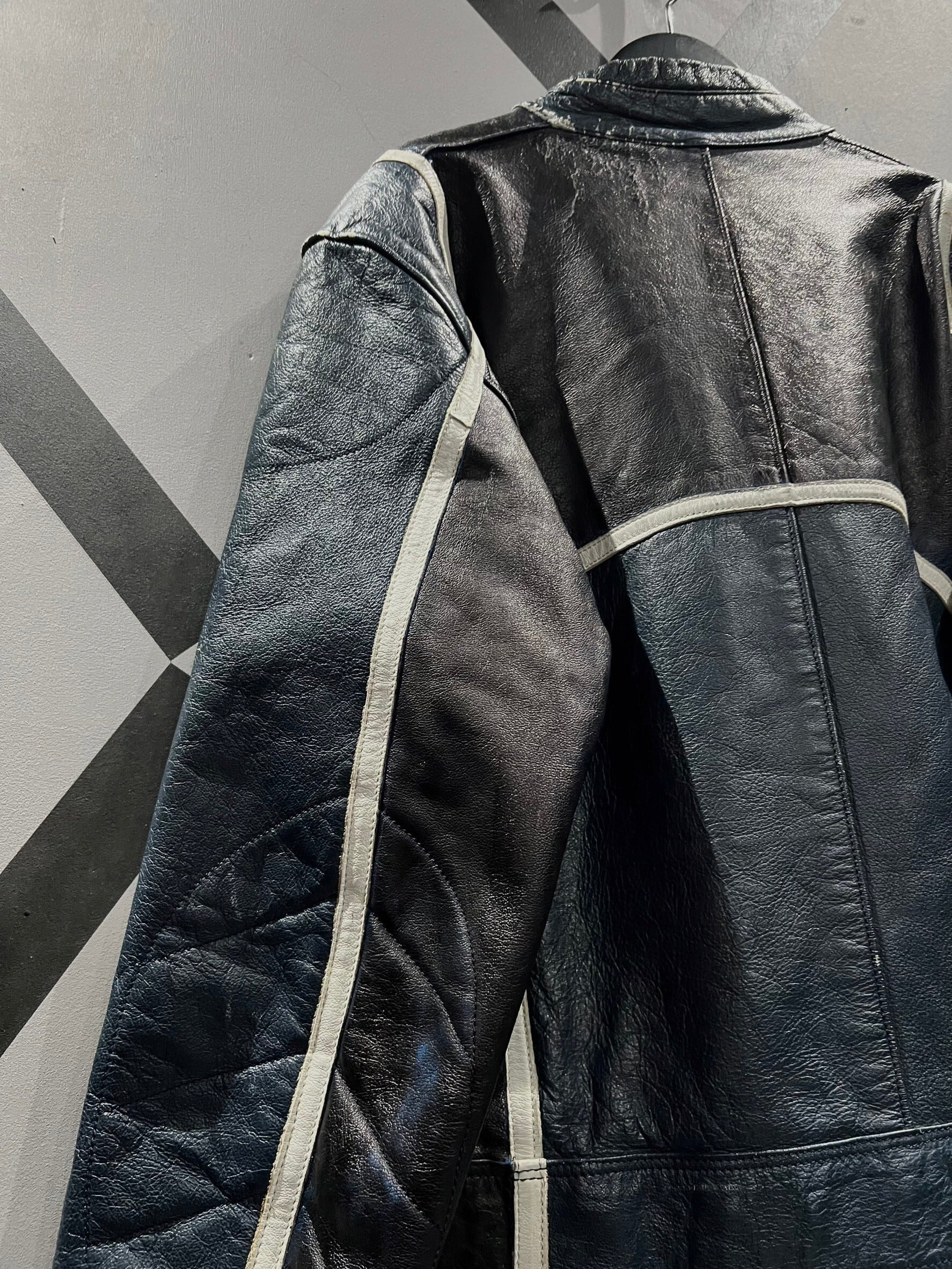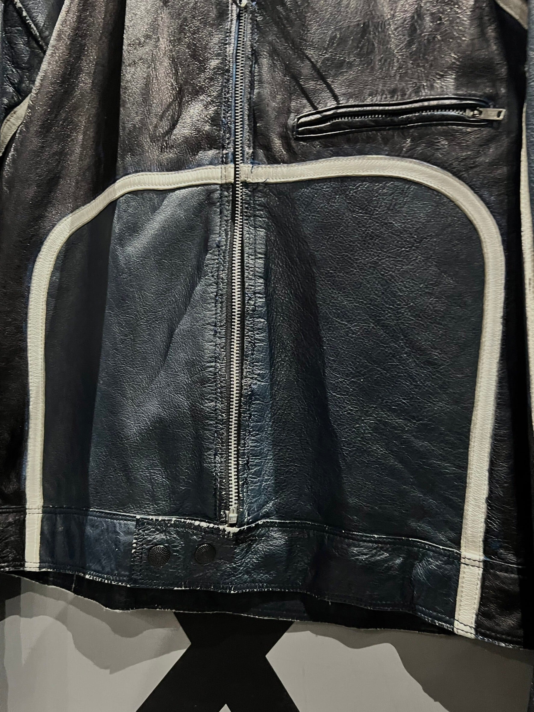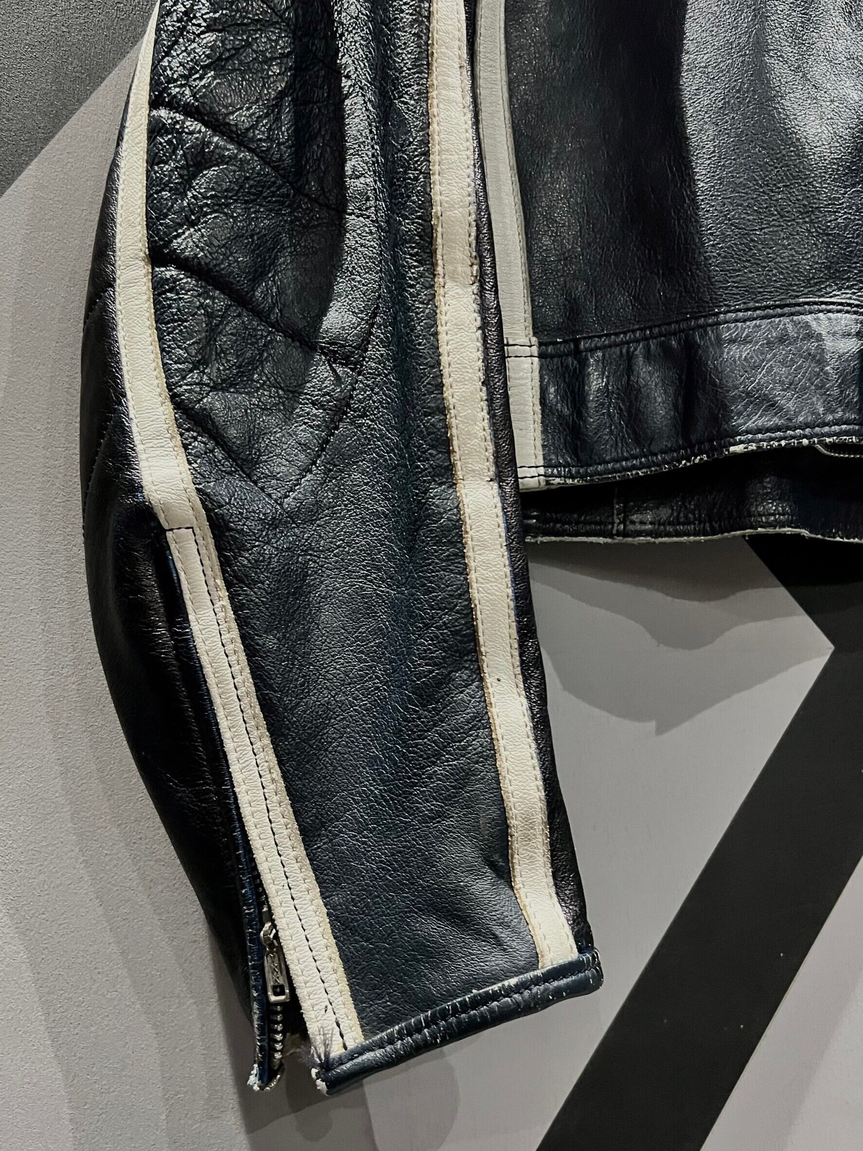 ガシッとしたハリを持ちながらも、しなやかな質感に仕上げられた極上のブラックレザーをベースに、ネイビーと白ラインの切り替えを載せたシングルライダースジャケット。